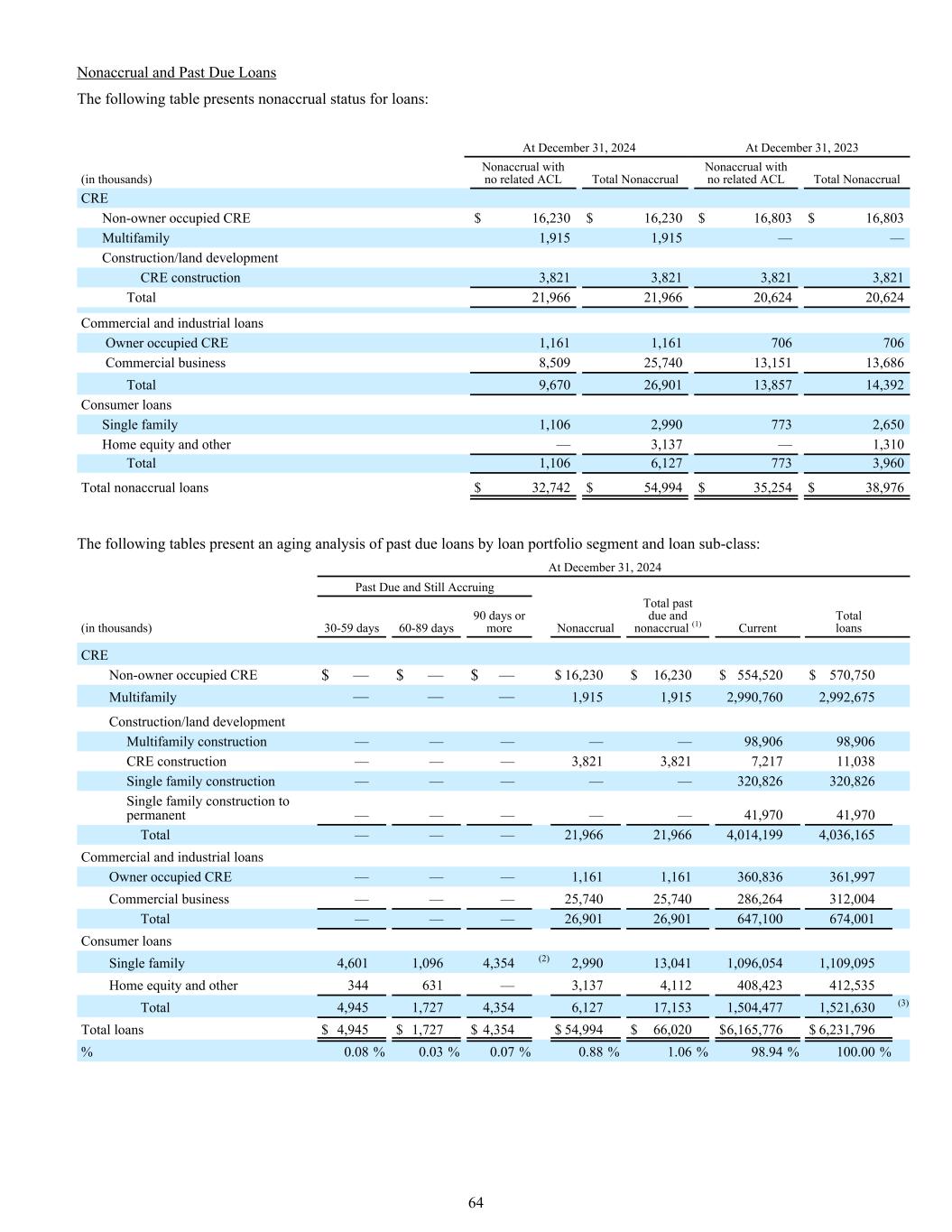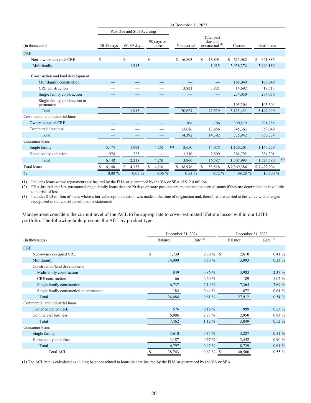 12月31日,2023年逾期和仍应计(千)30-59天60-89天90天以上非应计逾期和非应计总额(1)当前贷款总额CRE非业主占用CRE $ — $ — $ — $ 16,803 $ 16,803 $ 625,082 $ 641,885多户家庭— 1,915 —— 1,9153,938,2743,940,189建筑和土地开发多户建设———— 168,049168,049 CRE建设———— 3,8213,82114,69218,513单户建设———— 274,050274,050单户建设转为永久———— 105,304105,304合计— 1,915 — 20,62422,5395,125,4515,147,990工商业贷款业主占用CRE ———— 706706390,579391,285商业业务———— 13,68613,686345,363359,049合计———— 14,39214,392735,942750,334消费贷款单户5,1741,9934,261(2)2,65014,0781,126,201,140,279房屋净值及其他974225 — 1,3102,509381,792384,301合计6,1482,2184,2613,960165,5871,507,9931,524,580(3)贷款总额$ 6,148 $ 4,133 $ 4,261 $ 38,976 $ 53,518 $ 7,369,386 $ 7,422,904% 0.08% 0.05% 0.06% 0.53% 0.72% 99.28% 100.00%(1)包括其还款由联邦住房管理局投保或由VA或SBA担保的贷款1240万美元。(2)逾期90天或更长时间的FHA保险和VA担保的单户贷款,如果确定几乎没有损失风险,则保持应计状态。(3)包括在发起时作出公允价值选择的130万美元贷款,因此以公允价值列账,变动在我们的综合损益表中确认。管理层认为ACL的当前水平适合覆盖我们LHFI投资组合中的估计生命周期损失。下表按产品类型列示ACL:2024年12月31日12月31日,2023(千)结余率(1)结余率(1)CRE非自住CRE $ 1,7390.30% $ 2,6100.41%多户家庭14,9090.50% 13,0930.33%建筑/土地开发多户家庭建筑8490.86% 3,9832.37% CRE建筑660.60% 1891.02%单户家庭建筑6,7372.10% 7,3652.69%单户家庭建筑至永久1840.44% 6720.64%合计24,4840.61% 27,9120.54%商业工业贷款业主占用CRE 5760.16% 8990.23%商业业务6,8862.23% 2,9500.83%合计7,4621.12% 3,8490.52%消费贷款单一家庭3,6100.35% 5,2870.51%房屋净值和其他3,1870.77% 3,4520.90%合计6,7970.47% 8,7390.61% ACL合计38,7430.63% $ 40,5000.55%(1)ACL率的计算不包括与由联邦住房管理局投保或由VA或SBA担保的贷款相关的余额。20