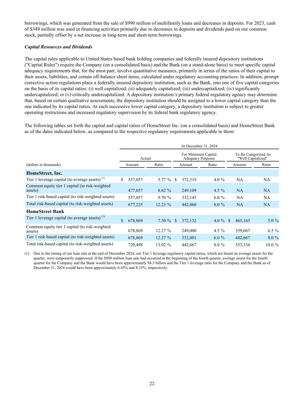 借款,这是由于出售9.9亿美元的多户家庭贷款和存款减少而产生的。2023年,3.49亿美元现金用于融资活动,主要是由于我们普通股的存款和股息减少,部分被长期和短期借款的净增加所抵消。资本资源和股息适用于美国银行控股公司和联邦保险存款机构的资本规则(“资本规则”)要求公司(在合并基础上)和银行(在独立基础上)满足特定的资本充足率要求,这些要求在很大程度上涉及量化衡量,主要是根据监管会计惯例计算的其资本与其资产、负债和某些表外项目的比率。此外,迅速纠正行动条例根据其资本比率将联邦保险存款机构,如银行,划分为五个资本类别之一:(i)资本充足;(ii)资本充足;(iii)资本不足;(iv)资本严重不足;或(v)资本严重不足。存款机构的主要联邦监管机构可以根据某些定性评估确定,存款机构应被分配到比其资本比率所示的资本类别更低的资本类别。在每一个连续较低的资本类别中,存款机构都受到其联邦银行监管机构更大的经营限制和更多的监管监管。下表列出了HomeStreet Inc.(合并口径)和HomeStreet银行截至下述日期的资本和资本比率,以及与其各自适用的监管要求相比的资本和资本比率:截至2024年12月31日,最低资本充足目的实际归类为“资本化程度良好”(单位:千美元)的金额比率金额比率金额比率金额比率金额比率比率HomeStreet,Inc.一级杠杆资本(与平均资产比率)(1)$ 537,0575.77% $ 372,3194.0% NA NA普通股权一级资本(与风险加权资产比率)477,0578.62% 249,1094.5% NA NA一级风险资本(与风险加权资产比率)537,0579.70% 332,1456.0% NA总风险资本(与风险加权资产比率)677,22512.23% 442,8608.0% NA NA HomeStreet银行一级杠杆资本(与平均资产比率)(1)$ 678,8697.30% $ 372,1324.0% $ 465,1655.0%普通股权一级资本(与风险加权资产比率)678,86912.27% 249,0004.5%359,6676.5%一级风险型资本(相对于风险加权资产)678,86912.27% 332,0016.0% 442,6678.0%风险型资本总额(相对于风险加权资产)720,49813.02% 442,6678.0% 553,33410.0%(1)由于我们2024年12月底出售贷款的时间安排,我们基于当季平均资产的一级杠杆监管资本比率暂时受到抑制。如果这笔9.9亿美元的贷款出售发生在第四季度初,公司和银行第四季度的平均资产将约为83亿美元,截至2024年12月31日,公司和银行的一级杠杆率将分别约为6.45%和8.15%。22