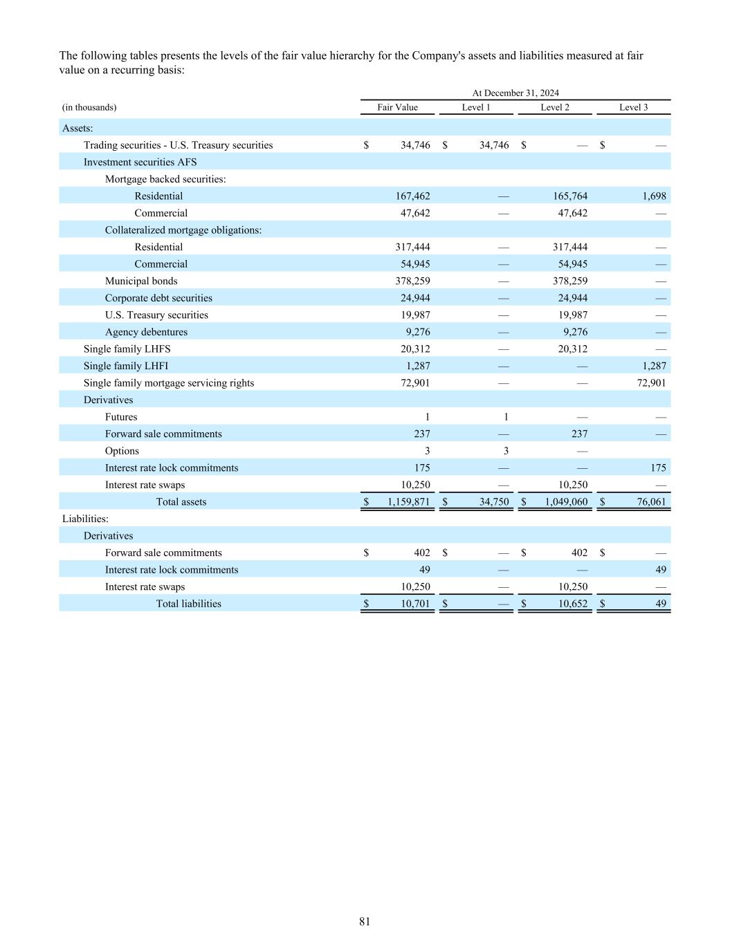 下表列示了公司经常性以公允价值计量的资产和负债的公允价值层级:截至12月31日,2024年(单位:千)公允价值1级2级3级资产:交易证券-美国国债$ 34,746 $ 34,746 $ — $ —投资证券AFS抵押支持证券:住宅167,462 — 165,7641,698商业47,642 — 47,642 —抵押抵押债务:住宅317,444 — 317,444 —商业54,945 — 54,945 —市政债券378,259 —公司债务证券24,944 — 24,944 —美国国债19,987 — 19,987 —机构债券9,276 — 9,276 —单户LHFS 20,312 — 20,312 —单户LHFI 1,287 — 1,287单户抵押贷款服务权72,901 —— 72,901衍生品期货11 ——远期卖出承诺237 —— 237 ——期权33 ——利率锁定承诺175 —— 175利率掉期10,250 —— 10,250 ——总资产1,159,871美元34,750美元1,049,060美元76,061美元负债:衍生品远期卖出承诺402美元— 402美元—利率锁定承诺49 —— 49利率掉期10,250 —— 10,250 ——总负债10,701美元— 10,652美元4981