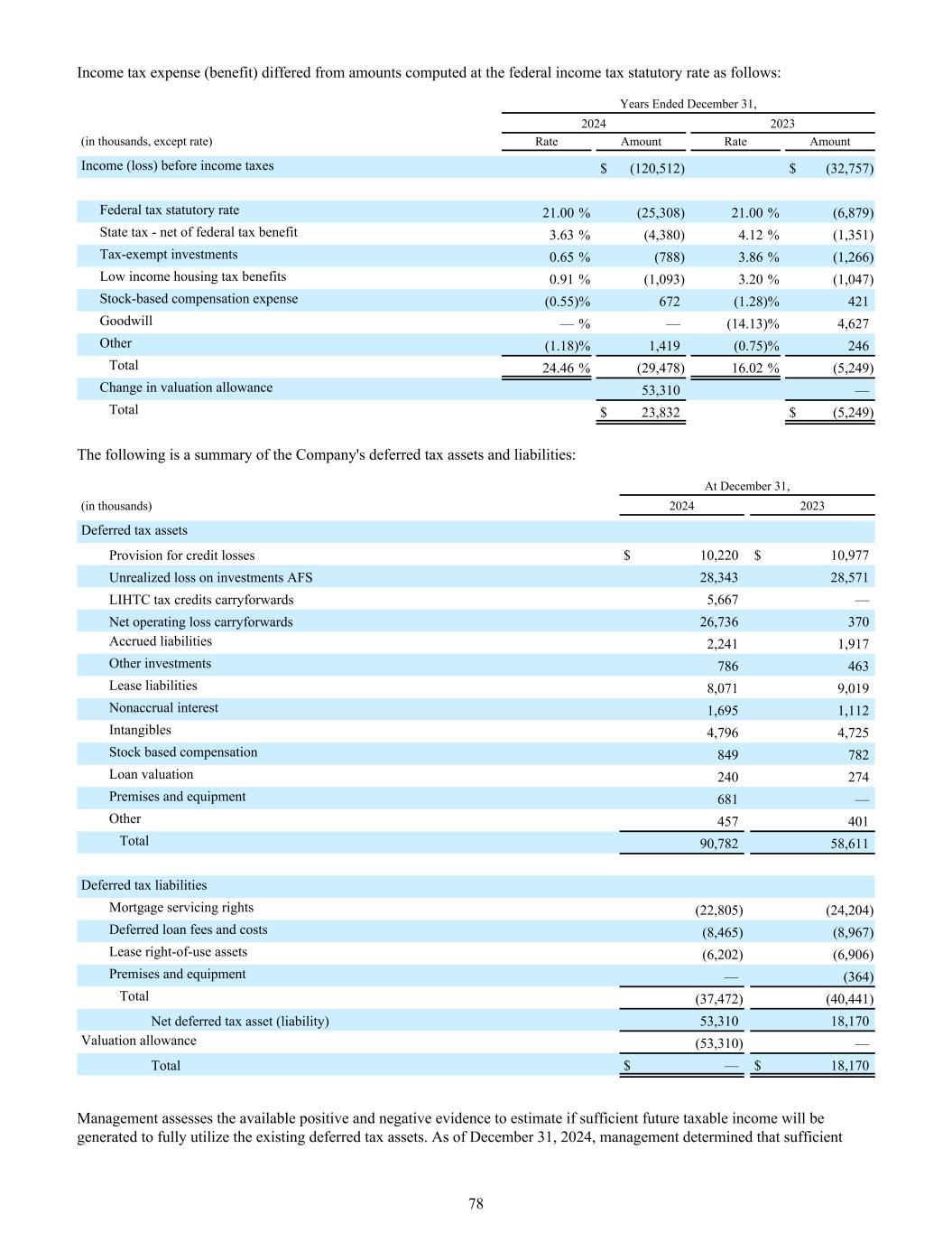 所得税费用(福利)与按联邦所得税法定税率计算的金额不同如下:截至2024年12月31日的年度2023(单位:千,除费率)费率金额费率金额收入(亏损)所得税前$(120,512)$(32,757)联邦税收法定税率21.00%(25,308)21.00%(6,879)州税-扣除联邦税收优惠3.63%(4,380)4.12%(1,351)免税投资0.65%(788)3.86%(1,266)低收入住房税收优惠0.91%(1,093)3.20%(1,047)股票补偿费用(0.55)% 672(1.28)% 421商誉—% —(14.13)% 4,627其他(1.18)% 1,419(0.75)% 246合计24.46%(29,478)16.02%(5,249)估值备抵变动53,310 —合计$ 23,832 $(5,249)以下为公司递延税务资产负债:截至12月31日,(单位:千)20242023递延所得税资产信用损失准备金10,220美元10,977美元未实现投资损失AFS 28,34328,571 LIHTC税收抵免结转5,667 —净经营亏损结转26,736370应计负债2,2411,917其他投资786463租赁负债8,0719,019非应计利息1,6951,112无形资产4,7964,725股票补偿849782贷款估值240274处房产和设备681 —其他457401合计90,78258,611递延税项负债抵押服务权(22,805)(24,204)递延贷款费用和成本(8,465)(8,967)租赁使用权资产(6,202)(6,906)房地和设备—(364)合计(37,472)(40,441)递延所得税资产(负债)净额53,31018,170估值备抵(53,310)—合计$ — 18,170管理层评估现有的正面和负面证据,以估计是否将产生足够的未来应税收入以充分利用现有的递延所得税资产。截至2024年12月31日,管理层确定充足的78