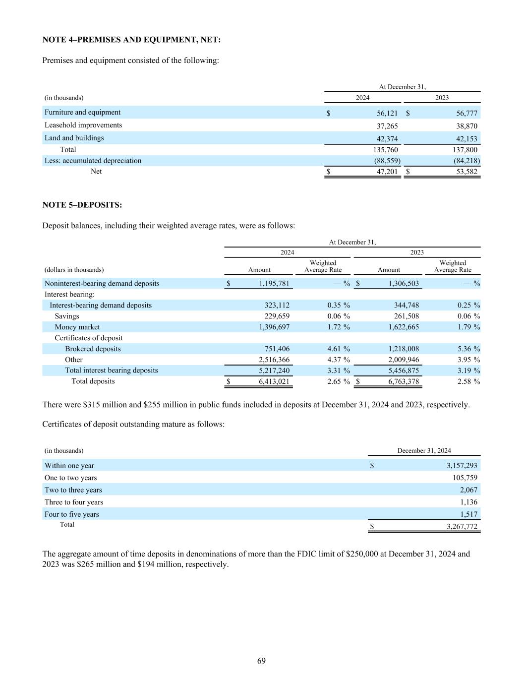 注4 –房地和设备,净额:房地和设备包括:截至12月31日,(单位:千)20242023家具和设备56,121美元56,777美元租赁物改良37,26538,870土地和建筑物42,37442,153总计135,760137,800减:累计折旧(88,559)(84,218)净额47,201美元53,582美元注5 –存款:存款余额,包括其加权平均费率如下:截至12月31日,20242023(单位:千美元)金额加权平均利率金额加权平均利率不计息活期存款$ 1,195,781 —% $ 1,306,503 —%计息:计息活期存款323,1120.35% 344,7480.25%储蓄229,6590.06% 261,5080.06%货币市场1,396,6971.72% 1,622,6651.79%存单经纪存款751,4064.61% 1,218,0085.36%其他2,516,3664.37% 2,009,9463.95%计息存款总额5,217,2403.31% 5,456,8753.19%存款总额6,413,0 212.65% 6,763,3782.58%有3.15亿美元以及分别于2024年12月31日和2023年12月31日计入存款的2.55亿美元公共基金。未偿存单到期情况如下:(单位:千)2024年12月31日一年内3,157,293美元一至两年105,759二至三年2,067三至四年1,136四至五年1,517总计3,267,772美元2024年12月31日和2023年12月31日,超过FDIC限额250,000美元的面额定期存款总额分别为2.65亿美元和1.94亿美元。69