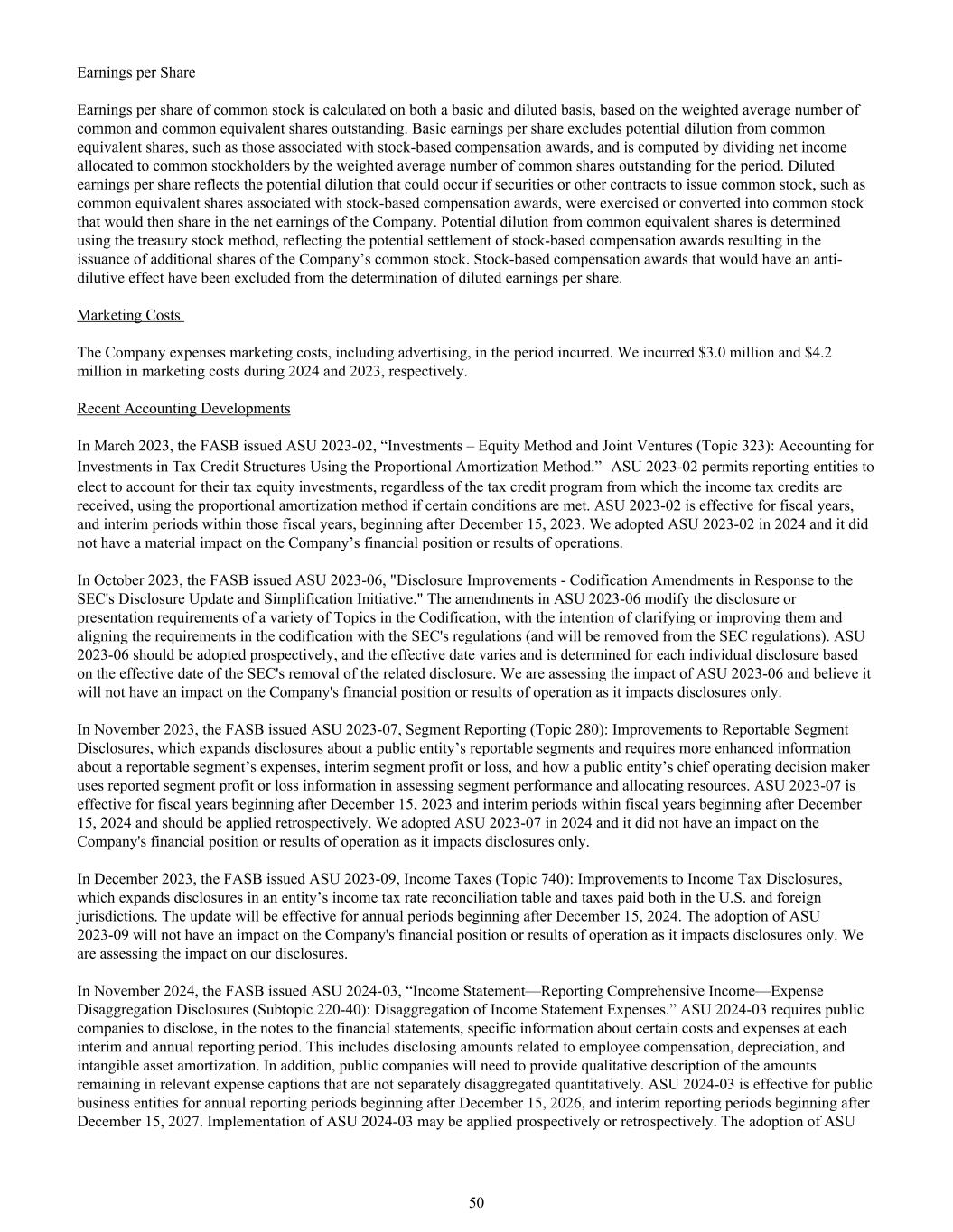 每股收益普通股每股收益按基本和稀释基础计算,基于已发行普通股和普通等值股份的加权平均数。基本每股收益不包括与基于股票的薪酬奖励相关的普通股等值股份的潜在稀释,计算方法是将分配给普通股股东的净收入除以该期间已发行普通股的加权平均数。稀释每股收益反映了如果发行普通股的证券或其他合同,例如与基于股票的薪酬奖励相关的普通等值股份被行使或转换为普通股,然后将分享公司的净收益,则可能发生的稀释。普通等值股份的潜在稀释是使用库存股法确定的,反映了基于股票的补偿裁决的潜在结算,从而导致公司普通股的额外发行。具有反稀释作用的基于股票的补偿奖励已被排除在稀释每股收益的确定之外。营销成本公司在发生期间支出营销成本,包括广告。我们在2024年和2023年分别产生了300万美元和420万美元的营销成本。最近的会计发展在2023年3月,FASB发布了ASU 2023-02,“投资–权益法和合资企业(主题323):使用比例摊销法对税收抵免结构中的投资进行会计处理。”ASU2023-02允许报告实体选择对其税收股权投资进行会计处理,无论获得所得税抵免的税收抵免计划如何,如果满足某些条件,则使用比例摊销法。ASU2023-02在财政年度生效,在这些财政年度内的过渡期,从2023年12月15日之后开始。我们在2024年采用ASU2023-02,对公司的财务状况或经营业绩没有实质性影响。2023年10月,FASB发布了ASU 2023-06,“披露改进-响应SEC披露更新和简化倡议的编纂修正”。ASU 2023-06中的修订修改了编纂中多种主题的披露或列报要求,旨在澄清或改进它们,并使编纂中的要求与SEC的规定保持一致(并将从SEC规定中删除)。ASU2023-06应采用前瞻性,生效日期各不相同,并根据SEC删除相关披露的生效日期为每个单独的披露确定。我们正在评估ASU2023-06的影响,并认为它不会对公司的财务状况或经营业绩产生影响,因为它只会影响披露。2023年11月,FASB发布了ASU 2023-07,分部报告(主题280):可报告分部披露的改进,扩大了关于公共实体可报告分部的披露,并要求更多关于可报告分部的费用、中期分部损益以及公共实体的主要经营决策者如何在评估分部业绩和分配资源时使用报告的分部损益信息。ASU2023-07对2023年12月15日之后开始的财政年度和2024年12月15日之后开始的财政年度内的过渡期有效,应追溯适用。我们在2024年采用ASU2023-07,它对公司的财务状况或经营业绩没有影响,因为它只影响披露。2023年12月,FASB发布了ASU 2023-09,《所得税(主题740):所得税披露的改进》,扩大了实体所得税率调节表中的披露以及在美国和外国司法管辖区缴纳的税款。该更新将在2024年12月15日之后开始的年度期间生效。ASU2023-09的采用不会对公司的财务状况或经营业绩产生影响,因为它只会影响披露。我们正在评估对我们披露的影响。2024年11月,FASB发布ASU 2024-03,“损益表——报告综合收益——费用分类披露(子主题220-40):损益表费用分类。”ASU2024-03要求上市公司在财务报表附注中披露有关每个中期和年度报告期间某些成本和费用的具体信息。这包括披露与员工薪酬、折旧和无形资产摊销相关的金额。此外, 上市公司将需要对相关费用标题中未单独定量分类的剩余金额提供定性描述。ASU2024-03对2026年12月15日之后开始的年度报告期和2027年12月15日之后开始的中期报告期的公共企业实体有效。ASU2024-03的实施可能会被前瞻性或追溯性地应用。ASU50的通过