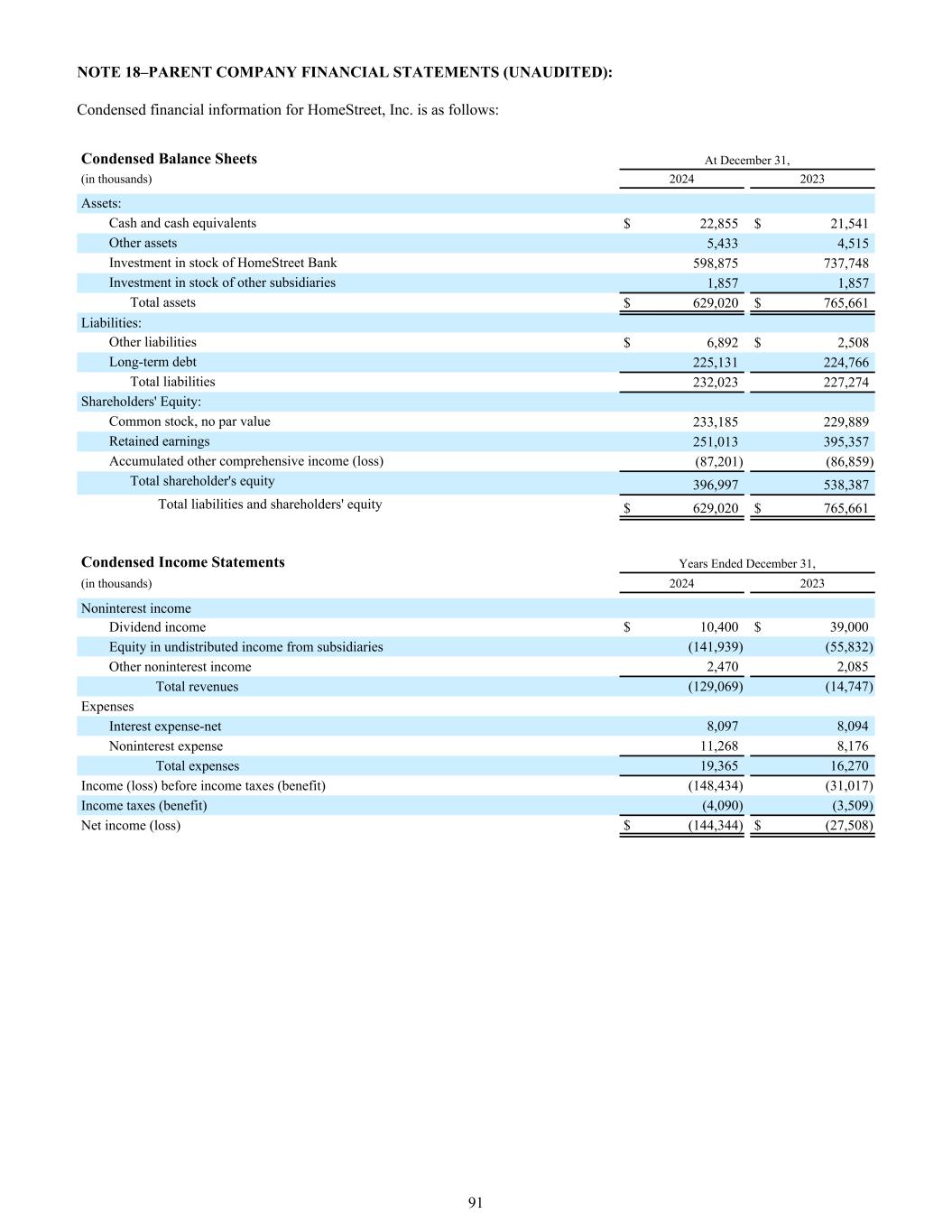 附注18 –母公司财务报表(未经审计):HomeStreet,Inc.的简明财务信息如下:截至12月31日的简明资产负债表,(单位:千元)20242023资产:现金及现金等价物22,855美元21,541美元其他资产5,4334,515投资TERM0银行股票598,875737,748投资其他子公司股票1,8571,857总资产629,020美元765,661美元负债:其他负债6,892美元2,508美元长期债务225,131224,766负债总额232,023227,274股东权益:普通股,无面值233,185229,889留存收益251,013395,357累计其他综合收益(亏损)(87,201)(86,859)股东权益总额396,997538,387负债和股东权益总额$ 629,020 $ 765,661简明损益表截至12月31日止年度,(单位:千)20242023非利息收入股息收入$ 10,400 $ 39,000子公司未分配收入权益(141,939)(55,832)其他非利息收入2,4702,085总收入(129,069)(14,747)费用利息支出-净额8,0978,094非利息支出11,2688,176总费用19,36516,270所得税前收入(亏损)(收益)(148,434)(31,017)所得税(收益)(4,090)(3,509)净收入(亏损)$(144,344)$(27,508)91