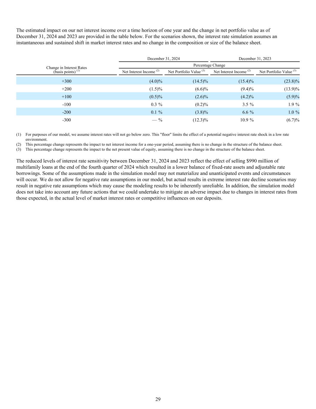 下表提供了在一年的时间范围内对我们的净利息收入的估计影响以及截至2024年12月31日和2023年12月31日的投资组合净值变化。对于所示情景,利率模拟假设市场利率瞬时持续变化,资产负债表的构成或规模没有变化。2024年12月31日2023年12月31日利率变动(基点)(1)百分比变动净利息收入(2)投资组合净值(3)净利息收入(2)投资组合净值(3)+ 300(4.0)%(14.5)%(15.4)%(23.8)% + 200(1.5)%(6.6)%(9.4)%(13.9)% + 100(0.5)%(2.6)%(4.2)%(5.9)%-100 0.3%(0.2)% 3.5% 1.9%-200 0.1%(3.8)% 6.6% 1.0%-300 —%(12.3)% 10.9%(6.7)%(1)就我们的模型而言,我们假设利率不会低于零。这一“下限”限制了低利率环境下潜在负利率冲击的影响。(2)这个百分比变化代表对一年期净利息收入的影响,假设资产负债表的结构没有变化。(3)这个百分比变化代表对权益净现值的影响,假设资产负债表的结构没有变化。2024年12月31日至2023年期间利率敏感性水平的降低反映了2024年第四季度末出售9.9亿美元多户家庭贷款的影响,这导致固定利率资产和可调整利率借款的余额降低。模拟模型中所做的一些假设可能无法实现,并且会发生意外事件和情况。我们的模型中不允许负利率假设,但在极端利率下降情景下的实际结果可能会导致负利率假设,这可能会导致建模结果本质上不可靠。此外,模拟模型没有考虑到我们可以采取的任何未来行动,以减轻由于利率与预期的变化、市场利率的实际水平或对我们存款的竞争影响而产生的不利影响。29