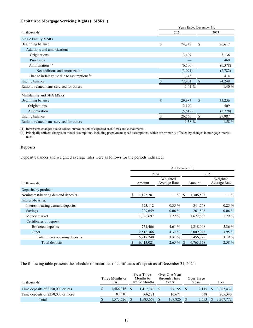 截至12月31日的资本化抵押贷款服务权(“MSRs”)年度,(单位:千)20242023单一家庭MSRs期初余额74,249美元76,617美元增加和摊销:来源3,4093,136次购买— 460次摊销(1)(6,500)(6,378)净增加和摊销(3,091)(2,782)假设导致的公允价值变动(2)1,743414期末余额72,901美元74,249美元与为他人服务的相关贷款的比率1.41% 1.40%多户SBA MSRS期初余额$ 29,987 $ 35,256来源2,190509摊销(5,612)(5,778)期末余额$ 26,565 $ 29,987与为他人服务的相关贷款的比率1.38% 1.58%(1)表示由于收取/实现预期现金流和缩减而发生的变化。(2)主要反映模型假设的变化,包括提前还款速度假设,主要受抵押贷款利率变化的影响。存款存款余额及加权平均利率如下所示期间:截至12月31日,20242023(单位:千)金额加权平均利率金额加权平均利率存款按产品分类:不计息活期存款$ 1,195,781 —% $ 1,306,503 —%计息:计息活期存款323,1120.35% 344,7480.25%储蓄229,6590.06% 261,5080.06%货币市场1,396,6971.72% 1,622,6651.79%存单经纪存款751,4064.61% 1,218,0085.36%其他2,516,3664.37% 2,009,9463.95%计息存款总额5,217,2403.31% 5,456,8753.19%存款总额$ 6,413,0212.65% $ 6,763,3782.58%下表列示存单到期日程表截至2024年12月31日:(单位:千)三个月或以下超过三个月至十二个月超过一年至三年超过三年的定期存款总额250,000美元或以下$ 1,486,016 $ 1,417,146 $ 97,155 $ 2,115 $ 3,002,432定期存款250,000美元或以上87,610166,52110,671538265,340合计1,573,626美元1,583,667美元107,826美元2,653美元3,267,77218
