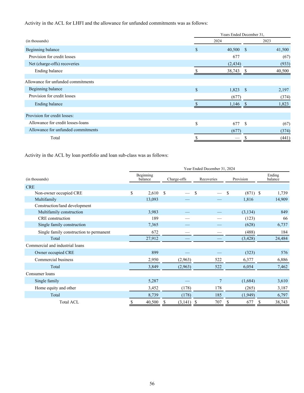 LHFI的ACL和无资金承诺的备抵活动如下:截至12月31日的年度,(单位:千)20242023期初余额$ 40,500 $ 41,500信贷损失准备金677(67)净(冲销)回收(2,434)(933)期末余额$ 38,743 $ 40,500未备资承诺准备金期初余额$ 1,823 $ 2,197信贷损失准备金(677)(374)期末余额$ 1,146 $ 1,823信贷损失准备金:信贷损失准备金-贷款677美元(67)未备资承诺准备金(677)(374)总计$ — $(441)ACL中按贷款组合和贷款子类划分的活动如下:截至12月31日止年度,2024年(单位:千)期初余额冲销回收准备期末余额CRE非业主占用CRE $ 2,610 $ — $ — $(871)$ 1,739多户住宅13,093 —— 1,81614,909建筑/土地开发多户住宅建筑3,983 ——(3,134)849 CRE建筑189 ——(123)66单户住宅建筑7,365 ——(628)6,737单户住宅建筑至永久672 ——(488)184合计27,912 ——(3,428)24,484商业和工业贷款业主占用CRE 899 ——(323)576商业业务2,950(2,963)5226,3776,886合计3,849(2,963)5226,0547,462消费贷款单一家庭5,287 — 7(1,684)3,610房屋净值和其他3,452(178)178(265)3,187合计8,739(178)185(1,949)6,797合计ACL $ 40,500 $(3,141)$ 707 $ 677 $ 38,74356