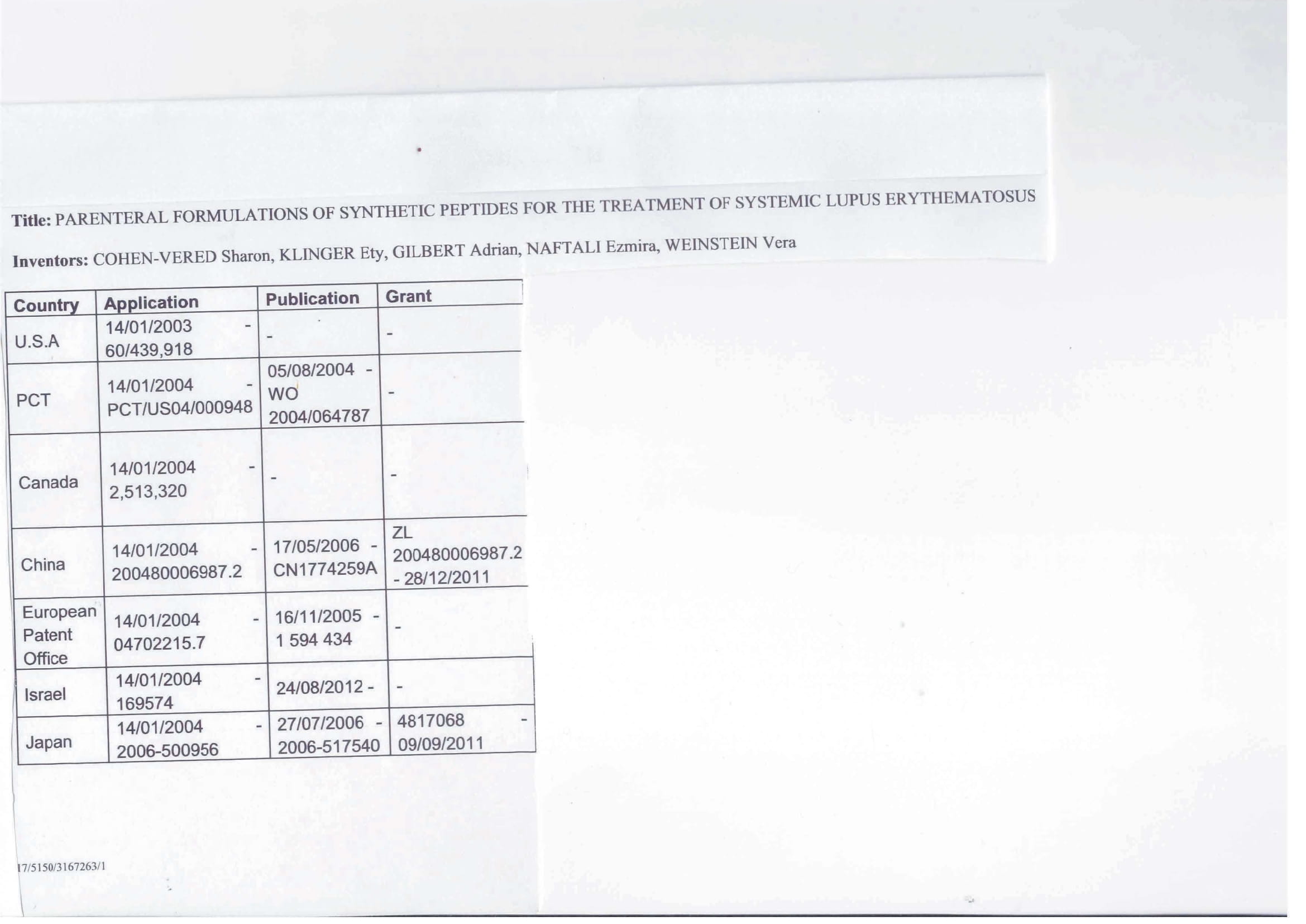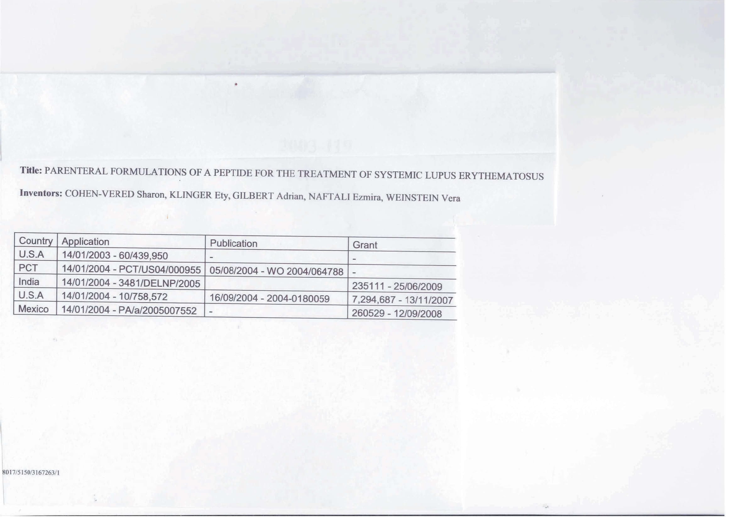名为“治疗系统性红斑狼疮的多肽的肠外制剂”的制剂的专利家族,该制剂涵盖了一种非常特殊的药物组合物,其中包括依地肽。它已在美国、欧洲(瑞士、德国、丹麦、西班牙、芬兰、法国、英国、爱尔兰、意大利、荷兰和瑞典)、中国、印度、以色列、日本、墨西哥和加拿大获得批准。见附表。该专利于2024年1月14日到期。即使一旦专利到期,该产品在欧洲和美国仍受到7-10年的数据独占权保护。