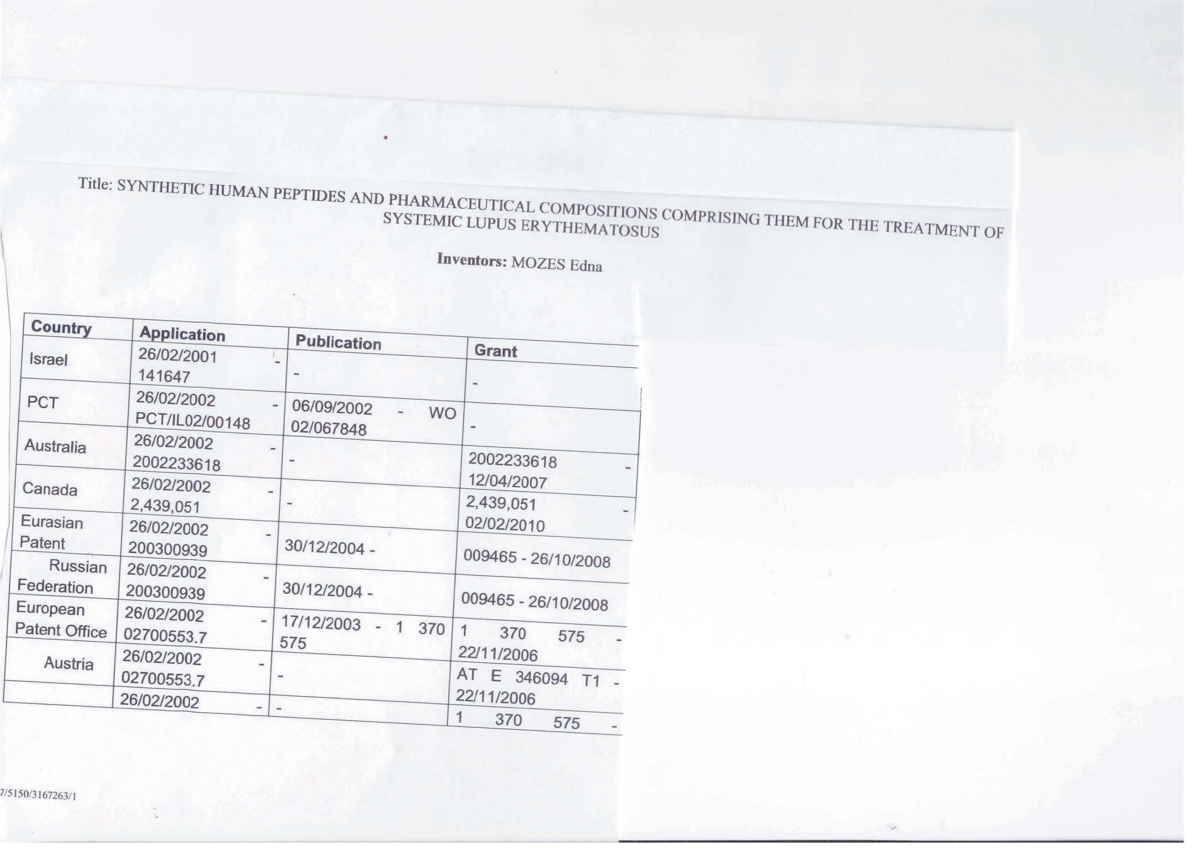 一项名为“合成人源肽及其组成的药物组合物”的用于治疗系统性红斑狼疮的基础专利家族”,涵盖了活性药剂——依达肽肽。该专利已在大量司法管辖区获得授权:美国、欧洲(奥地利、丹麦、芬兰、法国、德国、爱尔兰、意大利、列支敦士登、西班牙、瑞典、瑞士、荷兰和英国)、澳大利亚、加拿大、香港、印度、以色列、日本、韩国、墨西哥、挪威、匈牙利和俄罗斯。见附表。该专利于2022年2月26日到期,但美国的情况除外,后者于2022年9月22日到期。即使专利到期,该产品在欧洲和美国仍受到7-10年的数据独占权保护。