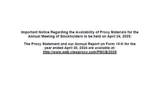 我们决定通过互联网上的现场音频网络直播以虚拟方式举办今年的年会,因为举办虚拟年会可以让世界各地的任何地点都有更多的股东出席和参与,提高会议效率和我们与股东有效沟通的能力,并降低我们年会的成本和环境影响。您可先在http://www.web.viewproxy.com//上注册参加年会,网址为:PMCB/2025。您将通过电子邮件收到会议邀请,其中包含您唯一的加入链接以及会议日期之前的密码。你将不能亲自出席年会。
