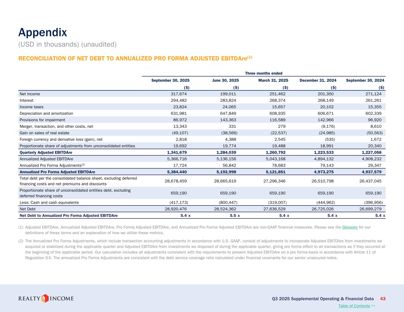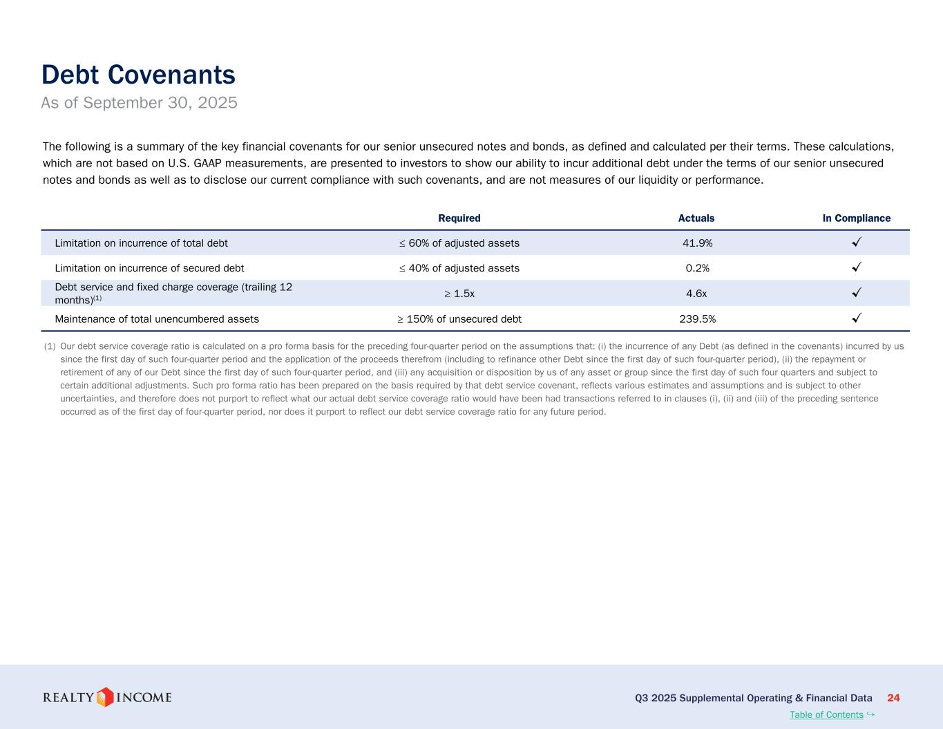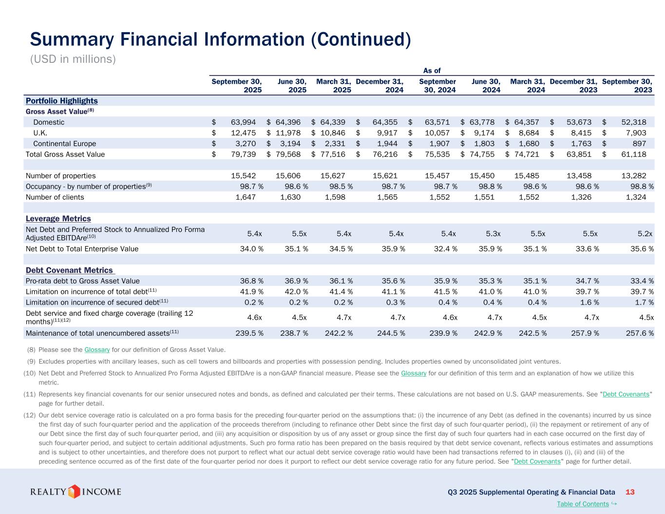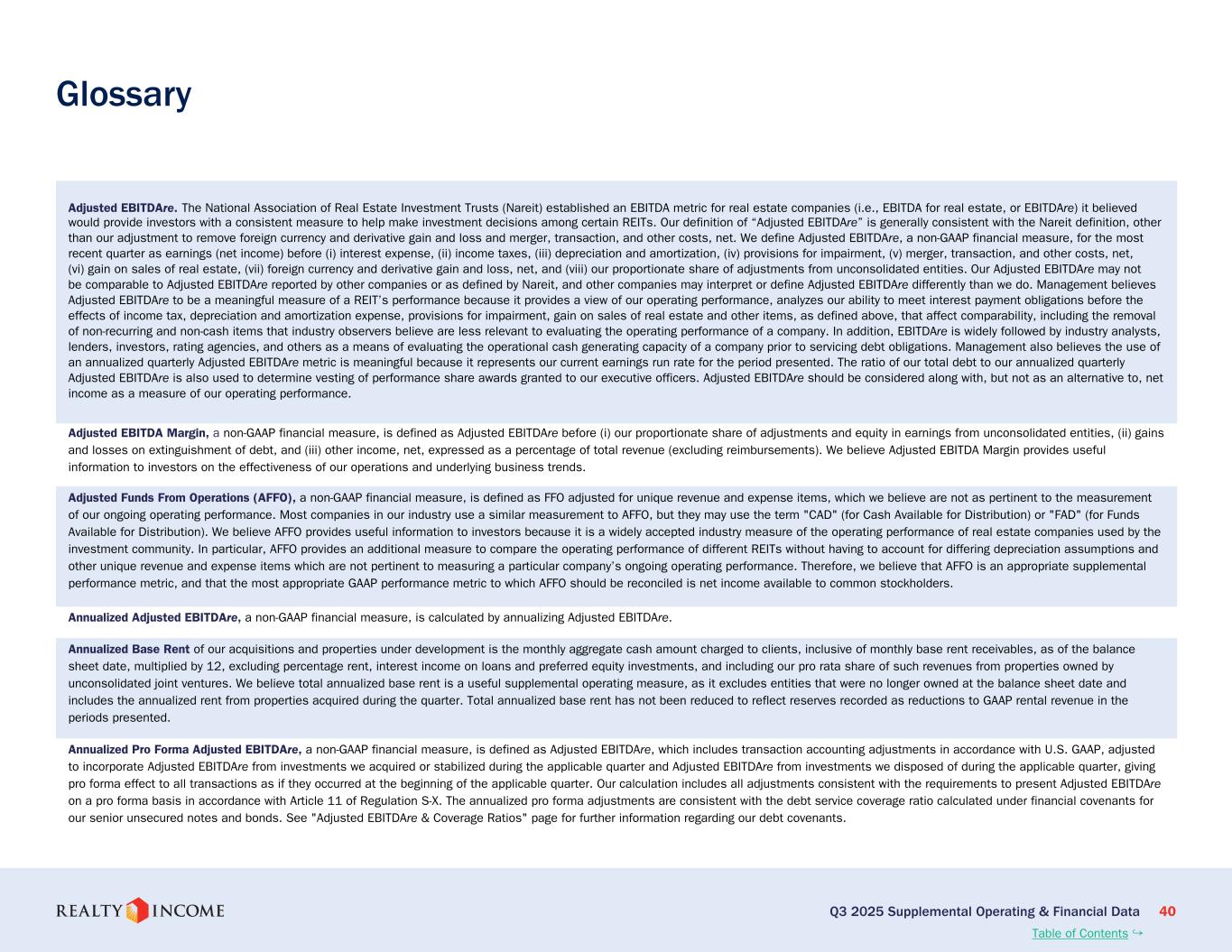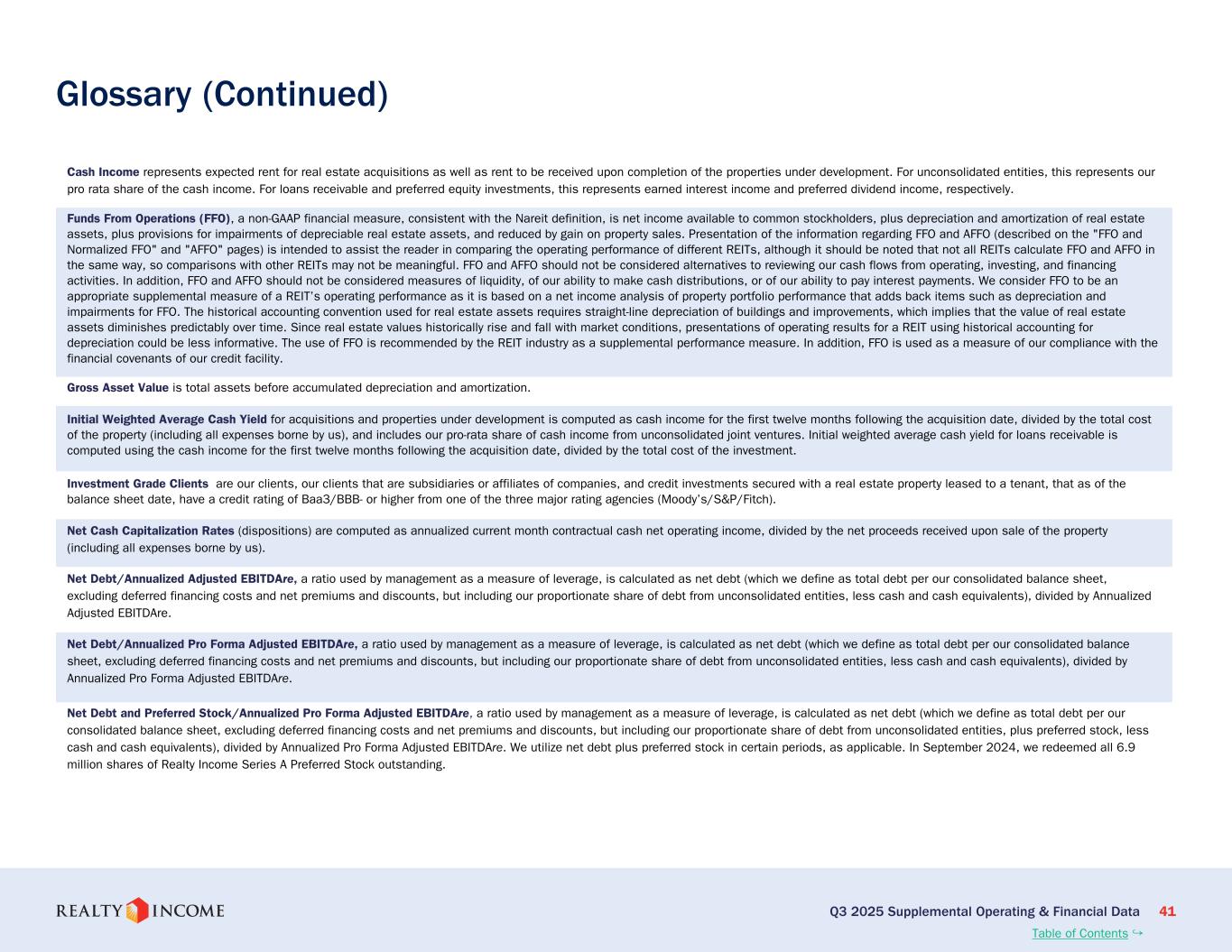 2025年第三季度补充经营和财务数据41现金收入指房地产收购的预期租金以及在开发中的物业完工后将收到的租金。对于未合并实体,这代表我们在现金收入中的按比例份额。对于应收贷款和优先股投资,这分别代表赚取的利息收入和优先股股息收入。运营资金(FFO)是一种非公认会计准则财务指标,与Nareit定义一致,是普通股股东可获得的净收入,加上房地产资产的折旧和摊销,加上可折旧房地产资产的减值准备,并减去房地产销售收益。介绍有关FFO和AFFO的信息(在“FFO和标准化FFO”和“AFFO”页面上描述)旨在帮助读者比较不同REITs的经营业绩,尽管需要注意的是,并非所有REITs计算FFO和AFFO的方式都相同,因此与其他REITs进行比较可能没有意义。FFO和AFFO不应被视为审查我们来自运营、投资和融资活动的现金流的替代方案。此外,FFO和AFFO不应被视为流动性、我们进行现金分配的能力或我们支付利息的能力的衡量标准。我们认为FFO是衡量REIT经营业绩的适当补充衡量标准,因为它是基于对物业组合业绩的净收入分析,其中增加了FFO的折旧和减值等项目。房地产资产使用的历史会计惯例要求建筑物和装修的直线折旧,这意味着房地产资产的价值会随着时间的推移而出现可预测的递减。由于房地产价值在历史上随市场状况而上升和下降,使用折旧历史会计的房地产投资信托基金的经营业绩介绍可能不太有用。REIT行业建议使用FFO作为补充绩效衡量标准。此外,FFO被用作衡量我们遵守信贷安排的财务契约的标准。总资产价值是累计折旧和摊销前的总资产。收购和开发中物业的初始加权平均现金收益率计算为收购日期后前十二个月的现金收入,除以物业的总成本(包括我们承担的所有费用),并包括我们按比例分享的未合并合资企业的现金收入。应收贷款的初始加权平均现金收益率是使用收购日期后前十二个月的现金收入除以投资的总成本计算得出的。投资级客户是我们的客户,我们的客户是公司的子公司或关联公司,以及以租赁给租户的不动产作抵押的信贷投资,截至资产负债表日,在三大评级机构之一(穆迪/标普/惠誉)的信用评级为Baa3/BBB-或更高。净现金资本化率(处置)计算为年化当月合同现金净营业收入,除以出售物业时收到的净收益(包括我们承担的所有费用)。净债务/年化调整后EBITDA是管理层用来衡量杠杆率的一个比率,计算方法是净债务(我们将其定义为根据我们的合并资产负债表的总债务,不包括递延融资成本和净溢价和折价,但包括我们在未合并实体的债务中所占的比例份额,减去现金和现金等价物),除以年化调整后EBITDA。净债务/年化备考调整后EBITDA是管理层用来衡量杠杆率的比率,计算方法为净债务(我们将其定义为根据我们的合并资产负债表的总债务,不包括递延融资成本和净溢价和折价,但包括我们在未合并实体的债务中所占的比例份额,减去现金和现金等价物),除以年化备考调整后EBITDA。净债务和优先股/年化备考调整后EBITDA是管理层用来衡量杠杆率的一个比率,计算方法是净债务(我们将其定义为根据我们的合并资产负债表的总债务,不包括递延融资成本和净溢价和折价,但包括我们在未合并实体的债务中所占的比例份额,加上优先股,减去现金和现金等价物),除以年化备考调整后EBITDA。我们在某些时期使用净债务加上优先股(如适用)。2024年9月,我们赎回了全部690万股已发行的Realty Income系列A优先股。词汇表(续)目录↪
