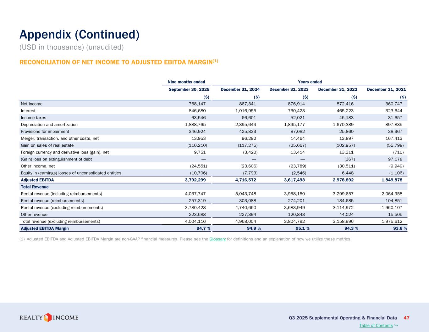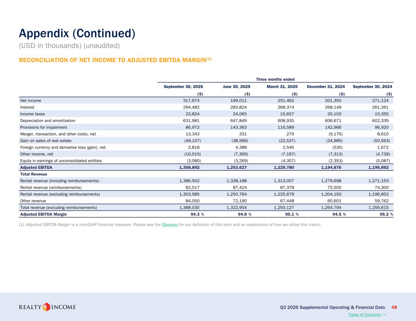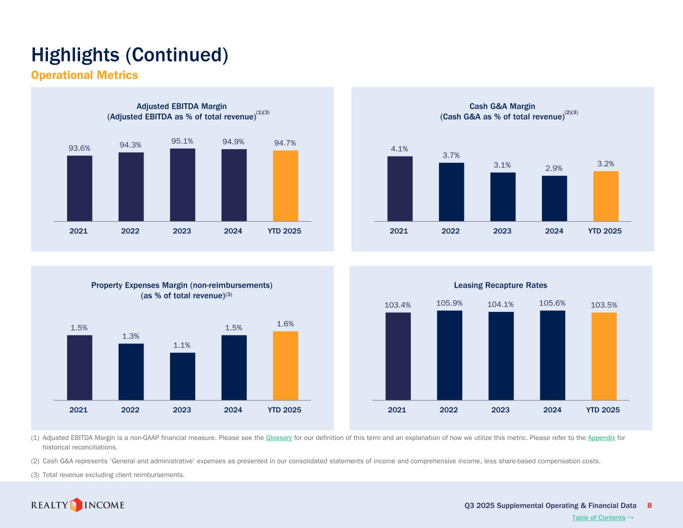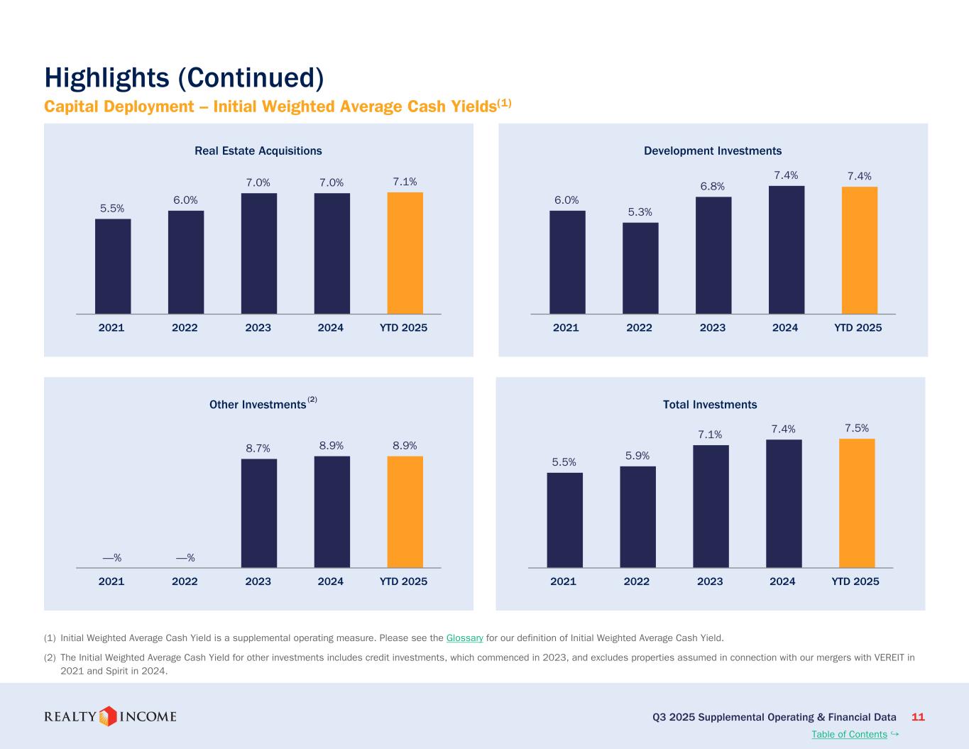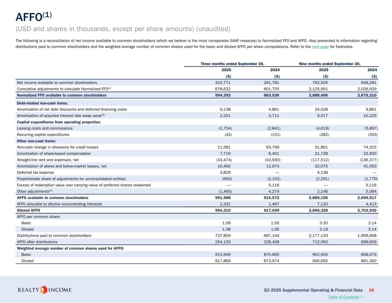 2025年第三季度补充经营和财务数据41现金收入指房地产收购的预期租金以及在开发中的物业完工后将收到的租金。对于未合并实体,这代表我们在现金收入中的按比例份额。对于应收贷款和优先股投资,这分别代表赚取的利息收入和优先股股息收入。运营资金(FFO)是一种非公认会计准则财务指标,与Nareit定义一致,是普通股股东可获得的净收入,加上房地产资产的折旧和摊销,加上可折旧房地产资产的减值准备,并减去房地产销售收益。介绍有关FFO和AFFO的信息(在“FFO和标准化FFO”和“AFFO”页面上描述)旨在帮助读者比较不同REITs的经营业绩,尽管需要注意的是,并非所有REITs计算FFO和AFFO的方式都相同,因此与其他REITs进行比较可能没有意义。FFO和AFFO不应被视为审查我们来自运营、投资和融资活动的现金流的替代方案。此外,FFO和AFFO不应被视为流动性、我们进行现金分配的能力或我们支付利息的能力的衡量标准。我们认为FFO是衡量REIT经营业绩的适当补充衡量标准,因为它是基于对物业组合业绩的净收入分析,其中增加了FFO的折旧和减值等项目。房地产资产使用的历史会计惯例要求建筑物和装修的直线折旧,这意味着房地产资产的价值会随着时间的推移而出现可预测的递减。由于房地产价值在历史上随市场状况而上升和下降,使用折旧历史会计的房地产投资信托基金的经营业绩介绍可能不太有用。REIT行业建议使用FFO作为补充绩效衡量标准。此外,FFO被用作衡量我们遵守信贷安排的财务契约的标准。总资产价值是累计折旧和摊销前的总资产。收购和开发中物业的初始加权平均现金收益率计算为收购日期后前十二个月的现金收入,除以物业的总成本(包括我们承担的所有费用),并包括我们按比例分享的未合并合资企业的现金收入。应收贷款的初始加权平均现金收益率是使用收购日期后前十二个月的现金收入除以投资的总成本计算得出的。投资级客户是我们的客户,我们的客户是公司的子公司或关联公司,以及以租赁给租户的不动产作抵押的信贷投资,截至资产负债表日,在三大评级机构之一(穆迪/标普/惠誉)的信用评级为Baa3/BBB-或更高。净现金资本化率(处置)计算为年化当月合同现金净营业收入,除以出售物业时收到的净收益(包括我们承担的所有费用)。净债务/年化调整后EBITDA是管理层用来衡量杠杆率的一个比率,计算方法是净债务(我们将其定义为根据我们的合并资产负债表的总债务,不包括递延融资成本和净溢价和折价,但包括我们在未合并实体的债务中所占的比例份额,减去现金和现金等价物),除以年化调整后EBITDA。净债务/年化备考调整后EBITDA是管理层用来衡量杠杆率的比率,计算方法为净债务(我们将其定义为根据我们的合并资产负债表的总债务,不包括递延融资成本和净溢价和折价,但包括我们在未合并实体的债务中所占的比例份额,减去现金和现金等价物),除以年化备考调整后EBITDA。净债务和优先股/年化备考调整后EBITDA是管理层用来衡量杠杆率的一个比率,计算方法是净债务(我们将其定义为根据我们的合并资产负债表的总债务,不包括递延融资成本和净溢价和折价,但包括我们在未合并实体的债务中所占的比例份额,加上优先股,减去现金和现金等价物),除以年化备考调整后EBITDA。我们在某些时期使用净债务加上优先股(如适用)。2024年9月,我们赎回了全部690万股已发行的Realty Income系列A优先股。词汇表(续)目录↪