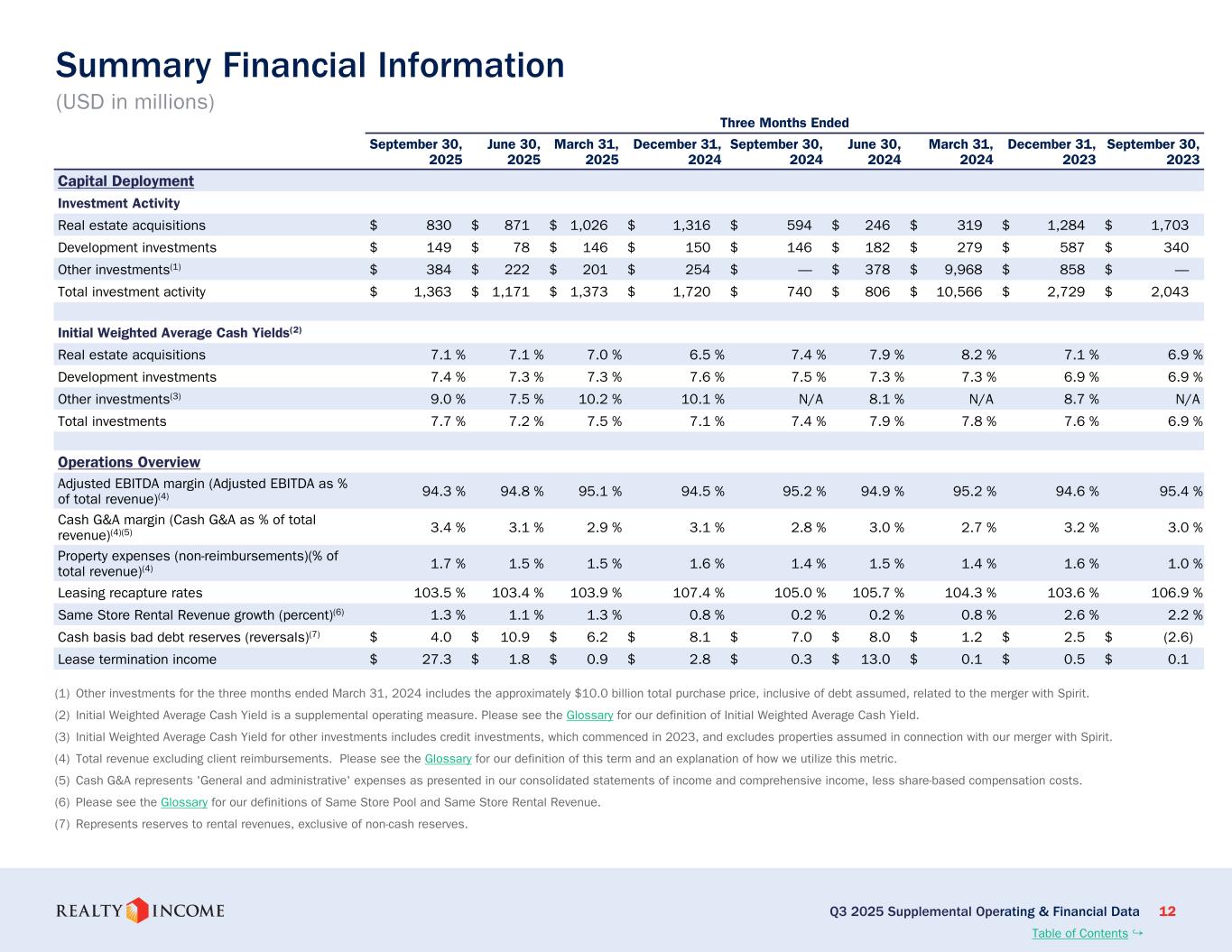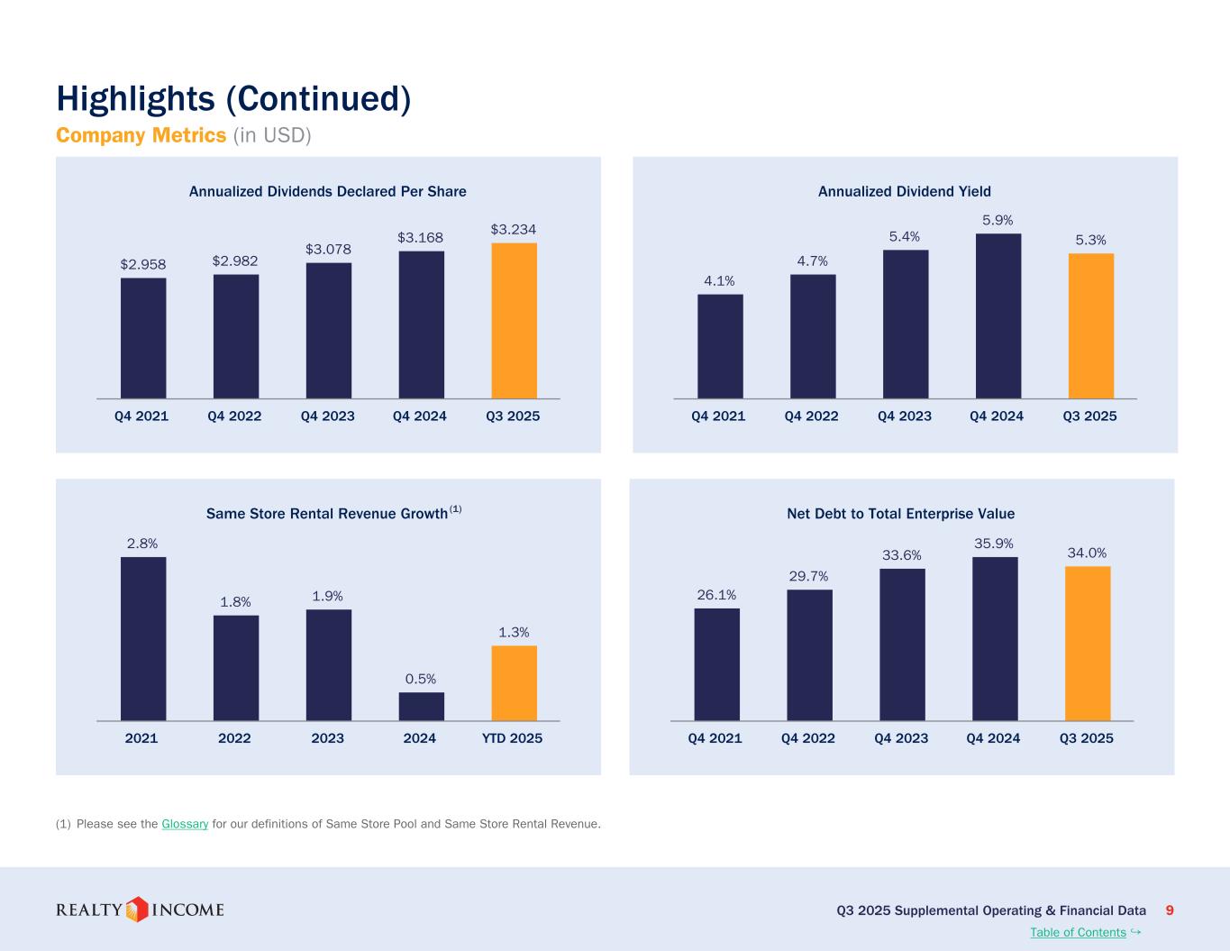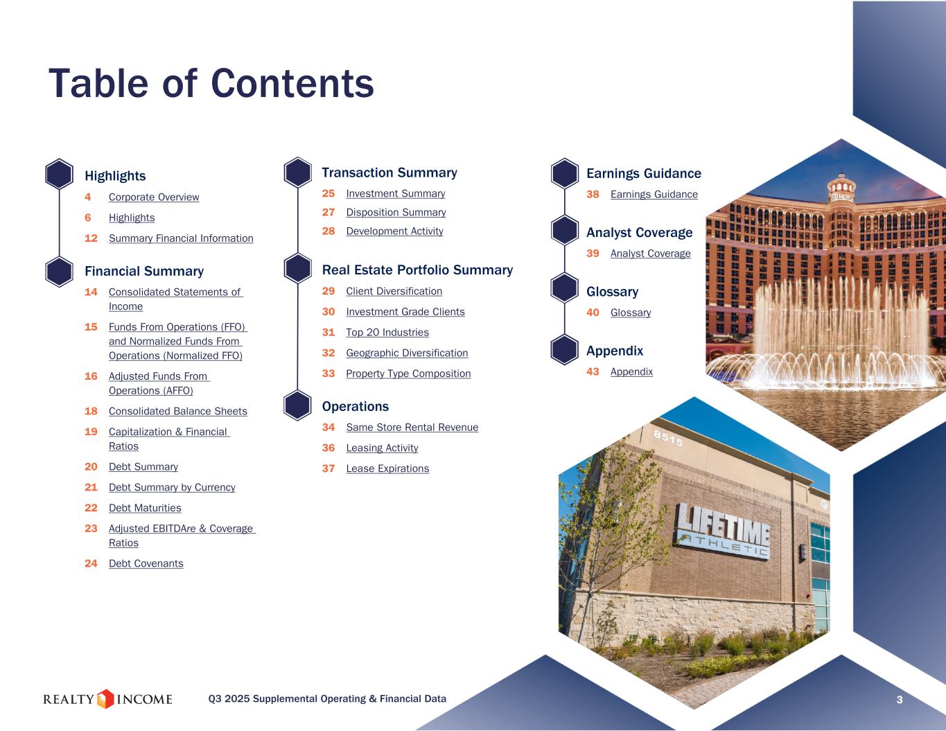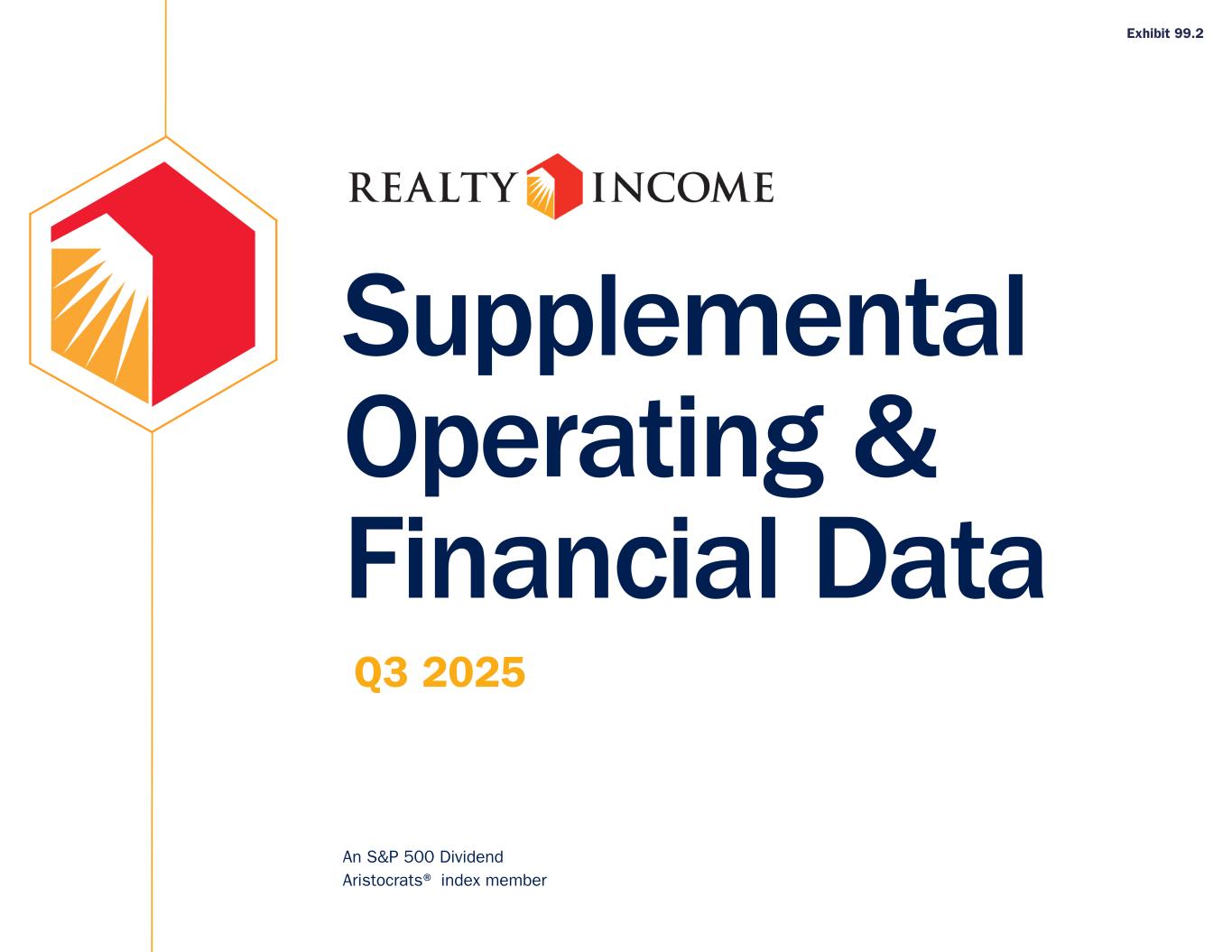 2025年第三季度补充经营和财务数据2前瞻性陈述2025年9月30日前瞻性陈述本补充经营和财务数据演示文稿包含1995年《私人证券诉讼改革法》、经修订的1933年《证券法》第27A条和经修订的1934年《证券交易法》第21E条含义内的前瞻性陈述。在本演示文稿中使用时,“估计”、“预期”、“预期”、“相信”、“打算”、“继续”、“应该”、“可能”、“可能”、“计划”等词语和类似表述旨在识别前瞻性陈述。前瞻性陈述包括讨论我们的业务和投资组合,包括其管理;我们的平台;增长战略、投资管道和收购或处置物业的意图(包括地域、时机、合作伙伴、客户和条款);物业的再租赁、再开发和投机性开发以及与之相关的支出;运营和结果;宣布运营结果、战略、计划和管理层的意图;指导;我们的股份回购计划;根据我们的ATM计划下的远期销售确认出售的普通股股份的结算;股息,包括股息的金额、时间和支付;以及宏观经济和其他业务趋势,包括独立、单一客户物业长期租赁的利率和市场趋势。前瞻性陈述受有关我们的风险、不确定性和假设的影响,这可能导致我们未来的实际结果与预期结果存在重大差异。可能导致实际结果出现重大差异的一些因素包括,除其他外,我们作为房地产投资信托基金的持续资格;一般国内外业务、经济或金融状况;竞争;波动的利率和汇率;通货膨胀及其对我们的客户和我们的影响;进入债务和股权资本市场以及其他资金来源(包括此类资金的条款和合作伙伴);信贷和金融市场的波动性和不确定性;房地产业务固有的其他风险,包括我们的客户的偿付能力、客户根据租约违约、客户破产增加,与环境事项有关的潜在责任、房地产投资的流动性不足(包括优先购买权或优先要约权)以及自然灾害的潜在损害;我们的房地产资产价值减值;国内外法律及其适用、执行或解释(包括与税法和税率有关)的波动和变化;通过共同投资企业、基金、合资企业、合伙企业和其他安排拥有财产,其中,可能转移或限制我们对基础投资的控制权;流行病或流行病;关键人员的损失;我们作为当事方或未来可能发生的任何法律诉讼的结果;恐怖主义和战争行为;以及合并、收购、共同投资企业、基金、合资企业、合伙企业和其他安排的预期收益;以及我们向美国证券交易委员会提交的报告中讨论的那些额外风险和因素。告诫读者不要过分依赖前瞻性陈述。前瞻性陈述并非对未来计划和业绩的保证,仅在本演示文稿发布之日发表。过去的经营业绩和业绩仅供参考,并非对未来业绩的保证。不能保证历史趋势会持续下去。实际计划和经营成果可能与本演示文稿中表达或预测的内容存在重大差异,本演示文稿中讨论的前瞻性陈述中做出的预测可能无法实现。我们不承担任何义务更新前瞻性陈述或公开发布任何前瞻性陈述的结果,以反映这些陈述作出之日之后的事件或情况。附加信息本补充经营和财务数据应与公司截至2025年9月30日止三个月和九个月的收益新闻稿(包括作为公司于2025年11月3日提交的8-K表格当前报告的附件 99.1)一起阅读,因为该等公告中的某些披露、定义和调节并未包含在本补充经营和财务数据的列报中。此处包含的第三方徽标或引用仅供说明之用。Realty Income与图示或提及的客户或其产品或服务无关联或关联,不受背书,不背书,也不是由客户或其赞助商赞助或赞助。名字, logo,以及所有相关的产品和服务名称、设计标记、标语均为其各自所有者的商标或服务标记。目 录↪