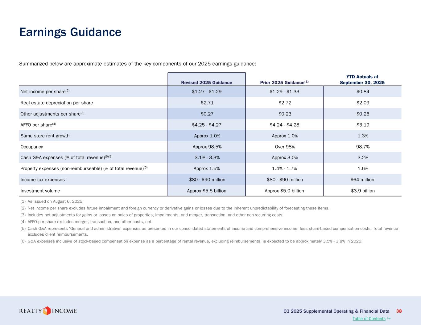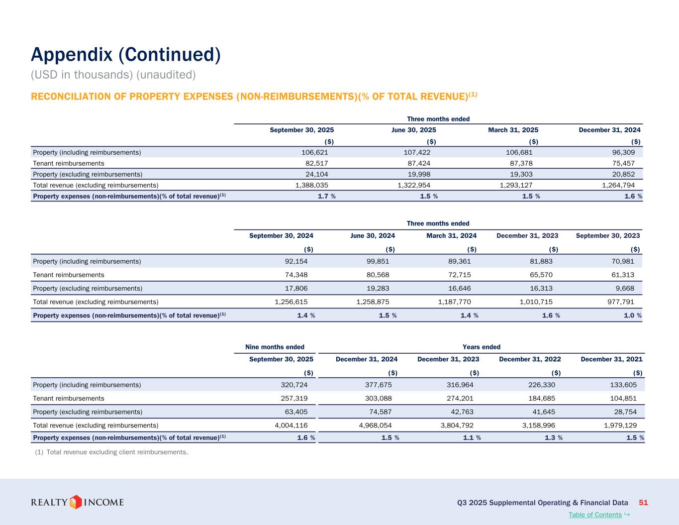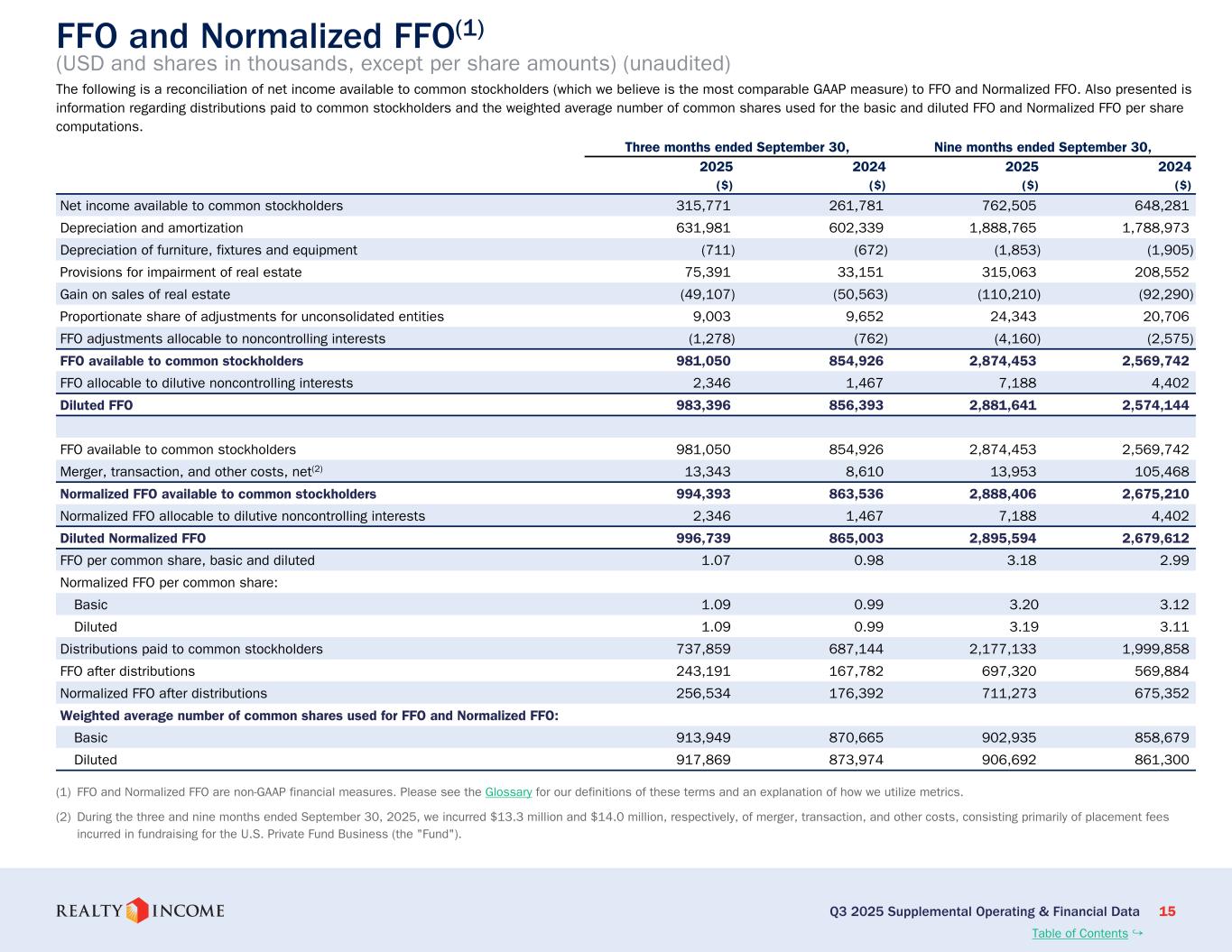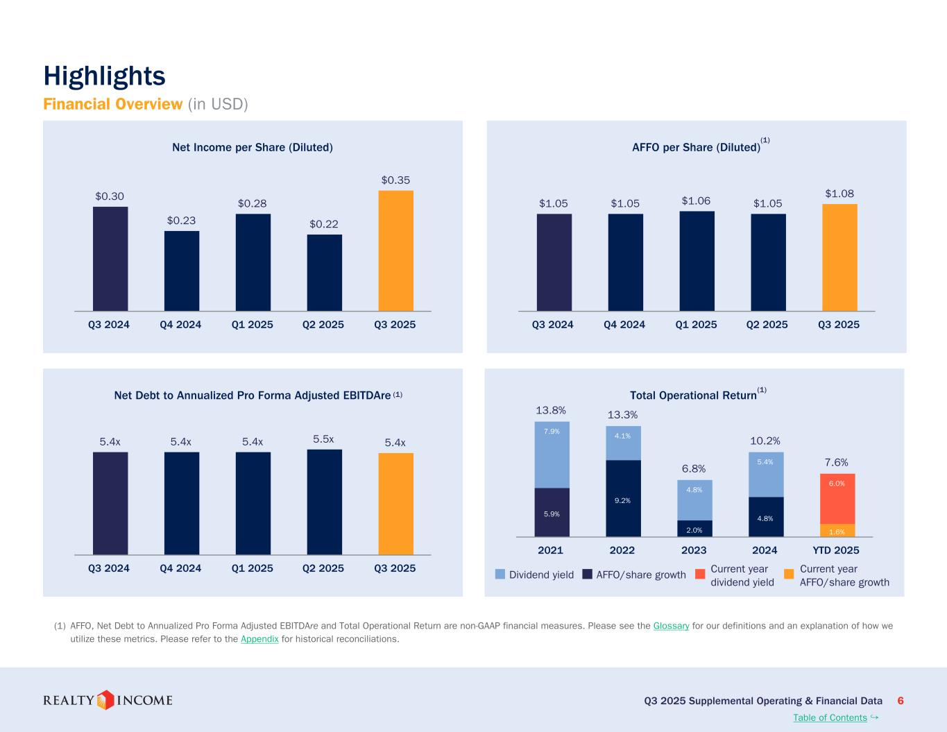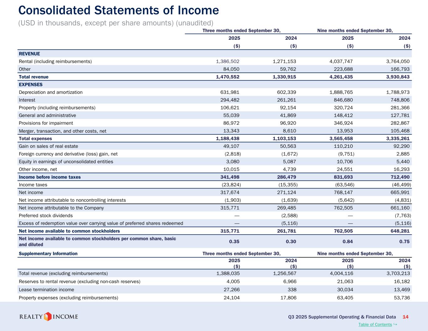 2025年第三季度补充经营和财务数据2前瞻性陈述2025年9月30日前瞻性陈述本补充经营和财务数据演示文稿包含1995年《私人证券诉讼改革法》、经修订的1933年《证券法》第27A条和经修订的1934年《证券交易法》第21E条含义内的前瞻性陈述。在本演示文稿中使用时,“估计”、“预期”、“预期”、“相信”、“打算”、“继续”、“应该”、“可能”、“可能”、“计划”等词语和类似表述旨在识别前瞻性陈述。前瞻性陈述包括讨论我们的业务和投资组合,包括其管理;我们的平台;增长战略、投资管道和收购或处置物业的意图(包括地域、时机、合作伙伴、客户和条款);物业的再租赁、再开发和投机性开发以及与之相关的支出;运营和结果;宣布运营结果、战略、计划和管理层的意图;指导;我们的股份回购计划;根据我们的ATM计划下的远期销售确认出售的普通股股份的结算;股息,包括股息的金额、时间和支付;以及宏观经济和其他业务趋势,包括独立、单一客户物业长期租赁的利率和市场趋势。前瞻性陈述受有关我们的风险、不确定性和假设的影响,这可能导致我们未来的实际结果与预期结果存在重大差异。可能导致实际结果出现重大差异的一些因素包括,除其他外,我们作为房地产投资信托基金的持续资格;一般国内外业务、经济或金融状况;竞争;波动的利率和汇率;通货膨胀及其对我们的客户和我们的影响;进入债务和股权资本市场以及其他资金来源(包括此类资金的条款和合作伙伴);信贷和金融市场的波动性和不确定性;房地产业务固有的其他风险,包括我们的客户的偿付能力、客户根据租约违约、客户破产增加,与环境事项有关的潜在责任、房地产投资的流动性不足(包括优先购买权或优先要约权)以及自然灾害的潜在损害;我们的房地产资产价值减值;国内外法律及其适用、执行或解释(包括与税法和税率有关)的波动和变化;通过共同投资企业、基金、合资企业、合伙企业和其他安排拥有财产,其中,可能转移或限制我们对基础投资的控制权;流行病或流行病;关键人员的损失;我们作为当事方或未来可能发生的任何法律诉讼的结果;恐怖主义和战争行为;以及合并、收购、共同投资企业、基金、合资企业、合伙企业和其他安排的预期收益;以及我们向美国证券交易委员会提交的报告中讨论的那些额外风险和因素。告诫读者不要过分依赖前瞻性陈述。前瞻性陈述并非对未来计划和业绩的保证,仅在本演示文稿发布之日发表。过去的经营业绩和业绩仅供参考,并非对未来业绩的保证。不能保证历史趋势会持续下去。实际计划和经营成果可能与本演示文稿中表达或预测的内容存在重大差异,本演示文稿中讨论的前瞻性陈述中做出的预测可能无法实现。我们不承担任何义务更新前瞻性陈述或公开发布任何前瞻性陈述的结果,以反映这些陈述作出之日之后的事件或情况。附加信息本补充经营和财务数据应与公司截至2025年9月30日止三个月和九个月的收益新闻稿(包括作为公司于2025年11月3日提交的8-K表格当前报告的附件 99.1)一起阅读,因为该等公告中的某些披露、定义和调节并未包含在本补充经营和财务数据的列报中。此处包含的第三方徽标或引用仅供说明之用。Realty Income与图示或提及的客户或其产品或服务无关联或关联,不受背书,不背书,也不是由客户或其赞助商赞助或赞助。名字, logo,以及所有相关的产品和服务名称、设计标记、标语均为其各自所有者的商标或服务标记。目 录↪
