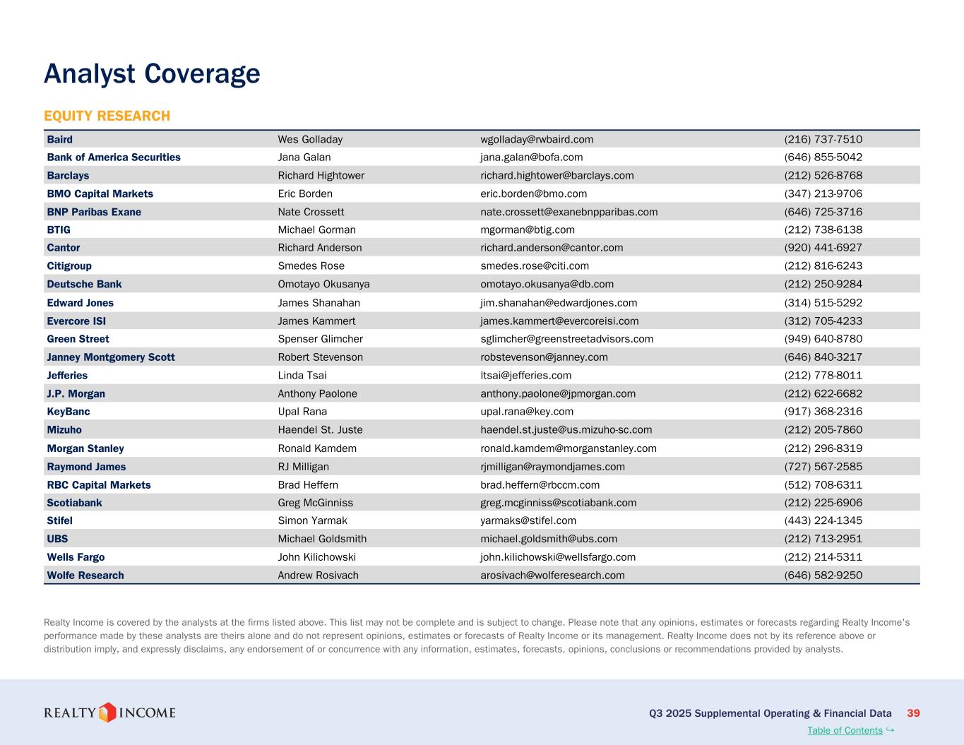 2025年第三季度补充运营和财务数据39 Baird Wes Golladay wgolladay@rwbaird.com(216)737-7510美银证券Jana Galan jana.galan@bofa.com(646)855-5042 巴克莱银行 Richard Hightower richard.hightower@barclays.com(212)526-8768 BMO资本市场Eric Borden eric.borden@bmo.com(347)213-9706 BNP Paribas Exane Nate Crossett nate.crossett@exanebnpparibas.com(646)725-3716 BTIG Michael Gorman mgorman@btig.com(212)738-6138 Cantor TERM0 Richard Anderson Richard Anderson richard.anderson@cantor.com(9Linda Tsai ltsai@jefferies.com(212)778-8011 J.P. Morgan Anthony Paolone anthony.paolone@jpmorgan.com(212)622-6682 KeyBanc Upal Rana upal.rana@key.com(917)368-2316 Mizuho Haendel St. Juste haendel.st.juste@us.mizuho-sc.com(212)205-7860 摩根士丹利 Ronald Kamdem ronald.kamdem@morganstanley.com(212)296-8319 Raymond James RJ Milligan rjmilligan@raymondjames.com(727)567-2585加拿大皇家银行资本市场Brad Heffern brad.heffern@rbccm.com这份清单可能不完整,可能会发生变化。请注意,这些分析师就Realty Income的业绩所作的任何意见、估计或预测均系其个人独立做出,并不代表对Realty Income或其管理层的意见、估计或预测。Realty Income并不因其上述提及或分配而暗示,并且明确否认对分析师提供的任何信息、估计、预测、意见、结论或建议作出任何背书或赞同。分析师覆盖股票研究目录↪