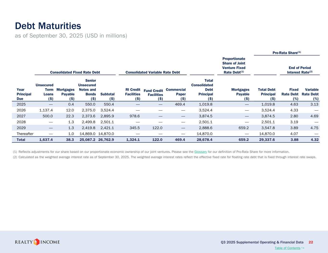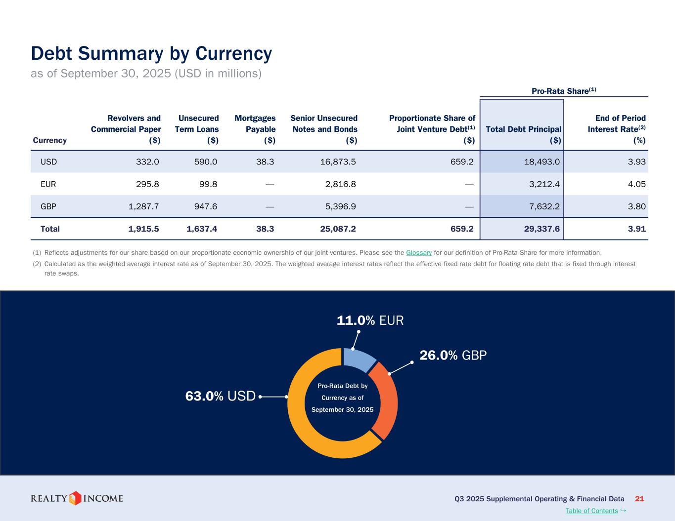 2025年Q3补充经营和财务数据19截至2025年9月30日的资本化和财务比率(百万美元,千股,每股数据除外)债务合并本金(美元)按比例份额计算的总额(1)(美元)高级无抵押票据和债券25,087.225,087.2无抵押定期贷款1,637.41,637.4循环和商业票据1,915.51,915.5应付抵押贷款38.36 97.5小计28,678.429,337.6股本/单位股价(美元)市值(美元)普通股(2)919,89360.79 55,920.3普通单位(3)2,682 60.79 163.0小计56,083.3总市值85,420.9资本化股息数据年初至今2025年年初至今2024年同比增长率(%)每股支付的普通股息$ 2.4085 $ 2.33 503.1 AFFO每股(稀释后)$ 3.19 $ 3.14 1.6 AFFO派息率75.5% 74.4%流动性(4)现金和现金等价物$ 417.2信贷安排下的可用性(5)2,675.9未结算ATM远期864.2减:商业票据借款(469.4)总计$ 3,487.9外币敞口总市值按比例债务权益$ 85,421 $ 29,338 $ 56,083非美元,37.0%非美元,12.7%美元,63.0%美元,87.3%美元,100%股权$ 56,083按比例债务$ 29,338现金和现金等价物$(417)企业价值(6)总市值:$ 85,421企业价值总额:$ 85,004(1)反映了基于我们对合资企业的比例经济所有权对我们份额的调整。有关更多信息,请参阅我们对Pro-Rata Share的定义的词汇表。(2)截至2025年11月3日,总额为1770万股的ATM远期协议仍未结算,预计总收益净额约为10亿美元(假设所有已发行普通股的全部实物结算,但须遵守远期销售协议和就结算日期作出的某些假设)。(三)由第三方持有的、由Realty Income有限合伙企业发行的普通单位组成。(4)我们使用我们的无担保左轮手枪作为偿还根据我们的商业票据计划发行的票据的流动性支持。(5)截至2025年9月30日,我们在信贷安排下的可用性是通过总容量为40亿美元的Realty Income循环信贷安排(“RI信贷安排”)提供的。(6)企业总价值是总市值减去现金和现金等价物。目 录↪