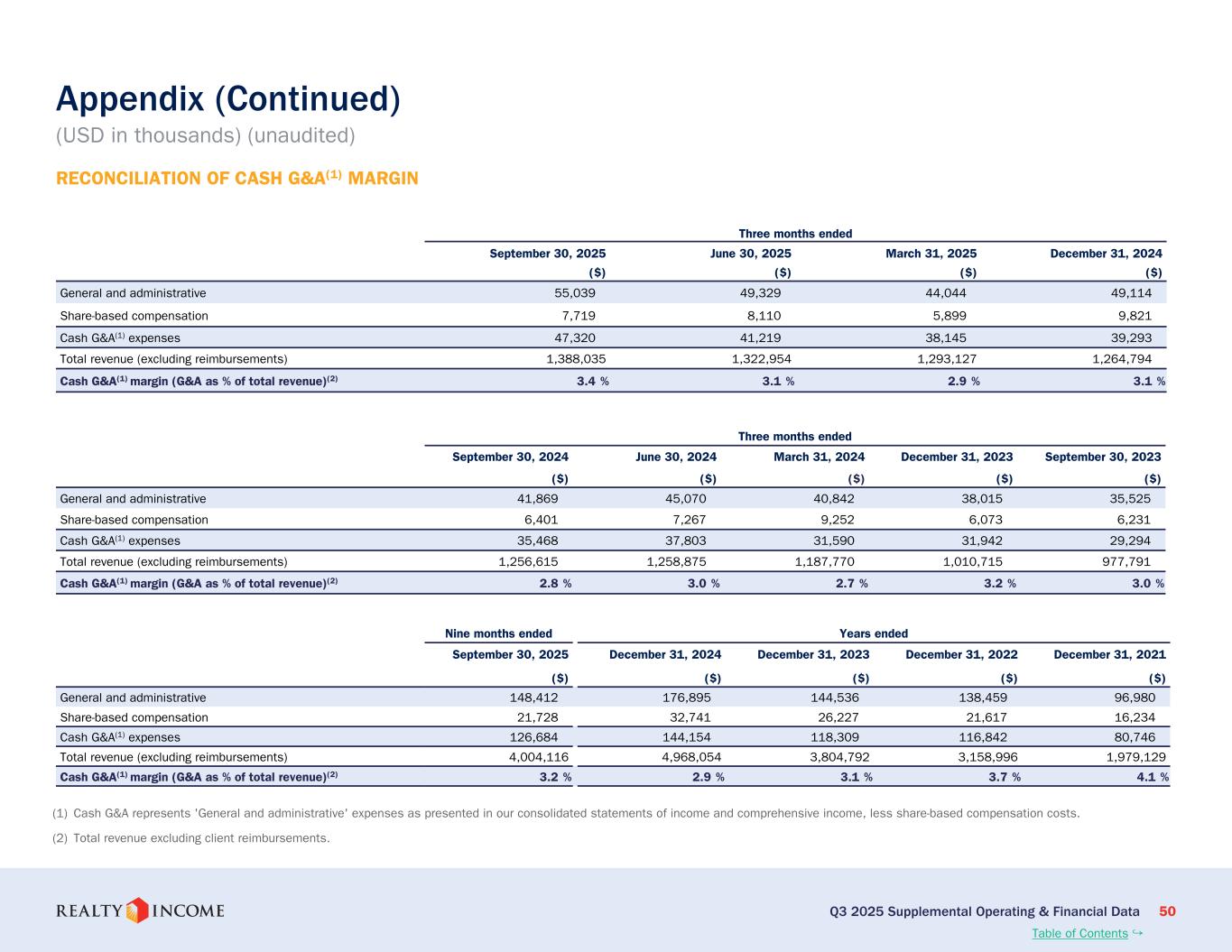 2025年Q3补充经营&财务数据50附录(续)(单位:千美元)(未经审计)目录↪截至2025年9月30日止九个月2024年12月31日2023年12月31日2022年12月31日,2021($)($)($)($)($)一般和行政148,412176,895144,536138,45996,980股份补偿21,72832,74126,22721,61716,234现金G & A(1)费用126,684144,154118,309116,84280,746总收入(不包括报销)4,004,1164,968,0543,804,7923,158,9961,979,129现金G & A(1)利润率(G & A占总收入的百分比)(2)3.2% 2.9% 3.1% 3.7% 4.1%现金G & A对账(1)利润率(1)现金G & A是我们综合收益和综合收益表中列报的“一般和行政”费用,减去股份补偿成本。(2)不含客户报销的总收入。截至2025年9月30日止三个月2025年6月30日2025年3月31日2024年12月31日($)($)($)一般及行政55,03949,32944,04449,114股份酬金7,7198,1105,8999,821现金G & A(1)开支47,32041,21938,14539,293总收入(不包括报销)1,388,0351,322,9541,293,1271,264,794现金G & A(1)利润率(G & A占总收入的百分比)(2)3.4% 3.1% 2.9% 3.1%截至2024年9月30日止三个月2024年6月30日2024年3月31日2023年12月31日9月30日,2023($)($)($)($)一般和行政41,86945,07040,84238,01535,525股份报酬6,4017,2679,2526,0736,231现金G & A(1)费用35,46837,80331,59031,94229,294总收入(不含报销)1,256,6151,258,8751,187,7701,010,715977,791现金G & A(1)利润率(G & A占总收入的百分比)(2)2.8% 3.0% 2.7% 3.2% 3.0%