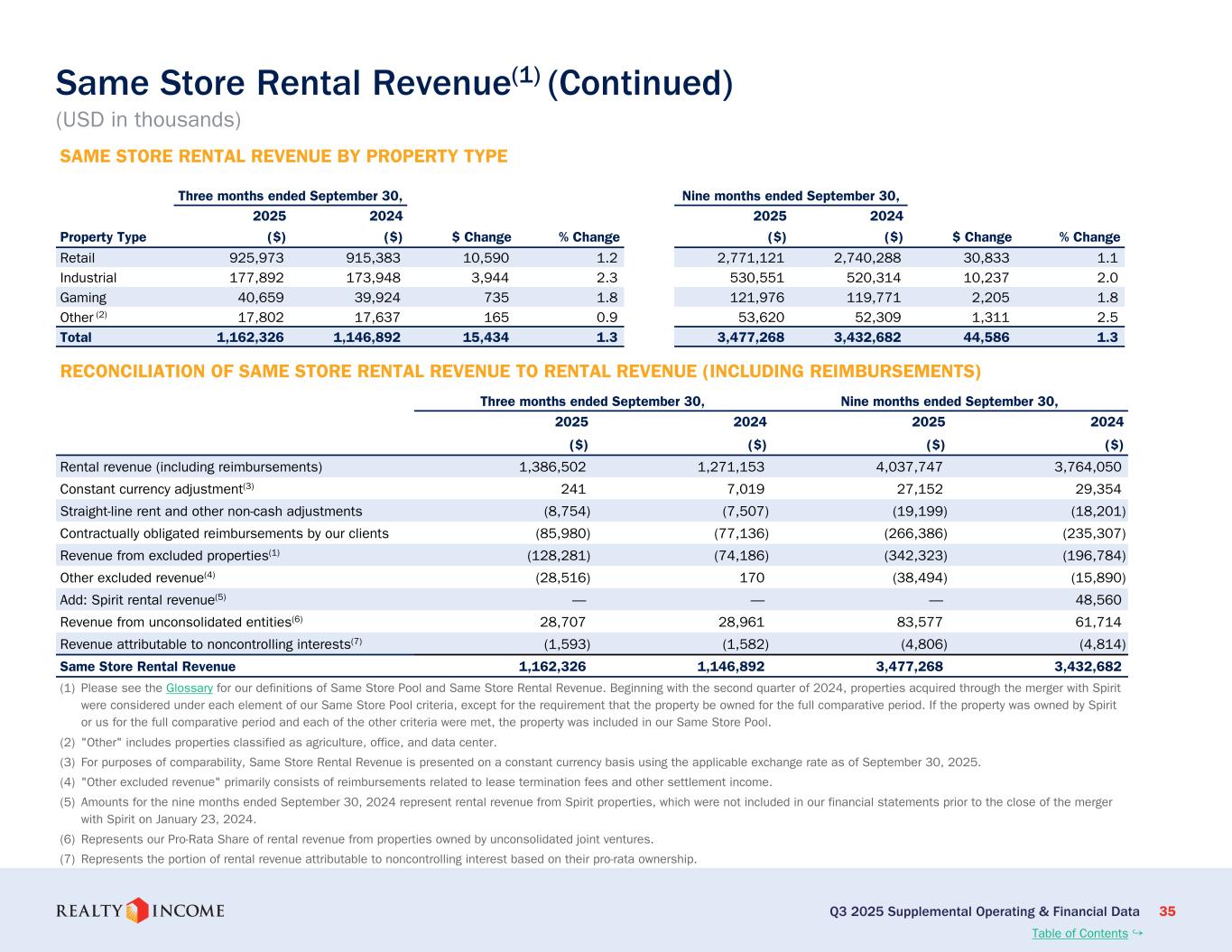 2025年第三季度补充运营和财务数据342025年第三季度同店租金收入物业数量14,482 Q3 2025 $ 1,162,326 Q3 2024 $ 1,146,892 $变化$ 15,434%变化1.3%年初至今2025同店租金收入物业数量14,482年初至今2025 $ 3,477,268年初至今2024 $ 3,432,682 $变化$ 44,586%变化1.3%促成变化的前3个行业(3)截至9月30日的三个月,行业20252024 $变化%变化($)($)杂货$ 126,663 $ 124,3482,3151.9影院27,59226,2131,3795.3便利店107,648106,4021,2461.2截至9月30日的九个月,行业20252024 $变化%变化($)($)杂货$ 378,343 $ 371,0887,2552.0便利店321,759317,1614,5981.4影院81,80177,7324,0695.2为便于比较,同店租金收入采用截至2025年9月30日的适用汇率按固定货币基准列报。(1)请看词汇表了解我们对同店池和同店租金收入的定义。波兰和荷兰的所有物业在所述期间均未达到我们的同店池定义。从2024年第二季度开始,通过与Spirit合并获得的物业被考虑在我们的同店池标准的每个要素下,但该物业在整个比较期间拥有的要求除外。如果该物业在整个比较期间由Spirit或我们拥有,并且满足其他每一项标准,则该物业被纳入我们的同店池。(2)同店租金收入包括我们按比例分享的未合并合资企业拥有的物业的租金收入,以及根据各自所有权百分比归属于非控股权益的金额。(3)前3名行业贡献者基于期间净变化的绝对值。同店租金收入(1)(2)(千美元)目录↪