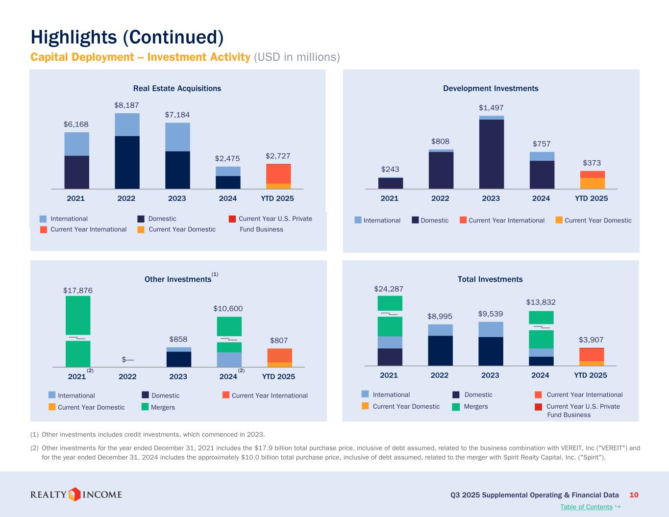 2025年第三季度补充运营和财务数据10大亮点(续)资本部署–投资活动(百万美元)房地产收购6,168美元8,187美元7,184美元2,475美元2,727美元2021202220232024年初至今2025发展投资243美元808美元1,497美元757美元373美元国内国际2021202220232024年初至今2025其他投资3,000美元— 858美元2,132美元807美元国内国际并购2021202220232024年初至今2025(1)目录↪国际国内当年国际当年国内并购总投资$ 8,995 $ 9,539 $ 11,864 $ 3,907国内国际美国核心基金并购2021202220232024 YTD 2025(2)(2)$ 17,876 $ 10,600 $ 24,287国际国内当年美国私人当年国际当年国内基金业务国际国内当年国际当年国内3,32(1)其他投资包括信贷投资,于2023年开始。(2)截至2021年12月31日止年度的其他投资包括与VEREIT,Inc(“VEREIT”)的业务合并相关的179亿美元的总购买价格(包括承担的债务),截至2024年12月31日止年度的其他投资包括与与与Spirit Realty Capital, Inc.(“Spirit”)的合并相关的约100亿美元的总购买价格(包括承担的债务)。国际国内当年国际当年国内合并当年美国私募基金业务