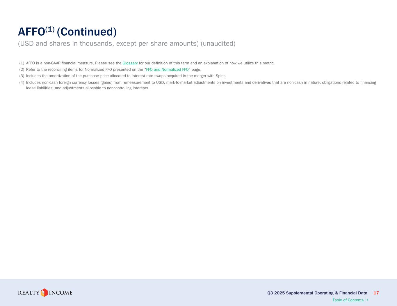 2025年第三季度补充运营和财务数据17(1)AFFO是一种非GAAP财务指标。请参阅词汇表,了解我们对这个术语的定义以及我们如何利用这个指标的解释。(2)参考“FFO和常态化FFO”页面上展示的常态化FFO调节项目。(3)包括在与Spirit合并中获得的分配给利率掉期的购买价格的摊销。(4)包括重新计量为美元的非现金外币损失(收益)、非现金性质的投资和衍生工具的按市值调整、与融资租赁负债相关的义务以及可分配给非控制性权益的调整。AFFO(1)(续)(美元和股份单位:千,每股金额除外)(未经审计)目录↪