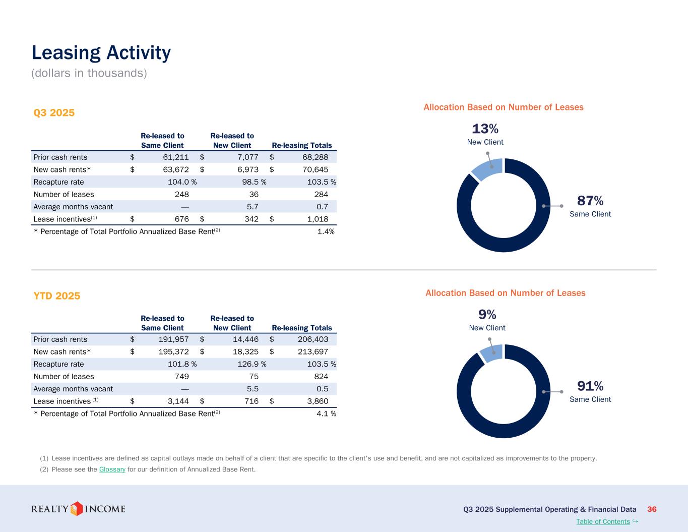 2025年第三季度补充运营和财务数据362025年第三季度再租赁给同一客户再租赁给新客户再租赁总额先前现金租金$ 61,211 $ 7,077 $ 68,288新现金租金*$ 63,672 $ 6,973 $ 70,645回收率104.0% 98.5% 103.5%租赁数量24836284平均空置月— 5.7 0.7租赁奖励(1)$ 676 $ 342 $ 1,018*占总投资组合年化基本租金(2)的百分比1.4%年初至今2025年再租赁给同一客户再租赁给新客户再租赁总额先前现金租金$ 191,957 $ 14,446 $ 206,403新现金租金*$195,372美元18,325美元213,697美元回收率101.8% 126.9% 103.5%租赁数量74975824平均空置月— 5.5 0.5租赁奖励(1)3,144美元716美元3,860美元*占总投资组合年化基本租金的百分比(2)4.1%租赁活动(千美元)基于租赁数量的分配87%相同客户13%基于租赁数量的新客户分配9%新客户91%相同客户(1)租赁激励定义为代表客户进行的特定于客户的使用和利益的资本支出,并且不被大写为对物业的改进。(2)我们对年化基租的定义请看词汇表。目 录↪