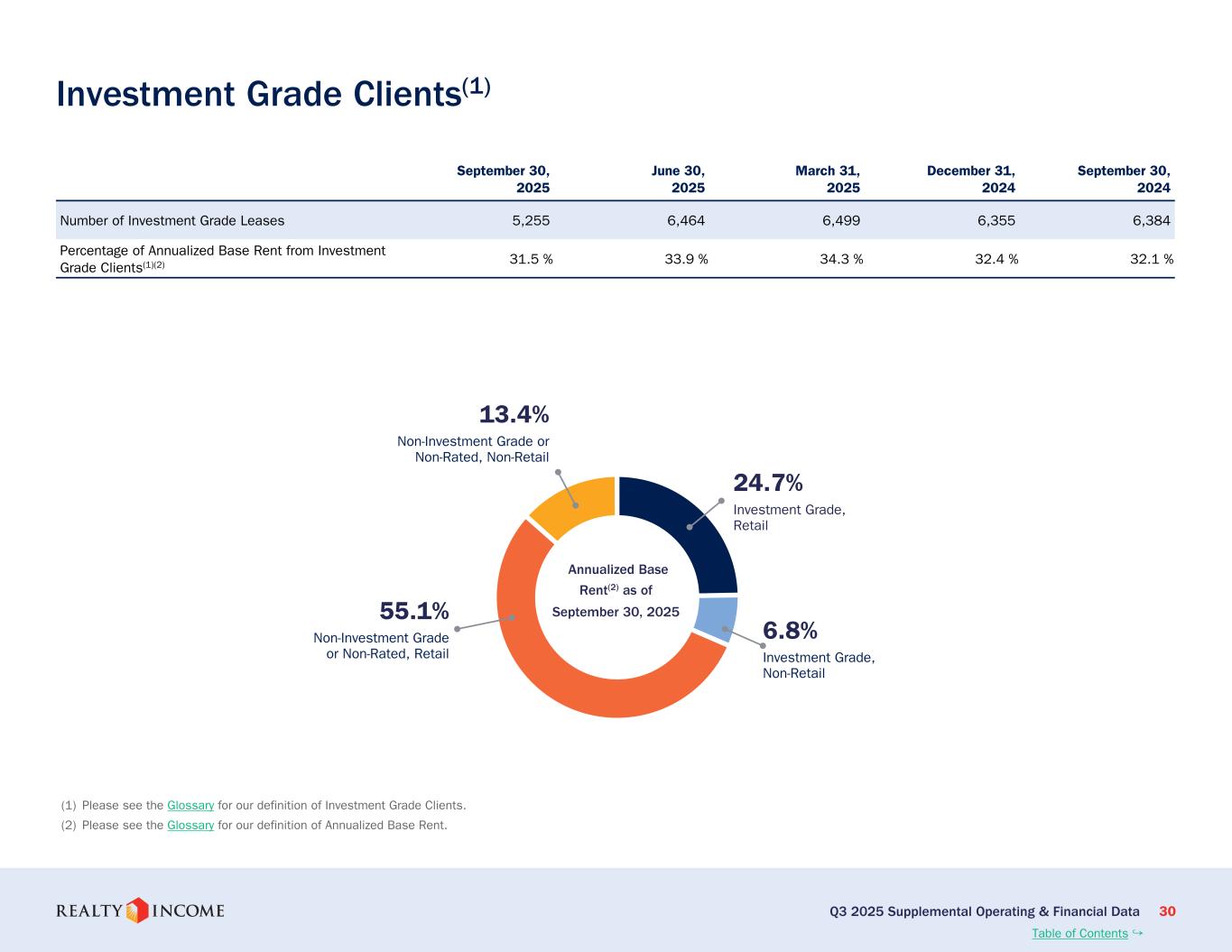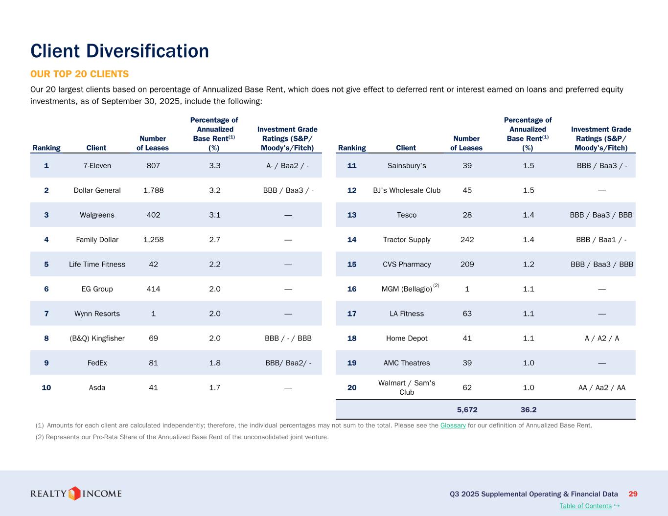 2025年Q3补充运营和财务数据29排名客户租赁数量占年化基础租金的百分比(1)(%)投资级评级(标普/穆迪/惠誉)1 7-Eleven 8073.3 A-/Baa2/-2 达乐 1,7883.2 BBB/Baa3/-3 Walgreens 4023.1 — 4 Family Dollar 1,2582.7 — 5 生活时间健身 422.2 — 6 EG Group 4142.0 — 7 Wynn Resorts 永利度假村 12.0 — 8(B & Q)Kingfisher 692.0 BBB/-/BBB 9 Fedex 811.8 BBB/Baa2/-10 Asda 411.7 —客户多元化OUR TOP 20客户我们的20个最大客户基于年化基本租金的百分比,其中不影响递延租金或贷款和优先股投资赚取的利息,截至2025年9月30日,包括以下内容:(1)每个客户的金额是独立计算的;因此,个别百分比可能不加总。我们对年化基租的定义请看词汇表。(2)代表我们在未合并合资企业的年化基本租金中的按比例份额。目 录↪排名客户租赁数量占年化基础租金的百分比(1)(%)投资级评级(标普/穆迪/惠誉)11 Sainsbury‘s 391.5 BBB/Baa3/-12 BJ’s Wholesale Club 451.5 — 13 Tesco 281.4 BBB/Baa3/BBB 14 牵引机供销 2421.4 BBB/Baa1/-15 CVSTERM4药房2091.2 BBB/Baa3/BBB 16 MGM(Bellagio)11.1 — 17 LA Fitness 631.1 — 18 Home Depot 411.1 A/A2/A19 AMC丨剧院391.0 — 20沃尔玛/山姆会员店621.0 AA/AA2/AA 5,67236.2(2)