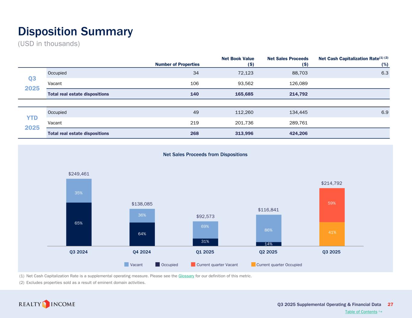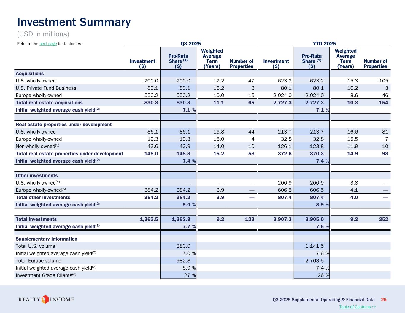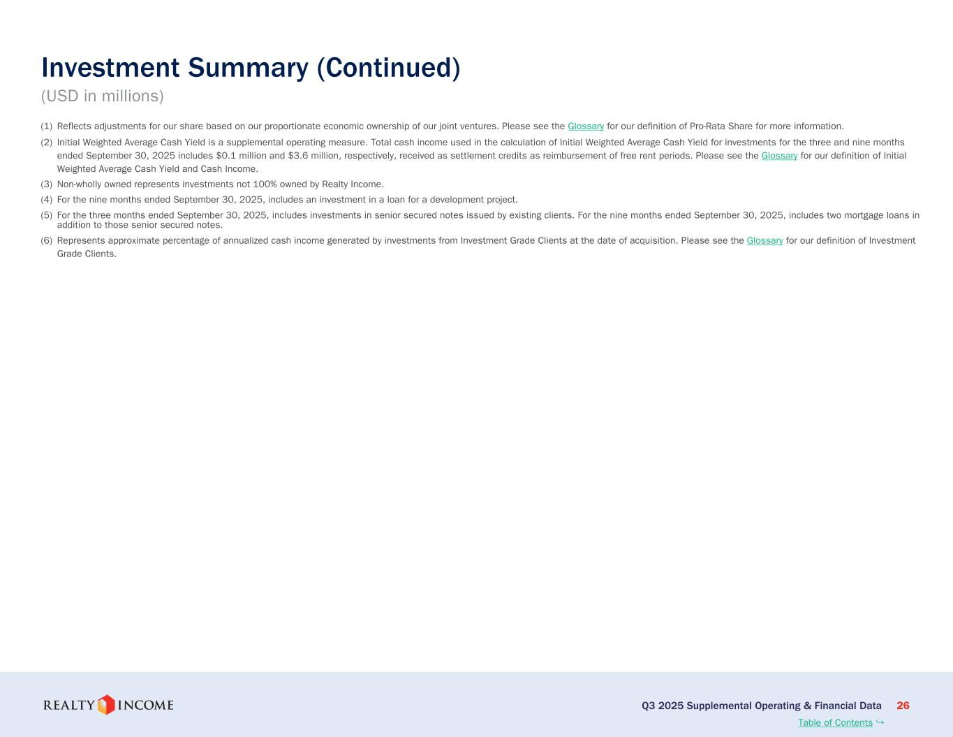 2025年Q3补充经营&财务数据26投资摘要(续)(百万美元)目录↪(1)反映根据我们对合资企业的比例经济所有权对我们的份额进行的调整。有关更多信息,请参阅我们对Pro-Rata Share的定义的词汇表。(2)初始加权平均现金收益率是一种补充性经营措施。用于计算截至2025年9月30日止三个月和九个月投资的初始加权平均现金收益率的现金收入总额分别包括作为结算贷项收到的10万美元和360万美元,作为免费租金期间的偿还。请看词汇表,了解我们对初始加权平均现金收益率和现金收入的定义。(3)非全资拥有指并非由Realty Income 100%拥有的投资。(4)截至2025年9月30日止九个月,包括一项发展项目贷款的投资。(5)截至2025年9月30日止3个月,包括现有客户发行的优先担保票据投资。截至2025年9月30日止九个月,除这些优先担保票据外,还包括两笔抵押贷款。(6)表示在取得日来自投资级客户的投资所产生的年化现金收入的大致百分比。请看我们对投资级客户定义的词汇表。