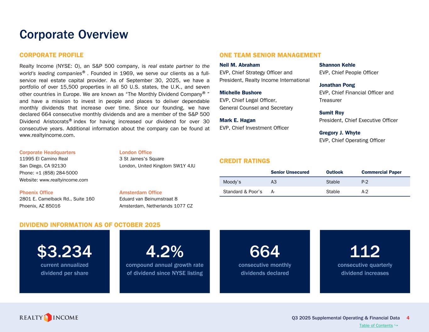 2025年第三季度补充运营和财务数据4公司概况公司简介Realty Income(NYSE:O)是一家标普500指数成份股公司,是世界领先公司的房地产合作伙伴®.我们成立于1969年,作为全方位服务的房地产资本提供者服务于我们的客户。截至2025年9月30日,我们在美国所有50个州、英国和欧洲其他七个国家拥有超过15,500处房产的投资组合。我们被称为“每月分红公司®”,并肩负着投资于人和地方的使命,以提供可靠的每月股息,随着时间的推移而增加。自创立以来,我们已连续宣布每月分红664次,是标普 500红利贵族的一员®连续30多年增加股息的指数。有关该公司的更多信息,请访问www.realtyincome.com。公司总部11995 El Camino Real San Diego,加利福尼亚州 92130电话:+ 1(858)284-5000网站:www.realtyincome.com Phoenix Office 2801 E. Camelback Rd.,Suite 160 Phoenix,AZ 85016 London Office 3 St James's Square London,United Kingdom SW1Y 4JU Amsterdam Office Eduard van Beinumstraat 8 Amsterdam,Netherlands 1077 CZ ONE Team高级管理人员丨Neil M. Abraham Neil M. Abraham执行副总裁、首席战略官兼Realty Income International总裁丨Michelle Bushore Michelle Bushore执行副总裁、首席法务官、总法律顾问和秘书Mark E. Hagan执行副总裁、首席投资官Shannon Kehle执行副总裁、首席人事官Jonathan Pong首席执行官Gregory J. Whyte执行副总裁、首席运营官信用评级高级无抵押展望商业票据穆迪A3稳定P-2标准普尔A-稳定A-2股息信息截至2025年10月3.234美元当前年化每股股息664个月连续股息宣布112个季度股息连续增长4.2%自纽交所上市以来的股息年复合增长率目录↪