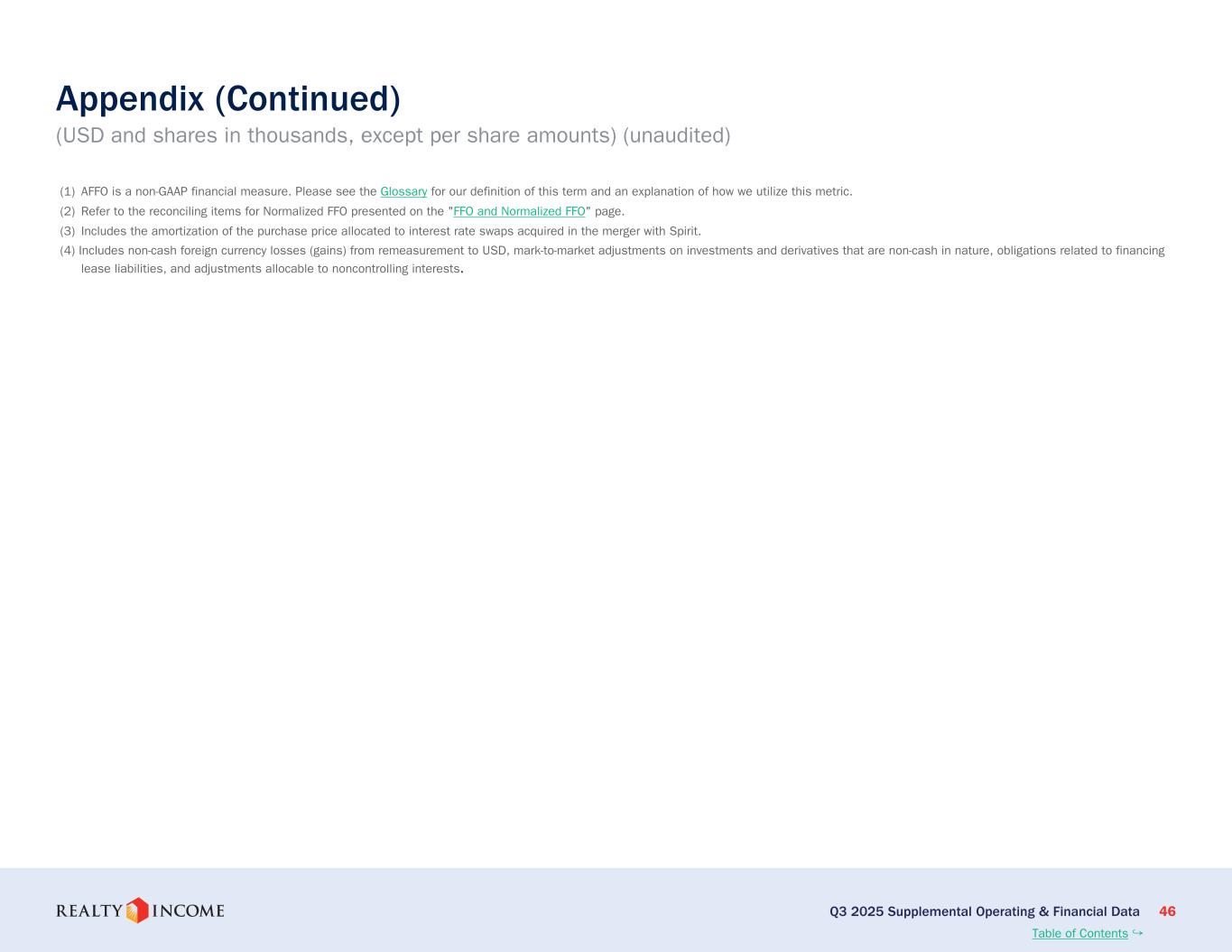 2025年Q3补充经营&财务数据46目录↪附录(续)(美元和股票以千为单位,每股金额除外)(未经审计)(1)AFFO是一种非GAAP财务指标。请参阅词汇表,了解我们对这个术语的定义以及我们如何利用这个指标的解释。(2)参考“FFO和常态化FFO”页面上展示的常态化FFO调节项目。(3)包括在与Spirit合并中获得的分配给利率掉期的购买价格的摊销。(4)包括重新计量为美元的非现金外币损失(收益)、非现金性质的投资和衍生工具按市值调整、与融资租赁负债相关的义务以及可分配给非控制性权益的调整。