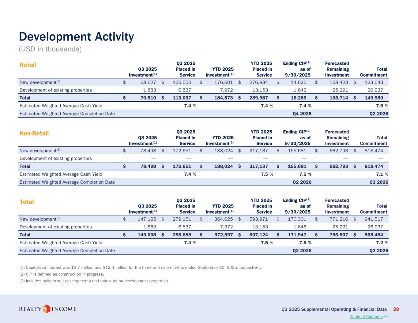2025年Q3补充经营&财务数据28发展活动(千美元)零售2025年Q3投资(1)2025年Q3投入服务年初至今2025年投资(1)2025年年初至今投入服务结束CIP(2)截至2025年9月30日预测剩余投资总承诺新开发项目(3)68,627美元106,500美元176,601美元276,834美元14,620美元108,423美元123,043美元现有物业开发项目1,8836,5377,97213,1531,64625,29126,937美元总计70,510美元113,037美元184,573美元289,987美元16,266美元133,714美元149,980美元估计加权平均现金收益率7.4% 7.4% 7.4% 7.4% 7.6%估计加权平均完成日期Q4 2025 Q2 2026非零售Q3 2025投资(1)Q3 2025投入服务年初至今投资(1)YTD 2025投入服务结束CIP(2)截至2025年9月30日预测剩余投资总额承诺新开发项目(3)78,498美元172,651美元188,024美元317,137美元155,681美元662,793美元818,474美元现有物业开发————————总额78,498美元172,651美元188,024美元317,137美元155,681美元662,793美元818,474美元估计加权平均现金收益率7.4% 7.5% 7.5% 7.1%估计加权平均完成日期Q2 2026 Q3 2026 Q3 2025 Q3投资总额(1)Q3 2025投入服务YTD 2025投资(1)YTD 2025投入服务结束CIP(2)截至2025年9月30日预测剩余投资承诺总额新开发(3)147,125美元279,151美元364,625美元593,971美元170,301美元771,216美元941,517现有物业开发1,8836,5377,97213,1531,64625,29126,937总计149,008美元285,688美元372,597美元607,124美元171,947美元796,507美元968,454美元估计加权平均现金收益率7.4% 7.5% 7.5% 7.2%估计加权平均完成日期2026年第二季度2026年第二季度(1)截至2025年9月30日止三个月和九个月的资本化利息分别为370万美元和1240万美元。(2)CIP定义为在建工程。(3)包括定制开发和开发物业的外卖。目 录↪