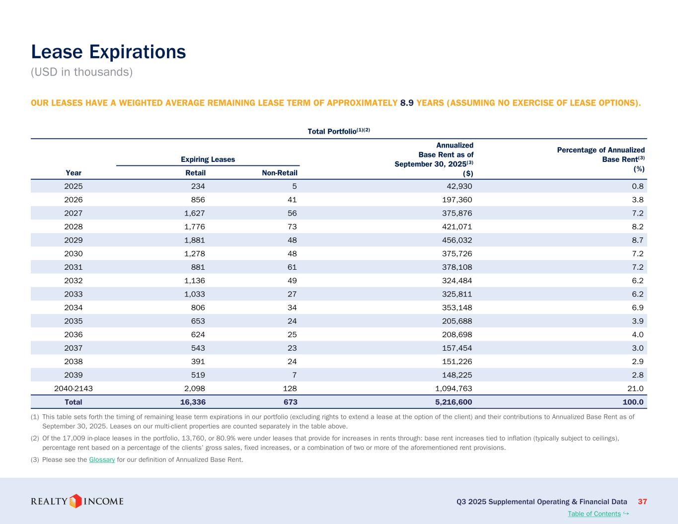 2025年第三季度补充运营和财务数据37(1)本表列出了我们投资组合中剩余租期到期的时间(不包括客户选择延长租约的权利)及其截至2025年9月30日对年化基本租金的贡献。我们的多客户物业的租赁在上表中单独计算。(2)在投资组合中的17,009份就地租赁中,有13,760份,即80.9%是通过以下方式提供租金上涨的租赁:与通货膨胀挂钩的基本租金上涨(通常受制于上限)、基于客户总销售额百分比的百分比租金、固定增加,或上述两项或多项租金规定的组合。(3)我们对年化基租的定义请看词汇表。我们的租赁的加权平均剩余租赁期限约为8.9年(假设未行使租赁选择权)。租约到期(千美元)总投资组合(1)(2)截至9月30日的年化基本租金,2025(3)($)年化基本租金百分比(3)(%)到期租赁年份零售非零售2025234542,9300.8 202685641197,3603.8 20271,62756375,8767.2 20281,77673421,0718.2 20291,88148148456,0328.7 20301,27848375,7267.2 203188161378,1087.2 20321,13649324,4846.2 20331,03327325,8116.2 203480634353,1486.9 203565324205,6883.9 203662425208,6984.0 203754323157,4543.0 203839124151,2262.9 20395197148,2252.8 2040-2143 2,0981281,094,内容↪