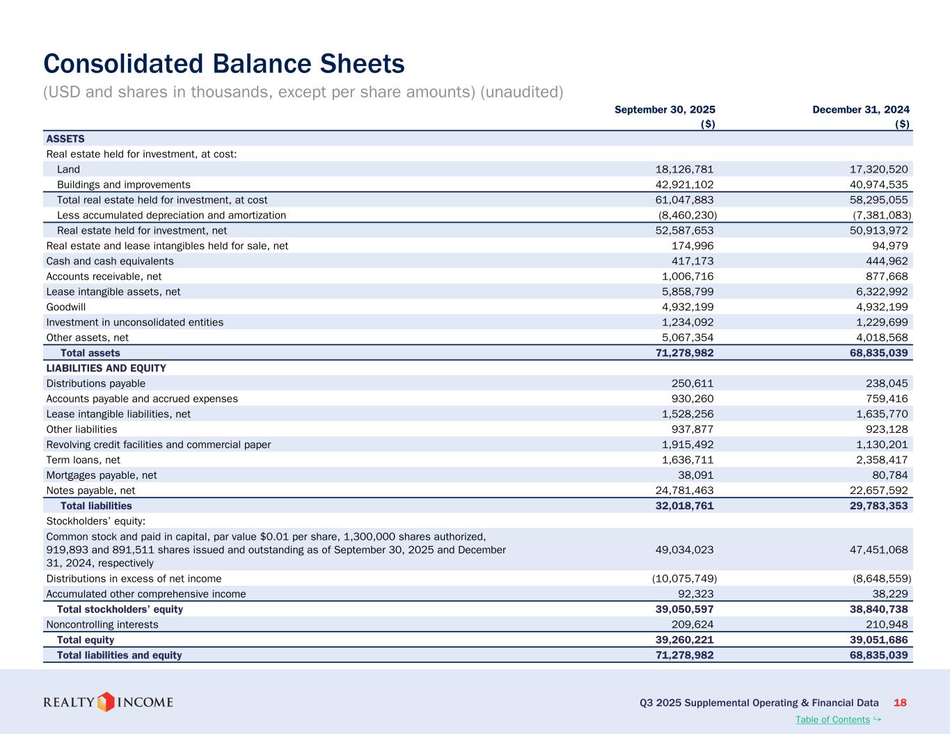2025年第三季度补充经营和财务数据2025年9月30日18日2024年12月31日(美元)(美元)资产按成本持有用于投资的不动产:土地18,126,78117,320,520建筑物和装修42,921,10240,974,535按成本持有用于投资的不动产总额61,047,88358,295,055减累计折旧和摊销(8,460,230)(7,381,083)持作投资的不动产净额52,587,65350,913,972持作出售的不动产和租赁无形资产净额174,99694,979现金及现金等价物417,173444,962应收账款净额1,006,716877,668租赁无形资产净额5,858,7996,322,992商誉4,932,1994,932,净额5,067,3544,018,568总资产71,278,98268,835,039应付负债和权益分配250,611238,045应付账款和应计费用930,260759,416租赁无形负债,净额1,528,2561,635,770其他负债937,877923,128循环信贷融资和商业票据1,915,4921,130,201定期贷款,净额1,636,7112,358,417应付抵押贷款,净额38,09180,784应付票据,净额24,781,46322,657,592负债总额32,018,76129,783,353股东权益:普通股和实收资本,每股面值0.01美元,授权1,300,000股,截至2025年9月30日和2024年12月31日已发行分别为49,034,02347,451,068分配超过净收益(10,075,749)(8,648,559)累计其他综合收益92,32338,229股东权益总额39,050,59738,840,738非控制性权益209,624210,948总权益39,260,22139,051,686 总负债及权益 71,278,98268,835,039合并资产负债表(美元和股份单位:千,每股金额除外)(未经审计)目录↪