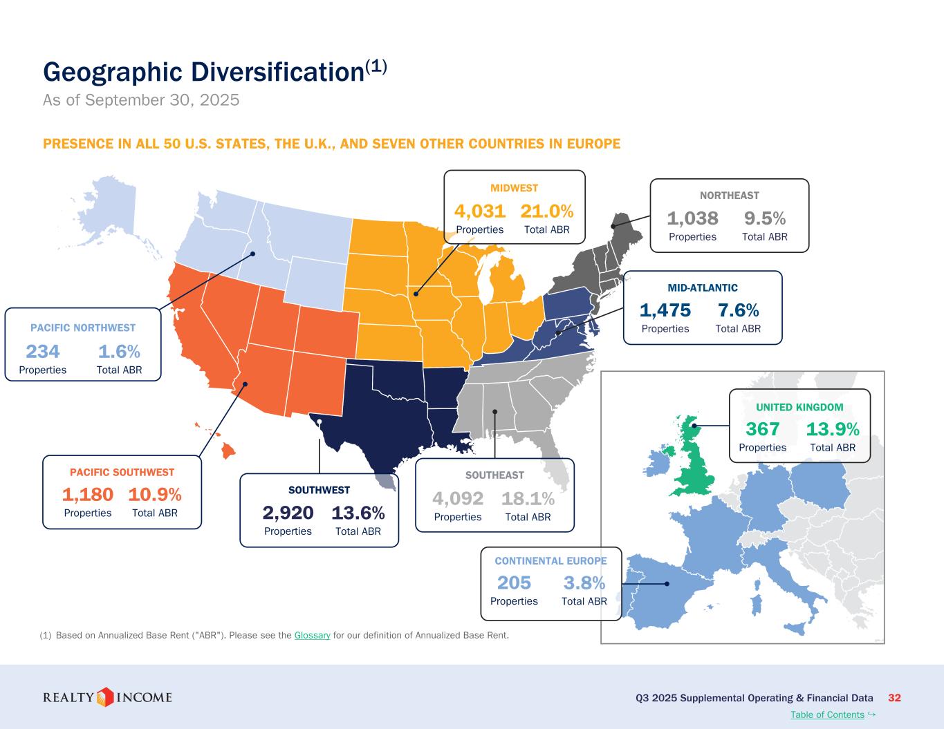 2025年第三季度补充经营和财务数据32地域多元化(1)截至2025年9月30日(1)基于年化基本租金(“ABR”)。我们对年化基租的定义请看词汇表。在美国所有50个州、英国和欧洲其他7个国家的存在中西部4,031处房产21.0% ABR中大西洋西南部2,920处房产13.6% ABR总计1,475处房产东南4,092处房产18.1% ABR欧洲大陆205处房产3.8% ABR东北1,038处房产9.5% ABR总计7.6% ABR太平洋西南部总计1,180处房产10.9% ABR太平洋西北部总计234处房产1.6% ABR英国367处房产总计13.9% ABR目录↪
