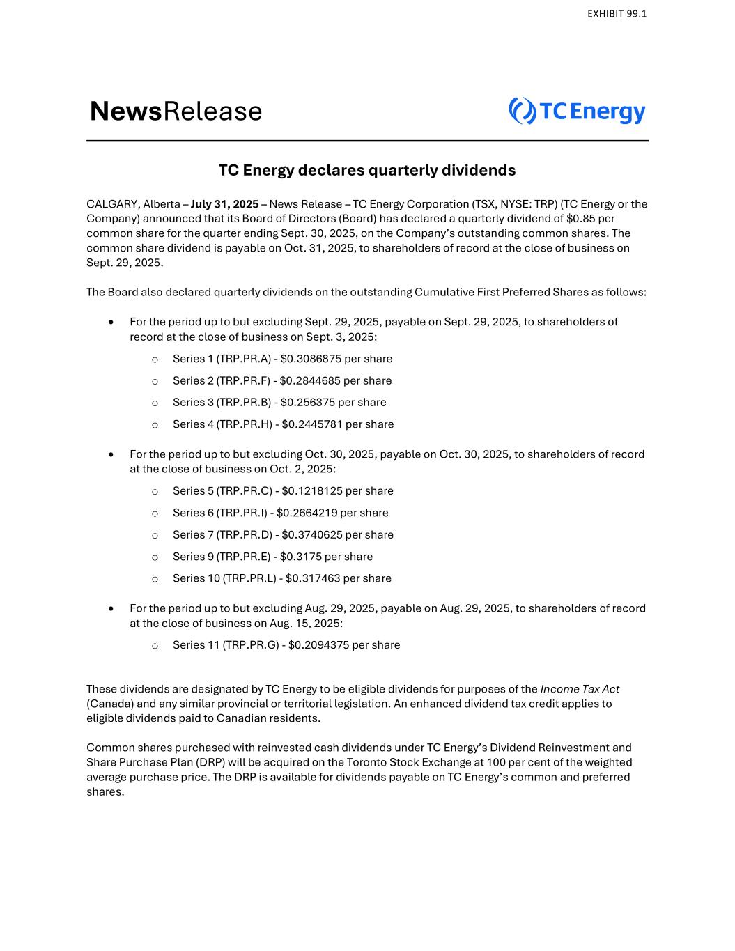 NewsRelease TC Energy宣布季度股息阿尔伯塔省卡尔加里– 2025年7月31日– News Release – TC Energy Corporation(TSX,NYSE:TRP)(TC Energy或公司)宣布,其董事会(董事会)已宣布,该公司已发行普通股的季度股息为截至2025年9月30日的季度每股普通股0.85美元。普通股股息将于2025年10月31日支付给2025年9月29日营业结束时登记在册的股东。董事会还宣布对已发行的累积第一优先股的季度股息如下:•截至但不包括2025年9月29日的期间,于2025年9月29日支付给在2025年9月3日营业结束时登记在册的股东:o系列1(TRP.PR.A)-每股0.3086875美元o系列2(TRP.PR.F)-每股0.2844685美元o系列3(TRP.PR.B)-每股0.256375美元o系列4(TRP.PR.H)-每股0.24 45781美元•截至但不包括2025年10月30日的期间,于2025年10月30日支付,致2025年10月2日收盘时登记在册的股东:o系列5(TRP.PR.C)-每股0.12 18125美元o系列6(TRP.PR.I)-每股0.2664219美元o系列7(TRP.PR.D)-每股0.3740625美元o系列9(TRP.PR.E)-每股0.3175美元o系列10(TRP.PR.L)-每股0.317463美元•截至但不包括2025年8月29日期间,于2025年8月29日支付给8月15日收盘时登记在册的股东,2025年:o系列11(TRP.PR.G)-每股0.2094375美元这些股息被TC Energy指定为符合《所得税法》(加拿大)和任何类似的省或地区立法规定的合格股息。增强的股息税收抵免适用于支付给加拿大居民的合格股息。根据TC Energy的股息再投资和股份购买计划(DRP),以再投资现金股息购买的普通股将在多伦多证券交易所以加权平均购买价格的100%获得。DRP可用于支付TC Energy普通股和优先股的股息。展览99.1