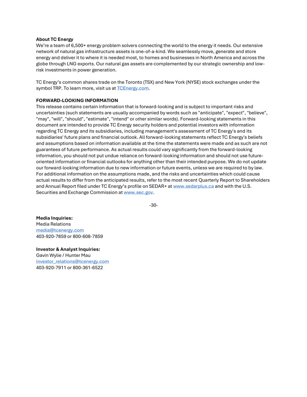 关于TC Energy我们是一个由6500多名能源问题解决者组成的团队,他们将世界与所需的能源连接起来。我们广泛的天然气基础设施资产网络是独一无二的。我们无缝地移动、产生和储存能源,并通过液化天然气出口将其输送到最需要的地方,输送到北美和全球的家庭和企业。我们的天然气资产与我们的战略所有权和发电低风险投资相辅相成。TC Energy的普通股在多伦多(TSX)和纽约(NYSE)证券交易所交易,代码为TRP。要了解更多信息,请访问我们的TCENEnergy.com。前瞻性信息本新闻稿包含某些具有前瞻性并受到重要风险和不确定性影响的信息(此类陈述通常附有诸如“预期”、“预期”、“相信”、“可能”、“将”、“应该”、“估计”、“打算”或其他类似词语)。本文件中的前瞻性陈述旨在为TC Energy证券持有人和潜在投资者提供有关TC Energy及其子公司的信息,包括管理层对TC Energy及其子公司未来计划和财务前景的评估。所有前瞻性陈述都反映了TC Energy基于做出陈述时可获得信息的信念和假设,因此不能保证未来的业绩。由于实际结果可能与前瞻性信息有很大差异,您不应过分依赖前瞻性信息,也不应将面向未来的信息或财务前景用于其预期目的以外的任何事情。我们不会因新信息或未来事件而更新我们的前瞻性信息,除非法律要求我们这样做。有关所做假设的更多信息,以及可能导致实际结果与预期结果不同的风险和不确定性,请参阅最近一次提交给股东的季度报告和根据TC Energy在SEDAR +上的简介(www.sedarplus.ca)以及在美国证券交易委员会(www.sec.gov)上提交的年度报告。-30-媒体查询:Media Relations media@tCENergy.com 403-920-7859或800-608-7859投资者及分析师查询:Gavin Wylie/Hunter Mau investor _ relations@tCENergy.com 403-920-7911或800-361-6522