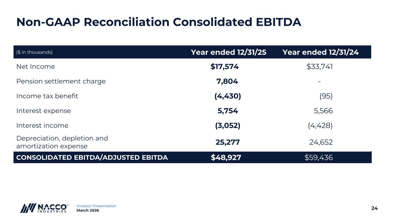 23投资者介绍2026年3月非公认会计准则披露本介绍包含非公认会计准则财务指标。本演示文稿中包括这些非GAAP财务指标与根据美国公认会计原则(“GAAP”)计算的最直接可比财务指标的对账。合并EBITDA、合并调整后EBITDA和分部调整后EBITDA是与根据公认会计原则计量的财务结果不同的收入(亏损)计量。本演示文稿中的合并EBITDA、合并调整后EBITDA和分部调整后EBITDA仅作为非GAAP经营业绩的补充披露提供。管理层认为,这些非公认会计准则财务指标有助于投资者了解纳科工业,Inc.及其子公司的经营业绩,并有助于了解业绩的可比性。此外,管理层使用这些非公认会计准则财务指标评估结果。我们还提供了有关合并EBITDA的某些前瞻性陈述。我们没有将这一前瞻性非GAAP财务指标与相应的GAAP财务指标进行核对,因为没有提供各种核对项目的前景。我们无法提供这些调节项目的展望,因为我们无法确定它们的可能重要性,因为某些项目不在我们的控制范围内,无法合理预测,因为这些项目在不同时期可能会有很大差异。因此,如果没有不合理的努力,就无法与相应的GAAP财务指标进行对账。NACCO对非GAAP衡量标准的定义如下:▪合并EBITDA为所得税前净收入,加上净利息费用和折旧、损耗和摊销费用;▪合并调整后EBITDA是扣除养老金结算费用和所得税前的净收入,加上净利息费用和折旧、损耗和摊销费用;和▪分部调整后EBITDA为分部经营利润(亏损)加上折旧、损耗和摊销费用。
