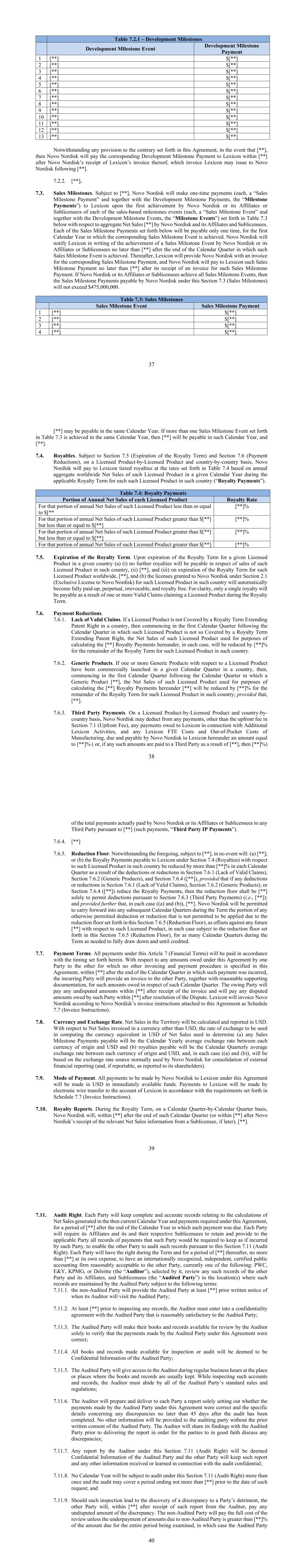 37 Table 7.2.1 – Development Milestones Development Milestone Event Development Milestone Payment 1 [**] $[**] 2 [**] $[**] 3 [**] $[**] 4 [**] $[**] 5 [**] $[**] 6 [**] $[**] 7 [**] $[**] 8 [**] $[**] 9 [**] $[**] 10 [**] $[**] 11 [**] $[**] 12 [**] $[**] 13 [**] $[**】尽管本协定中有任何相反的规定,但如果[**],则诺和诺德将在[内]向Lexicon支付相应的发展里程碑款**】诺和诺德收到Lexicon的发票后,Lexicon可能向诺和诺德开具的哪张发票如下[**].7.2.2.[**].7.3.销售里程碑。受[**],诺和诺德将在以下表7.3所列的每个基于销售的里程碑事件(每个事件,“销售里程碑事件”,并与发展里程碑事件一起,“里程碑事件”)首次实现时,就总的净销售额向Lexicon支付(每个事件,“销售里程碑事件”,与发展里程碑事件一起,“里程碑事件”)[**]由诺和诺德及其关联公司和分许可人提供。下文所列的每一笔销售里程碑付款将只支付一次,用于实现相应销售里程碑事件的第一个日历年度。对于诺和诺德或其关联公司或分许可方达成的销售里程碑事件,诺和诺德将不迟于【**]在实现此类销售里程碑事件的日历季度结束后。此后,Lexicon将向诺和诺德提供相应销售里程碑付款的发票,而诺和诺德将不迟于【**】在其收到此类销售里程碑付款的发票后。如果诺和诺德或其关联公司或子被许可人实现了所有销售里程碑事件,那么诺和诺德根据本条第7.3款(销售里程碑)应支付的销售里程碑付款将不超过475,000,000美元。表7.3:销售里程碑销售里程碑事件销售里程碑支付1 [**] $[**] 2 [**] $[**] 3 [**] $[**] 4 [**] $[**] 38 [**]可能在同一日历年度支付。如果在同一个日历年度实现了表7.3所列的不止一个销售里程碑事件,那么[**】将于该日历年度支付,及[**].7.4.版税。根据第7.5节(特许权使用费期限届满)和第7.6节(减少付款)的规定,根据许可产品逐个许可产品和逐个国家的基础上,诺和诺德将按照表7.4中规定的费率向Lexicon支付分级特许权使用费,费率基于每个许可产品在给定日历年在该国家的每个此类许可产品的适用特许权使用费期限内的年度总全球净销售额(“特许权使用费”)。表7.4:每个许可产品年度净销售额的特许权使用费部分此类许可产品年度净销售额低于或等于$ [**[**]%对于此类许可产品的年度净销售额大于$ [**]但小于或等于$ [**] [**]%对于此类许可产品的年度净销售额大于$ [ [**]但小于或等于$ [**] [**]%对于此类许可产品的年度净销售额大于$ [**] [**]% 7.5.版税期限届满。在某一特定许可产品在某一特定国家的特许权使用费期限届满时(a)(i)就该许可产品在该国家的销售不再支付特许权使用费,(ii)[**],以及(iii)在全球范围内此类许可产品的特许权使用费期限届满时,[**],以及(b)根据第2.1节(对诺和诺德的独家许可)授予诺和诺德的此类许可产品在该国家/地区的许可将自动成为全额缴款、永久、不可撤销和免收特许权使用费。为明确起见,在版税期限内,由于一项或多项有效索赔要求获得许可产品,只需支付一笔版税。7.6.付款减少。7.6.1.缺乏有效债权。如果许可产品在一国未被延长专利权的特许权使用费条款所覆盖,则从该许可产品未被延长专利权的特许权使用费条款如此覆盖的日历季度之后的第一个日历季度开始,用于计算[**]本协议项下的特许权使用费,在每种情况下,将减少[**]%用于此类许可产品在该国家/地区的剩余特许权使用费期限。7.6.2.通用产品。如果与许可产品相关的一个或多个通用产品已在一个国家的给定日历季度商业推出,那么,从一个通用产品所在的日历季度之后的第一个日历季度开始[**], 该等许可产品的净销售额,用于计算[**]本协议项下的特许权使用费[**】将由[**]%,用于此类许可产品在该国家的剩余特许权使用费期限;但前提是,[**].7.6.3.第三方付款。在逐个许可产品和逐个国家的基础上,除第7.1节中的预付费用(预付费用)外,诺和诺德可以从任何付款中扣除与额外的Lexicon活动有关的欠Lexicon的任何款项,以及任何Lexicon FTE成本和制造成本的自付费用,这是由诺和诺德在本协议项下到期应付给Lexicon的,金额等于[**]%(或,如任何该等款项因[**],然后[**]%)诺和诺德或其关联公司或分被许可人根据[诺和诺德]实际向任何第三方支付的款项总额的39**](such payments,“第三方IP Payments”)。7.6.4.[**] 7.6.5.减少楼层。尽管有上述规定,但须经【**],在任何情况下都不会:(a)[**];或(b)根据第7.4节(特许权使用费)就该国家的此类许可产品应付给Lexicon的特许权使用费减少超过[**]%在每个日历季度因第7.6.1节(缺乏有效债权)、第7.6.2节(通用产品)和第7.6.4节([ [**]),条件是如果在第7.6.1节(缺乏有效债权)、第7.6.2节(通用产品)或第7.6.4节([ [**])减少版税支出,则减持下限为[**]仅允许根据第7.6.3节(第三方付款)进行扣除(即,[**]);并进一步规定,在每种情况下((a)和(b)),[**].诺和诺德将获准在任期内将因本条第7.6.5条(减持下限)所订明的减持或减持而不得适用的任何其他许可的扣除或减持部分结转至任何其后的日历季度,作为对任何未来的抵销【**】就该等许可产品而言,在每宗个案中,须受本条第7.6.5(Reduction Floor)所列的减少下限所规限,在任期内按需要尽可能多的日历季度全面提款,直至入账为止。7.7.付款条件。根据第7条(财务条款)支付的所有款项将按照此处规定的时间支付。关于一方根据本协议欠另一方的任何款项,而本协议未规定其他开票和付款程序,在【**]在发生此种付款的