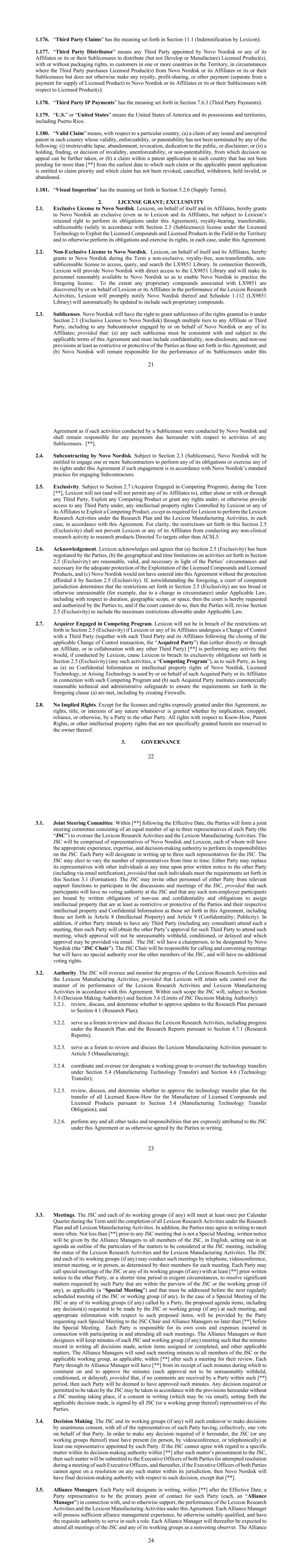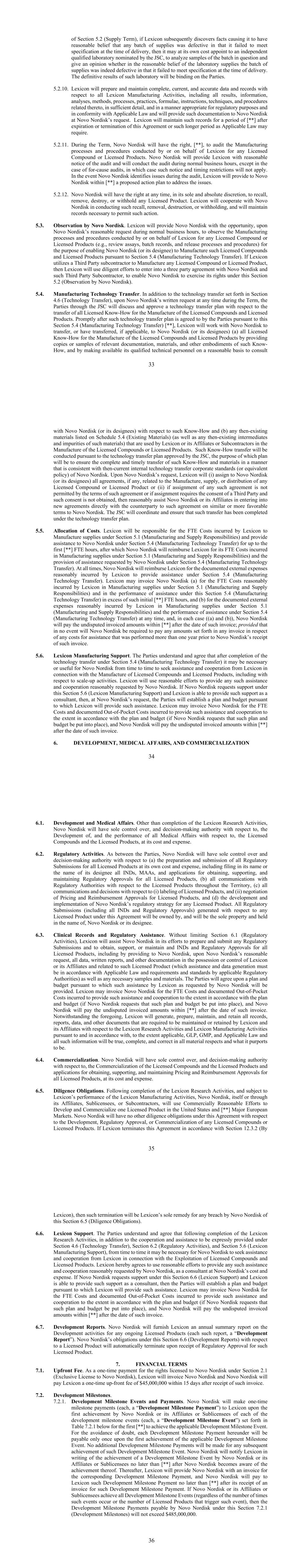25管理人员将负责管理双方就本协议进行的沟通、为其安排电话会议以及协调JSC会议。所有联盟管理人都不会成为JSC的成员。尽管每一方将尽一切合理努力保持其联盟管理人的连续性,但每一方可在事先书面通知另一方的情况下随时更换其联盟管理人。3.6.对决策权限的限制。JSC、JSC主席、联盟管理人以及每个工作组(如果有的话)仅拥有根据本条第3条(治理)明确授予的权力,在其他方面没有任何权力,而诺和诺德在就JSC管辖范围内的任何事项行使其最终决策权时也没有任何权力:【**].各缔约方均保留其根据本协议授予其的所有权利、权力和酌处权,除非本协议明确规定或双方以书面明确约定,否则任何缔约方均不会丧失根据本协议授予JSC或任何工作组的任何此类权利、权力或酌处权。JSC的任何决定不得或将违反本协议的任何条款或条件。据了解并同意,将由JSC正式决定的问题仅限于根据第3.2节(授权)明确规定为将由JSC决定的问题的那些具体问题。3.7.JSC停产。JSC将继续运营,直到所有Lexicon研究活动和Lexicon制造活动完成,除非较早时被诺和诺德终止。4.研究4.1。研究计划。Lexicon将进行书面研究计划中提出并根据的IND赋能研究,[**].此类书面研究计划将包括:(a)完成IND赋能研究所需的活动;(b)Lexicon将向诺和诺德提供的与开展此类活动相关的可交付成果和结果;(c)完成该计划下所有活动的时间表(该计划可能会根据本协议进行修订,称为“研究计划”)。初步研究计划载于附表4.1(初步研究计划)(「初步研究计划」)。任何一方均可不时提出研究计划的更新,并将其提交给JSC。JSC将审查、讨论并决定是否批准每项拟议的更新计划,但须遵守第3.4节(决策)和第3.6节(决策权限限制)。如果JSC根据第3条(治理)批准对研究计划进行更新,则自批准之日起,研究计划将被视为相应修订。本第4.1节(研究计划)中的任何内容均不限制诺和诺德根据第6.1节(开发和医疗事务)进行或已经进行开发活动的权利,而Lexicon将根据第5.1节(制造和供应责任)为所有此类开发活动提供许可化合物和许可产品的供应要求。4.2.词典研究活动。Lexicon将(a)使用商业上合理的努力来执行研究计划下的所有活动,包括完成其中所述的IND赋能研究的绩效,以及(b)准备和交付研究计划中规定的所有交付成果和结果,包括根据第4.7.1节(研究报告)(统称为“Lexicon研究活动”)编写所有研究报告。Lexicon将(i)提供其开展所有Lexicon研究活动所需的所有资源、材料和设施,以及(ii)根据所有适用的法律和本协议的条款以合理的谨慎和技能开展所有Lexicon研究活动。Lexicon将负责由Lexicon或代表Lexicon在执行初始研究计划下的活动中产生的所有成本和费用。如果任何一方希望在初始研究计划中增加额外的活动,那么该缔约方可以向JSC提出更新,以审查、讨论并确定是否批准26项此类更新。如果JSC批准更新的研究计划,其中包括初始研究计划中规定的活动之外的活动(“额外的词典活动”), 然后,JSC还将批准Lexicon在执行此类额外活动中将产生并由诺和诺德偿还的FTE成本和自付费用预算(“额外活动预算”)。4.3.额外的词典活动费用。在执行根据研究计划分配给Lexicon的任何额外Lexicon活动时,在额外活动预算(“额外活动费用”)加上允许的超支金额的范围内并按照规定的金额,由Lexicon或代表Lexicon承担所有FTE费用和自付费用。除非缔约方在附加活动预算中另有约定,在[**】在Lexicon因执行任何额外的Lexicon活动而产生任何额外活动费用的每个日历季度结束后,Lexicon将向诺和诺德提交一份发票,其中合理地详细说明此类FTE费用和自付费用,并附有合理的书面证据,并且诺和诺德将向Lexicon偿还该发票中所列的所有此类记录在案的无争议的额外活动费用,这些费用小于或等于此类额外Lexicon活动的适用的额外活动预算中规定的金额加上允许的超支[**】收到后。如果Lexicon或代表Lexicon在给定日历季度执行额外Lexicon活动所产生的FTE成本和自付费用超过适用的额外活动预算中规定的金额加上允许的超支,则Lexicon将负责此类超额FTE成本和自付费用。4.4.开展词汇学研究活动。4.4.1.分包商的聘用。Lexicon可酌情聘用一个或多个分包商进行研究计划下的任何Lexicon研究活动,前提是(a)(i)该分包商已在研究计划中明确规定,或(ii)Lexicon以其他方式事先获得诺和诺德的书面同意(不得无理拒绝、附加条件或延迟),(b)任何该等分包商拥有履行相关分包责任所需的专业知识,(c)与任何该等分包商的协议并未对诺和诺德施加任何付款义务,(d)与此类分包商的任何协议均符合本协议的规定,包括(i)将在进行相关Lexicon研究活动过程中开发的所有知识产权(包括对任何此类分包商的背景技术进行改进的知识产权除外)自动转让给Lexicon,以及(ii)该分包商有义务对该分包商收到的任何关于诺和诺德的机密信息进行保密的条款和条件,这些信息至少与本协议(包括第9条(保密;公示)中规定的那样对双方具有限制性或保护性。此外,在任何情况下,Lexicon都不会聘用被监管机构取消资格或取消资格的分包商,如果此类分包商随后被监管机构取消资格或取消资格,Lexicon将立即终止此类分包商。Lexicon将继续根据本协议对Lexicon的任何分包商或关联公司履行其在本协议下的所有义务或行使其在本协议下的权利承担责任,尽管Lexicon聘请了任何分包商,但Lexicon将对这些分包商和关联公司遵守本协