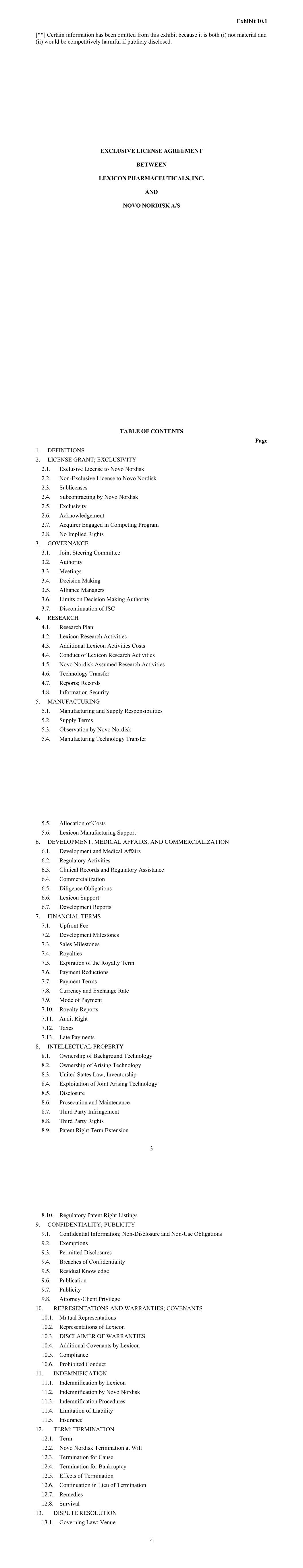 附件 10.1 [**]本展览遗漏了某些信息,因为这些信息既(i)不重要,又(ii)如果公开披露将具有竞争性危害。Lexicon Pharmaceuticals,INC.之间的独家许可协议。和NOVO NORDISK A/S目录第1页。定义2。License Grant;Exclusivity 2.1。独家授权给诺和诺德 2.2。对诺和诺德的非独占许可2.3。分许可2.4。由诺和诺德分包2.5。排他性2.6。致谢2.7。收购方参与竞争方案2.8。无默示权利3。治理3.1。联合指导委员会3.2。权威3.3。会议3.4。决策3.5。联盟管理人员3.6。对决策权限的限制3.7。JSC 4停产。研究4.1。研究计划4.2。词典研究活动4.3。额外的Lexicon活动费用为4.4。开展词汇学研究活动4.5。诺和诺德承担研究活动4.6。技术转让4.7。报告;记录4.8。信息安全5。制造业5.1。制造和供应责任5.2。供应条款5.3。诺和诺德观察观察5.4。制造技术转让35.5。成本分配5.6。Lexicon制造支持6。发展、医疗事务、商业化6.1。发展和医疗事务6.2。监管活动6.3。临床记录和监管援助6.4。商业化6.5。勤勉义务6.6。Lexicon支持6.7。发展报告7。财务条款7.1。预付费用7.2。发展里程碑7.3。销售里程碑7.4。版税7.5。版税期限届满7.6。付款减少7.7。付款条件7.8。货币和汇率7.9。付款方式7.10。版税报告7.11。审计权7.12。税7.13。逾期付款8。知识产权8.1。背景技术8.2的所有权。爱升科技的所有权8.3。美国法律;Inventorship 8.4。开发Joint Arising技术8.5。披露8.6。检控维持8.7。第三方侵权8.8。第三方权利8.9。专利权期限延长48.10。监管专利权清单9。保密性;公众性9.1。保密信息;不披露和不使用义务9.2。豁免9.3。允许的披露9.4。违反保密9.5。剩余知识9.6。出版物9.7。公示9.8。律师-客户特权10。代表和授权书;《盟约》10.1。相互表示10.2。Lexicon 10.3的表示。认股权证的免责声明10.4。Lexicon 10.5的附加盟约。合规10.6。禁止的行为11。赔偿11.1。Lexicon 11.2的赔偿。诺和诺德的赔偿11.3。赔偿程序11.4。责任限制11.5。保险12。任期;终止12.1。任期12.2。诺和诺德 12.3随意终止。因故终止12.4。破产终止12.5。终止的影响12.6。代替终止的延续12.7。补救措施12.8。生存13。争议决议13.1。管辖法律;地点