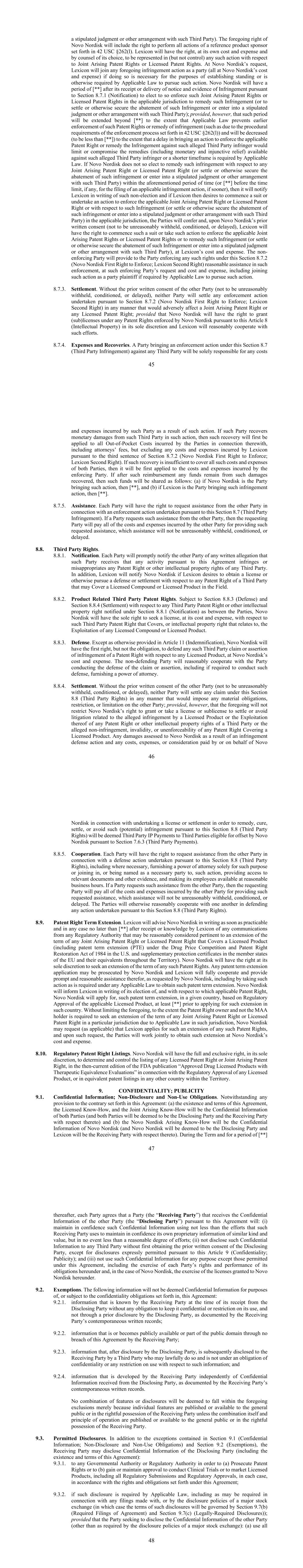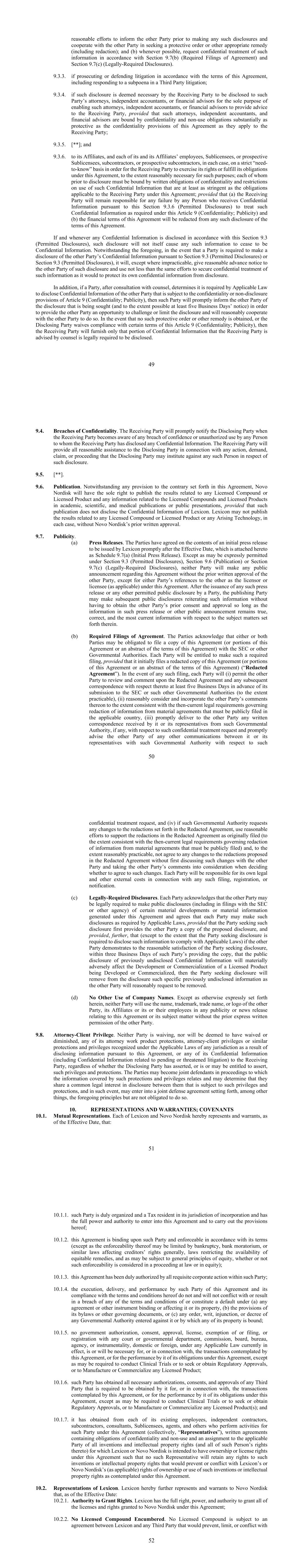49合理努力在作出任何此类披露之前告知另一方,并与另一方合作寻求保护令或其他适当补救(包括修订);(b)尽可能根据第9.7(b)节(协议的必要备案)和第9.7(c)节(法律要求的披露)要求对此类信息进行保密处理。9.3.3.如根据本协议条款提起诉讼或为诉讼辩护,包括在第三方诉讼中对传票作出回应;9.3.4.如接收方认为有必要向该方的律师、独立会计师或财务顾问披露此类披露,其唯一目的是使此类律师、独立会计师或财务顾问能够向接收方提供建议,但前提是此类律师、独立会计师、财务顾问受保密和不使用义务的约束,其保护性与本协议的保密条款一样大,适用于接收方;9.3.5。[**];及9.3.6.向其附属公司,及其每名附属公司的雇员、分许可人、或潜在分许可人、分包商或潜在分包商,在每种情况下,在严格的“需要知道”基础上,以便接收方行使其在本协议下的权利或履行其义务,在为此目的合理必要的范围内;披露前的每个人都必须遵守书面保密义务和对使用此类机密信息的限制,这些义务至少与本协议下适用于接收方的义务一样严格;规定(a)接收方将继续对根据本条第9.3.6条(许可披露)收到机密信息的任何人未能按本条第9条(保密;公开)的要求处理此类机密信息负责,以及(b)本协议的财务条款将从本协议条款的任何此类披露中删除。如果和无论何时根据本第9.3节(许可披露)披露任何机密信息,这种披露本身不会导致任何此类信息不再是机密信息。尽管有上述规定,如果一缔约方根据第9.3节(许可披露)或第9.3节(许可披露)被要求披露另一缔约方的机密信息,则除非在不切实可行的情况下,它将向另一缔约方发出此类披露的合理提前通知,并使用不少于与保护其自己的机密信息不被披露相同的努力来确保此类信息的保密处理。此外,如果一方当事人经与律师协商,确定适用法律要求披露受第9条(保密;公示)保密或不披露规定约束的另一方的保密信息,则该一方当事人将及时将正在寻求的披露告知另一方当事人(并在可能的情况下至少提前五个工作日通知),以便为另一方当事人提供质疑或限制披露的机会,并将合理配合另一方当事人这样做。如果未获得此类保护令或其他补救措施,或披露方放弃遵守第9条的某些条款(保密;公示),则接收方将仅提供法律要求披露的接收方被律师告知的那部分保密信息。50 9.4.违反保密规定。当接收方知悉接收方已向其披露任何机密信息的任何人有任何违反保密或未经授权的使用行为时,接收方将及时通知披露方。接收方将就披露方可能就此类披露对任何此类人提起的任何诉讼、要求、索赔或诉讼向披露方提供一切合理协助。9.5.[**].9.6.出版。尽管本协议中有任何相反的规定,诺和诺德将拥有在学术、科学和医学出版物或公开演示文稿中发布与任何许可化合物或许可产品相关的结果以及与许可化合物和许可产品相关的任何信息的唯一权利,前提是此类发布不披露Lexicon的机密信息。Lexicon不得发布与任何许可化合物或许可产品或任何Arising技术相关的结果,在每种情况下, 未经诺和诺德事先书面批准。9.7.宣传。(a)新闻稿。双方已就Lexicon在生效日期后立即发布的初步新闻稿的内容达成一致,该新闻稿作为附表9.7(a)(初步新闻稿)附后。除非根据第9.3节(许可披露)、第9.6节(公布)或第9.7(c)节(法律要求的披露)明确允许,任何一方均不得在未经另一方事先书面批准的情况下就本协议发布任何公告,除非任何一方提及另一方为本协议下的许可人或被许可人(如适用)。在某一缔约方发布任何此类新闻稿或任何其他允许的公开披露后,只要该新闻稿或其他公开公告中的信息保持真实、正确和与其中所列主题事项有关的最新信息,发布方可以在无需征得另一缔约方事先同意和批准的情况下进行后续的公开披露,重申该信息。(b)所需的协议备案。双方承认,一方或双方可能有义务向SEC或其他政府机构提交本协议的副本(或本协议的部分内容或本协议条款的摘要)。每一缔约方将有权进行此类必要的归档,前提是其最初归档本协议的经编辑的副本(或本协议的部分内容或本协议条款的摘要)(“经编辑的协议”)。如果发生任何此类提交,每一缔约方将(i)允许另一方在向SEC或此类其他政府当局提交之前至少五个工作日(在切实可行的范围内)审查和评论经修订的协议及其相关的任何后续通信,(ii)合理考虑并纳入另一方对该协议的评论,其范围与当时有关编辑必须在适用国家公开提交的重要协议中的信息的现行法律要求相一致,(iii)迅速将其或其代表从该政府当局(如有的话)收到的与该保密处理请求有关的任何书面通信交付另一方,并迅速将其或其代表与该政府当局就该51项保密处理请求进行的任何其他通信通知另一方,以及(iv)如该政府当局要求对经修订的协议中所载的修订作出任何更改,使用合理的努力来支持最初提交的已修订协议中的修订(在与当时有关修订必须公开提交的重要协议中的信息的法律要求一致的范围内),并且在合理可行的范围内,在未首先与另一方讨论此类更改并在决定是否同意此类更改时考虑另一方的评论之前,不同意对已修订协议中提议的修订进行任何更改。各缔约方将负责各自与任何此类备案、登记或通知相关的法律费用和其他外部费用。(c)法律要求的披露。每一缔约方均承认,法律可能要求另一方公开披露(包括在向SEC或其他机构提交