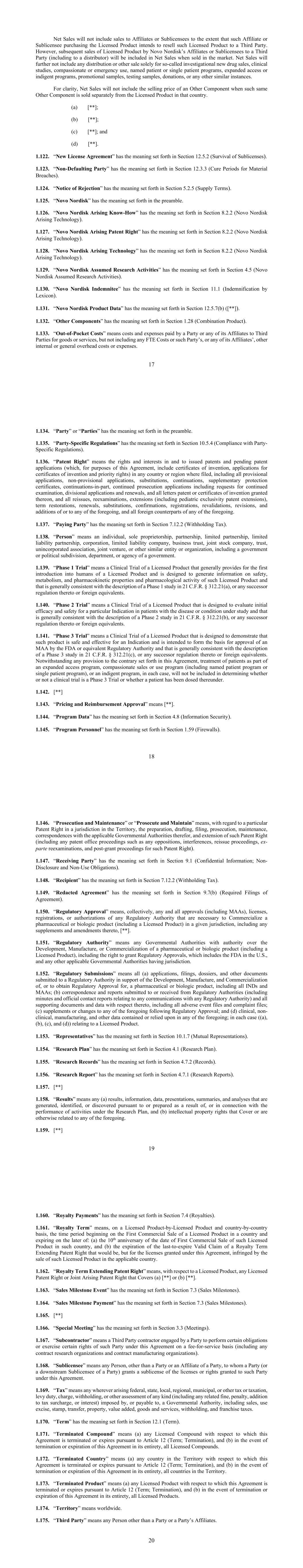 17净销售额将不包括向关联公司或分被许可人的销售额,前提是购买许可产品的关联公司或分被许可人打算将此类许可产品转售给第三方。但是,诺和诺德的关联公司或分被许可人向第三方(包括向分销商)进行的许可产品的后续销售将在市场上销售时计入净销售额。净销售额将进一步不包括任何仅用于所谓研究性新药销售、临床研究、同情或紧急使用、指定患者或单一患者项目、扩大访问或贫困项目、促销样本、检测样本、捐赠或任何其他类似情况的分销或其他销售。为明确起见,净销售额将不包括其他组件的销售价格,如果此类相同的其他组件与该国的许可产品分开销售。(a)[**];(b)[**];(c)[**];和(d)[**].1.122.“新许可协议”具有第12.5.2节(次级许可的存续)中规定的含义。1.123.“非违约方”具有第12.3.3节(重大违约的治愈期)中规定的含义。1.124.“拒绝通知”具有第5.2.5节(供应条款)中规定的含义。1.125.“诺和诺德”具有序言部分阐述的含义。1.126.“诺和诺德 Arising Know-How”的含义在第8.2.2节(诺和诺德 Arising Technology)中阐述。1.127.“诺和诺德引起的专利权”具有第8.2.2节(诺和诺德引起的技术)中规定的含义。1.128.“诺和诺德 Arising技术”的含义详见第8.2.2节(诺和诺德 Arising技术)。1.129.“诺和诺德假设研究活动”具有第4.5节(诺和诺德假设研究活动)中规定的含义。1.130.“诺和诺德受保人”具有第11.1节(Lexicon赔偿)中规定的含义。1.131.“诺和诺德产品数据”具有第12.5.7(b)节规定的含义([**]).1.132.“其他组件”具有1.28节(组合产品)中阐述的含义。1.133.“自付费用”是指一方或其任何关联公司为商品或服务向第三方支付的成本和费用,但不包括任何FTE成本或该方或其任何关联公司的其他内部或一般间接费用或费用。18 1.134.“党”或“党”具有序言中阐述的含义。1.135.“党的特定规定”具有第10.5.4节(遵守党的特定规定)中规定的含义。1.136.“专利权”是指在提交的任何国家或地区的已发布专利和未决专利申请(就本协议而言,包括发明证书、发明证书申请和优先权权利)中的权益,包括所有临时申请、非临时申请、替代、延续、补充保护证书、延续部分、继续起诉申请包括继续审查请求、分区申请和延续,以及在其上授予的所有字母专利或发明证书,以及所有重新签发、复审、延期(包括儿科独占专利延期)、期限恢复、续期、替代、确认、注册、重新确认、修订,以及上述任何一项的补充或补充,以及上述任何一项的所有外国对应方。1.137.“缴款方”具有第7.1 2.2节(代扣代缴税款)中规定的含义。1.138.“人”是指个人、独资企业、合伙企业、有限合伙企业、有限责任合伙企业、公司、有限责任公司、商业信托、股份有限公司、信托、非法人协会、合营企业或其他类似实体或组织,包括政府或政府的政治分支机构、部门或机构。1.139.“1期试验”是指许可产品的临床试验,通常规定许可产品首次引入人体,旨在生成有关该许可产品的安全性、代谢、药代动力学特性和药理活性的信息,并且通常与21C.F.R. § 312.21(a)中的1期研究描述一致,或其任何后续法规或国外等效物。1.140.“2期试验”是指许可产品的临床试验,该产品旨在评估特定适应症在患有研究中的疾病或状况的患者中的初步疗效和安全性,并且与21C.F.R. § 312.21(b)中的2期研究描述大体一致, 或其任何后续法规或外国同等法规。1.141.“3期试验”是指许可产品的临床试验,该试验旨在证明该产品对适应症是安全有效的,并旨在构成FDA或同等监管机构批准MAA的基础,并且与21C.F.R. § 312.21(c)中对3期研究的描述,或其任何后续法规或外国等效法规的描述大体一致。尽管本协议中规定了任何相反的规定,在每种情况下,作为扩大准入计划、同情销售或使用计划(包括指定患者计划或单一患者计划)或贫困计划的一部分的患者治疗将不包括在确定临床试验是否为第3期试验或患者是否已在其下给药的范围内。1.142.[**] 1.143.“定价报销审批”是指【**].1.144.“程序数据”具有第4.8节(信息安全)中阐述的含义。1.145.“程序人员”具有1.59节(防火墙)中规定的含义。19 1.146.“起诉并维持”或“起诉并维持”是指,就领土内某一司法管辖区的特定专利权而言,该专利权的准备、起草、归档、起诉、维护、与相关适用政府当局的通信以及该专利权的延期(包括任何专利局程序,如任何异议、干涉、重新发布程序、单方面复审以及该专利权的授予后程序)。1.147.“接收方”具有第9.1节(保密信息;不披露和不使用义务)中规定的含义。1.148.“收件人”具有第7.1 2.2节(预扣税)中规定的含义。1.149.“经修订的协议”具有第9.7(b)节(协议的必要备案)中规定的含义。1.150.“监管批准”统称为任何监管机构的任何和所有批准(包括MAAs)、许可、注册或授权,这些批准、许可、注册或授权是在特定司法管辖区将药品或生物制品(包括许可产品)商业化所必需的,包括对其的任何补充和修订,【**].1.151.“监管当局”是指对药品或生物制品(包括许可产品)的开发、制造或商业化拥有权力的任何政府当局,包括授予监管批准的权利,其中包括美国的FDA,以及具有管辖权的任何其他适用的政府当局。1.152.“监管提交”是指向监管机构提交的所有(a)申请、备案、档案和其他文件,以支持医药或生物产品的开发、制造和商业化或获得监管批准,包括所有IND和MAA;(b)向监