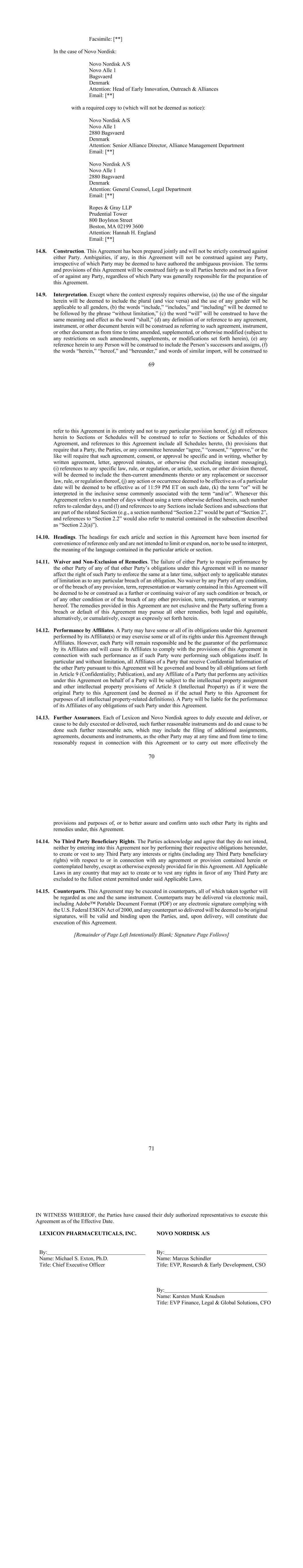 69传真:[**]对于诺和诺德:Novo Nordisk A/S Novo Alle 1 Bagsvaerd丹麦注意:早期创新、外联和联盟负责人电子邮件:[**]附要求复印至(不视为通知):Novo Nordisk A/S Novo Alle 12880 Bagsvaerd Denmark收件人:联盟管理部高级联盟总监邮箱:[**] Novo Nordisk A/S Novo Alle 12880 Bagsvaerd丹麦收件人:法律部总法律顾问邮箱:[**] Ropes & Gray LLP Prudential Tower 800 Boylston Street Boston,MA 0 21993600关注:Hannah H. England邮箱:[**] 14.8.建设。本协议是共同准备的,不会被严格解释为针对任何一方。本协议中的任何歧义(如果有的话)将不会被解释为针对任何一方,无论哪一方可能被视为制定了模棱两可的条款。本协议的条款和规定将被公平地解释为对本协议的所有各方,而不是有利于或不利于任何一方,无论一般由哪一方负责本协议的准备工作。14.9.解读。除非上下文另有明确要求,(a)此处单数的使用将被视为包括复数(反之亦然),任何性别的使用将适用于所有性别,(b)“包括”、“包括”和“包括”等词语将被视为后面有“但不限于”等短语,(c)“将”一词将被解释为与“应”一词具有相同的含义和效果,(d)本文对任何协议、文书或其他文件的任何定义或提述将被解释为提述不时修订、补充或以其他方式修改的协议、文书或其他文件(受本文所述的此类修订、补充或修改的任何限制),(e)本文对任何人的任何提述将被解释为包括该人的继承人和受让人,(f)“本协议”、“本协议”和“本协议下,和类似含义的词语,将被解释为70指的是本协议的全部内容,而不是本协议的任何特定条款,(g)本文中对章节或附表的所有引用将被解释为指本协议的章节或附表,对本协议的引用包括本协议的所有附表,(h)要求一方、双方或本协议下的任何委员会“同意”、“同意”、“批准”的条款,或类似内容将要求此类协议、同意或批准是具体的和书面的,无论是通过书面协议、信函、批准的会议记录或其他方式(但不包括即时通讯),(i)对任何特定法律、规则或条例或条款、章节或其其他部分的提及将被视为包括当时对其的修订或其任何替代或继承的法律、规则或条例,(j)任何被视为在特定日期生效的行动或事件将被视为在该日期的美国东部时间晚上11:59生效,(k)“或”一词将被解释为通常与“和/或”一词相关的包容性意义。每当本协议提及未使用此处另有定义的术语的天数时,该数字指的是日历天数,并且(l)和对任何章节的引用包括属于相关章节的章节和小节(例如,编号为“第2.2节”的章节将是“第2节”的一部分,对“第2.2节”的引用也将指称为“第2.2(a)节”的小节中包含的材料)。14.10.标题。本协定中每一条款和章节的标题仅为便于参考而插入,无意限制或扩展特定条款或章节所载语言的含义,也不用于解释。14.11.豁免及不排除补救措施。任何一方未能要求另一方履行该另一方在本协议下的任何义务,将不会以任何方式影响该另一方在以后强制执行该义务的权利,但仅限于对任何特定违反义务的行为适用的诉讼时效。任何一方放弃任何条件,或违反本协议所载的任何规定、条款、陈述或保证,均不会被视为或被解释为进一步或持续放弃任何该等条件或违反,或任何其他条件或违反本协议的任何其他规定、条款、陈述或保证。本协议中规定的补救措施不是排他性的,遭受违反或违约本协议的一方可以寻求所有其他补救措施,包括合法和公平的、替代的或累积的, 除非在此明确规定。14.12.附属公司的表现。一方可由其关联公司履行其在本协议项下的部分或全部义务,或可通过关联公司行使其在本协议项下的部分或全部权利。然而,每一方将继续负责并成为其关联公司履行义务的担保人,并将促使其关联公司遵守与此种履行有关的本协议规定,就好像该方自己在履行此种义务一样。特别是但不限于,根据本协议接收另一方机密信息的一方的所有关联公司将受到第9条(保密;公布)规定的所有义务的管辖和约束,而代表一缔约方执行本协议项下任何活动的一缔约方的任何关联公司将受到第8条(知识产权)的知识产权转让和其他知识产权条款的约束,就好像它是本协议的原始缔约方一样(就所有与知识产权相关的定义而言,被视为本协议的实际缔约方)。一方将对其关联公司履行该方在本协议项下的任何义务承担责任。14.13.进一步保证。Lexicon和诺和诺德各自同意适当签署和交付或促使其适当签署或交付此类进一步合理的文书,并作出和促使作出此类进一步合理的行为,其中可能包括提交其他方可能在任何时候并不时合理要求的与本协议有关的额外转让、协议、文件和文书,或更有效地执行本协议的71项条款和宗旨,或更好地向该另一方保证和确认其在本协议下的权利和补救措施。14.14.无第三方受益权。双方承认并同意,他们不打算通过订立本协议或履行各自在本协议项下的义务,就本协议所载或本协议所设想的任何协议或规定或与之相关的任何利益或权利(包括任何第三方受益权)设定或归属于任何第三方,除非本协议另有明确规定。在上述适用法律允许的最大范围内,任何国家的所有可能采取行动创造或赋予任何有利于任何第三方的权利的适用法律均被排除在外。14.15.同行。本协议可在对应方执行,所有这些协议加在一起将被视为同一文书。同行可能通过电子邮件递送,包括Adobe™便携式文件格式(PDF)或任何符合2000年美国联邦ESIGN法案的电