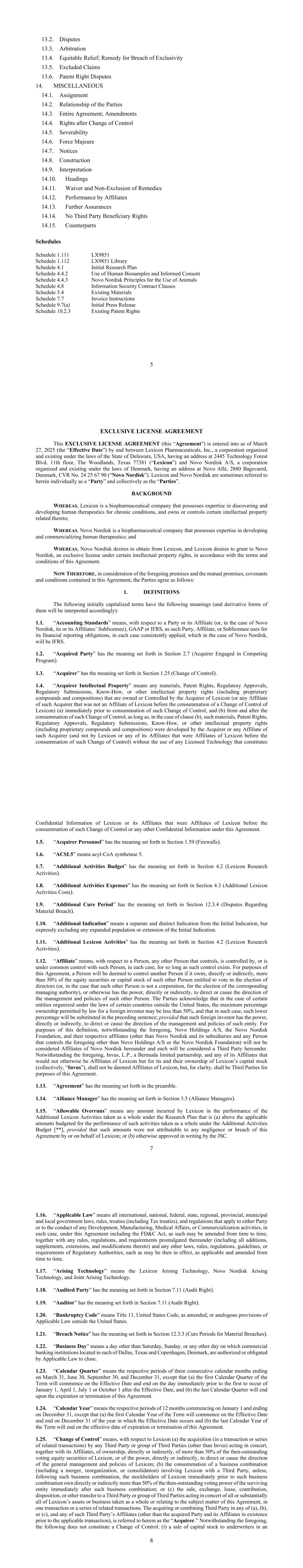 5 13.2.争议13.3。仲裁13.4。公平救济;违反排他性的补救措施13.5。不包括索赔13.6。专利权纠纷14。杂项14.1。任务14.2。各方关系14.3。整个协议;修正案14.4。控制权变更后的权利14.5。可分割性14.6。不可抗力14.7。通告14.8。建筑14.9。释义14.10。标题14.11。豁免和不排除补救措施14.12。附属公司的表现14.13。进一步保证14.14。无第三方受益权14.15。对口单位附表1.11 1 LX9851附表1.112 LX9851图书馆附表4.1初步研究计划附表4.4.2人类生物样品的使用和知情同意附表4.4.3 诺和诺德动物使用原则附表4.8信息安全合同条款附表5.4现有材料附表7.7发票说明附表9.7(a)首次新闻发布附表10.2.3现有专利权独家许可协议本独家许可协议(本“协议”)由根据美国特拉华州法律组建和存在的公司,自2025年3月27日(“生效日期”)起订立,地址为2445 Technology Forest Blvd. 11 floor,the Woodlands,Texas 77381(“Lexicon”),而Novo Nordisk A/S是一家根据丹麦法律组建和存在的公司,地址为Novo All é,2880 Bagsvaerd,Denmark,丨第24256790号(“诺和诺德”)。Lexicon和诺和诺德有时在本文中被单独称为“缔约方”,并统称为“缔约方”。背景然而,Lexicon是一家生物制药公司,在发现和开发针对慢性病的人类疗法方面拥有专长,并拥有或控制某些与此相关的知识产权;然而,诺和诺德是一家生物制药公司,在开发和商业化人类疗法方面拥有专长;因此,诺和诺德希望从Lexicon获得,而Lexicon希望根据本协议的条款和条件向诺和诺德授予某些知识产权下的独家许可。因此,考虑到前述前提和本协议所载的相互承诺、契诺和条件,双方同意如下:1。定义以下初始大写术语具有以下含义(并对其派生形式进行相应解释):1.1。“会计准则”是指,就一方或其关联公司(或者,就诺和诺德而言,是其或其关联公司的分被许可人)而言,作为该方、关联公司或分被许可人用于其财务报告义务的公认会计原则或国际财务报告准则,在每种情况下均一致适用,而就诺和诺德而言,这将是国际财务报告准则。1.2.“被收购方”具有第2.7节(收购方参与竞争方案)中规定的含义。1.3.“收购人”具有第1.25节(控制权变更)中规定的含义。1.4.“收购方知识产权”是指Lexicon的收购方(或该收购方的任何关联公司,在Lexicon控制权变更完成前不是Lexicon的关联公司)拥有或控制的任何材料、专利权、监管批准、监管提交、专有技术或其他知识产权(包括专有化合物和组合物)(a)紧接该控制权变更完成前,以及(b)自该控制权变更完成后,只要在(b)条的情况下,该等材料、专利权、监管批准、监管提交、专有技术,或其他知识产权(包括专有化合物和组合物)是由收购方或此类收购方的任何关联公司(而不是由Lexicon或其任何在此类控制权变更完成之前为Lexicon关联公司的关联公司)开发的,而没有使用构成Lexicon或其关联公司的任何许可技术,在此类控制权变更完成之前为Lexicon关联公司的7个机密信息或本协议项下的任何其他机密信息。1.5.“收购方人员”具有第1.59节(防火墙)中规定的含义。1.6.“ACSL5”是指酰基辅酶A合成酶5。1.7.“额外活动预算”具有第4.2节(词汇研究活动)中阐述的含义。1.8.“额外活动费用”具有第4.3节(额外词汇活动费用)中规定的含义。1.9.“额外治愈期”具有第12.3.4节(有关重大违约的争议)中规定的含义。1.10.“附加适应症”是指与初始适应症分开、区分的适应症, 但明确排除任何扩大的人群或初始适应症的扩展。1.11.“额外的词库活动”具有第4.2节(词库研究活动)中规定的含义。1.12.“关联关系”是指,就某一人而言,在每种情况下,只要存在此类控制,任何控制、受该人控制或与该人处于共同控制之下的其他人。就本协议而言,如果某人直接或间接拥有该另一人在董事选举中有权投票的股本证券或股本的50%以上(或在该另一人不是公司的情况下,为选举相应的管理当局),或以其他方式有权直接或间接指导或导致该另一人的管理和政策的方向,则该人将被视为控制另一人。双方承认,就根据美国境外某些国家的法律组建的某些实体而言,法律允许外国投资者拥有的最大百分比可能低于50%,在这种情况下,将在前一句中取代这一较低百分比;但前提是该外国投资者有权直接或间接地指导或导致该实体的管理和政策的方向。为本定义之目的,尽管有上述规定,Novo Holdings A/S、诺和诺德基金会、及其各自的关联公司(诺和诺德及其子公司以及除Novo Holdings A/S或诺和诺德基金会外控制前述的任何人)将不被视为诺和诺德在本协议项下的关联公司,各自将被视为本协议项下的第三方。尽管有上述规定,Invus,L.P.,一家百慕大有限合伙企业,及其任何非因其及其对Lexicon股本的所有权而不属于Lexicon的附属公司(统称“Invus”),均不应被视为Lexicon的附属公司,但为明确起见,就本协议而言,应为第三方。1.13.“协议”具有序言中阐述的含义。1.14.“联盟管理者”具有3.5节(Alliance Managers)中阐述的含义。1.15.“允许超支”是指Lexicon在研究计划下作为一个整体的额外Lexicon活动的执行中发生的任何金额,该金额(a)高于额外活动预算下作为一个整体的此类活动的执行所预算的适用金额[**],前提是这些金额不是由于Lexicon或代表Lexicon对本协议的任何疏忽或违反;或(b)JSC以其他方式书面批准。8 1.16.“适用法律”是指适用于任何一方或进行任何开发、制造、医疗事务或商业化活动的所有国际、国家、联邦、州、地