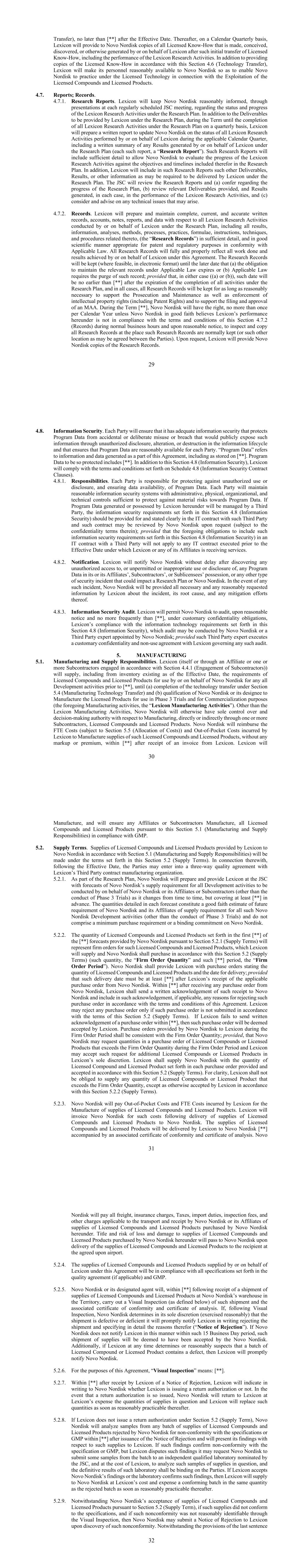29转出),不迟于【**】生效日期后。此后,Lexicon将以日历季度为基础,在此类许可专有技术的初始转让之后,向诺和诺德提供由Lexicon或代表Lexicon制作、构思、发现或以其他方式生成的所有许可专有技术的副本,包括Lexicon研究活动的执行。除了根据本第4.6节(技术转让)提供许可专有技术的副本外,Lexicon还将向诺和诺德提供其合理可用的人员,从而使诺和诺德能够在与许可化合物和许可产品的开发有关的许可技术下执业。4.7.报告;记录。4.7.1.研究报告。Lexicon将通过在每次定期安排的JSC会议上的演讲,就研究计划下的Lexicon研究活动的状态和进展情况,向诺和诺德提供合理的信息。除了Lexicon根据研究计划提供的可交付成果外,在任期内直至按季度完成研究计划下的所有Lexicon研究活动,Lexicon将编制一份书面报告,以更新诺和诺德关于Lexicon或代表Lexicon在适用的日历季度内进行的所有Lexicon研究活动的状态,包括Lexicon或代表Lexicon在研究计划下产生的任何结果的书面摘要(每份此类报告,“研究报告”)。此类研究报告将包含足够的详细信息,以使诺和诺德能够根据研究计划中包含的目标和时间表评估Lexicon研究活动的进展。此外,Lexicon将在此类研究报告中包括Lexicon根据研究计划可能需要交付的其他可交付成果、结果或其他信息。JSC将审查研究报告,并(a)就研究计划的进展进行磋商,(b)审查所提供的相关交付成果,以及在每种情况下在执行Lexicon研究活动中产生的结果,以及(c)考虑可能出现的任何技术问题并提供建议。4.7.2.记录。Lexicon将根据研究计划,就Lexicon或代表Lexicon进行的所有Lexicon研究活动,编制和维护完整、当前和准确的书面记录、账目、笔记、报告和数据,包括所有结果、信息、分析、方法、过程、做法、公式、说明、技术和与之相关的程序,(“研究记录”)足够详细,并以符合适用法律的适合专利和监管目的的良好科学方式。所有研究记录将充分和适当地反映Lexicon或代表Lexicon在本协议下所做的所有工作和取得的成果。研究记录将(在可行的情况下,以电子格式)保存至(a)根据适用法律维护相关记录的义务到期或(b)适用法律要求清除此类记录的较后日期;但在((a)或(b))任一情况下,该日期将不早于[**】在研究计划下的所有活动结束后,并在所有情况下,所有研究记录将保持合理需要的时间,以支持知识产权(含专利权)的追诉维护和执法以及支持备案和审批MAA。任期内[**],诺和诺德将有权,除非诺和诺德善意地认为Lexicon在此项下的履行不符合本节4.7.2(记录)的条款和条件,否则有权在正常营业时间内并经合理通知后,在通常保存该研究记录的地点(或双方可能约定的其他地点)查阅和复制所有研究记录,每个日历年度不超过一次。经要求,Lexicon将提供该研究记录的诺和诺德副本。30 4.8.信息安全。各缔约方将确保拥有足够的信息安全,以保护程序数据不受意外或故意滥用或违反,从而在信息生命周期中通过未经授权的披露、更改或破坏公开暴露此类信息,并确保程序数据可为各缔约方合理获得。“程序数据”是指作为本协议一部分产生的信息和数据,包括存储在[**].要如此保护的程序数据包括[**].除本第4.8节(信息安全)外,Lexicon将遵守附表4.8(信息安全合同条款)中规定的条款和条件。4.8.1.责任。各缔约方有责任防止未经授权的使用或披露,并确保数据的可用性, 程序数据。各缔约方将保持合理的信息安全体系,行政、物理、组织和技术控制足以防范对程序数据的实质性风险。如果Lexicon在此项下生成或拥有的程序数据将由第三方管理,本第4.8节(信息安全)中规定的信息安全要求应在与该第三方的IT合同中作出规定并明确说明,并且该等合同可由诺和诺德应要求(以其中的保密条款为准)进行审查;但在与第三方的IT合同中包含本第4.8节(信息安全)中规定的此类信息安全要求的上述义务将不适用于在Lexicon或其任何关联公司接受服务的生效日期之前执行的任何IT合同。4.8.2.通知。Lexicon在发现对其或其关联公司、分包商或分被许可人占有的任何程序数据进行任何未经授权的访问、未经许可或不适当的使用或披露,或可能影响研究计划或诺和诺德的任何其他类型的安全事件后,将立即通知诺和诺德。如果发生任何此类事件,Lexicon将向诺和诺德提供有关该事件、其根本原因以及任何缓解努力的所有必要和任何合理要求的信息。4.8.3.信息安全审计。Lexicon将允许诺和诺德进行审计,在合理通知的情况下且不超过[**】,根据惯常的保密义务,Lexicon对本第4.8节(信息安全)中规定的信息技术要求的遵守情况,该审计工作可由诺和诺德或诺和诺德任命的第三方专家进行;前提是该第三方专家与Lexicon就任何此类审计执行惯常的保密和不使用协议。5.制造业5.1。制造和供应责任。Lexicon(本身或通过关联公司或根据第4.4.1节(分包商的聘用)聘用的一个或多个分包商)将提供许可化合物和许可产品的要求,包括从截至生效日期的现有库存中提供,以供或代表诺和诺德在[**],直至(a)完成第5.4节(制造技术转让)下的技术转让和(b)诺和诺德或其指定人制造许可产品的资格以用于第3阶段试验和商业化目的(上述制造活动,the“Lexicon Manufacturing Activities”)。除Lexicon制造活动外,诺和诺德将以其他方式直接或通过一个或多个分包商间接对制造、许可化合物和许可产品拥有单独控制权和决策权。诺和诺德将在[第5.5