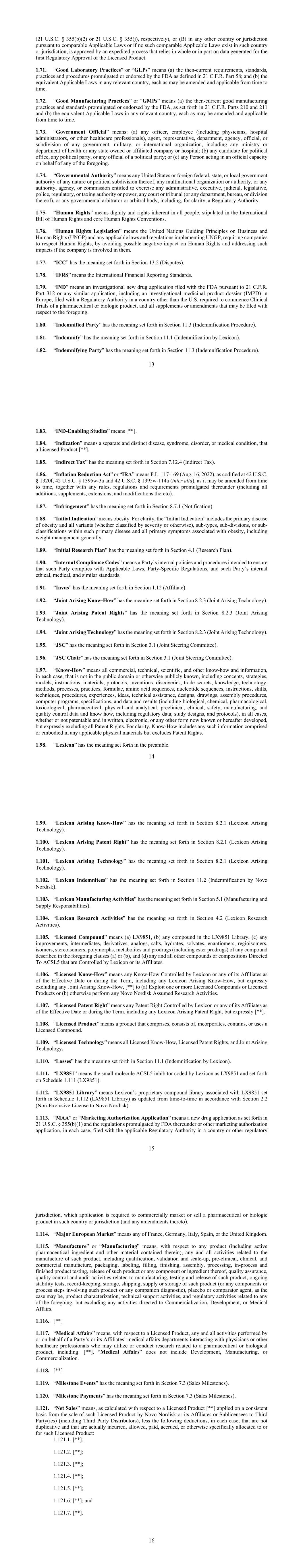 13(分别为21 U.S.C. § 355(b)(2)或21 U.S.C. § 355(j)),或(b)在任何其他国家或司法管辖区根据可比较的适用法律或如果在该国家或司法管辖区不存在此类可比较的适用法律,则通过全部或部分依赖为许可产品的首次监管批准而生成的数据的快速程序批准。1.71.“良好实验室规范”或“GLP”是指(a)21 C.F.R.第58部分中定义的当时由FDA颁布或认可的要求、标准、做法和程序;(b)任何相关国家的同等适用法律,每一项法律都可能不时修订和适用。1.72.“良好生产规范”或“GMP”是指(a)当时由FDA颁布或认可的良好生产规范和标准,如21 C.F.R.第210和211部分所述,以及(b)任何相关国家的同等适用法律,每一项都可能不时修订和适用。1.73.“政府官员”是指:(a)任何政府、军队或国际组织的任何官员、雇员(包括医生、医院管理人员或其他医疗保健专业人员)、代理人、代表、部门、机构、官员或分支机构,包括任何卫生部或卫生部或任何国有或附属公司或医院;(b)任何政治职位候选人、任何政党或任何政党官员;或(c)任何代表上述任何一项以官方身份行事的人。1.74.“政府当局”是指任何美国或外国联邦、州或地方政府的任何性质或其政治分支机构,任何跨国组织或当局,或任何有权行使任何行政、行政、司法、立法、警察、监管或税收当局或权力的当局、机构或委员会,任何法院或法庭(或其任何部门、局或部门),或任何政府仲裁员或仲裁机构,包括为明确起见的监管机构。1.75.“人权”是指《国际人权法案》和核心人权公约中规定的所有人固有的尊严和权利。1.76.“人权立法”是指《联合国商业与人权指导原则》(UNGP)和实施UNGP的任何适用法律法规,要求公司尊重人权,通过避免可能对人权产生的负面影响,并在公司参与其中的情况下解决此类影响。1.77.“ICC”具有第13.2节(争议)中规定的含义。1.78.“国际财务报告准则”是指国际财务报告准则。1.79.“IND”是指根据21 C.F.R. Part 312向FDA提交的研究性新药申请或任何类似申请,包括在欧洲的研究性医药产品档案(IMPD),向美国以外国家的监管机构提交,需要开始药物或生物产品的临床试验,以及可能就上述内容提交的所有补充或修订。1.80.“受偿方”具有第11.3节(赔偿程序)中规定的含义。1.81.“赔偿”具有第11.1节(Lexicon的赔偿)中规定的含义。1.82.“赔偿方”具有第11.3节(赔偿程序)中规定的含义。14 1.83.“IND赋能研究”是指[**].1.84.“适应症”是指单独、明确的疾病、综合征、紊乱、医疗状况,许可产品[**].1.85.“间接税”具有第7.1 2.4节(间接税)中规定的含义。1.86.“通胀削减法案”或“IRA”是指P.L. 117-169(2022年8月16日),编纂于42 U.S.C. § 1320f、42 U.S.C. § 1395w-3a和42 U.S.C. § 1395w-114a(除其他外),因为它可能会不时修订,连同根据该法案颁布的任何规则、条例和要求(包括所有增加、补充、延期和修改)。1.87.“侵权”具有第8.7.1节(通知)中规定的含义。1.88.“初步适应症”是指肥胖。为明确起见,“初始适应症”包括肥胖的原发性疾病和所有变异(无论是否按严重程度分类)、亚型、细分或此类原发性疾病内的亚分类以及与肥胖相关的所有原发性症状,包括一般的体重管理。1.89.“初步研究计划”具有第4.1节(研究计划)中阐述的含义。1.90.“内部合规守则”是指一方的内部政策和程序,旨在确保该缔约方遵守适用的法律、特定党派的规定,以及该缔约方的内部伦理、医疗、 和类似的标准。1.91.“Invus”具有第1.12节(Affiliate)中规定的含义。1.92.“Joint Arising Know-How”具有第8.2.3节(Joint Arising Technology)中阐述的含义。1.93.“联合产生的专利权”具有第8.2.3节(联合产生的技术)中规定的含义。1.94.“Joint Arising Technology”具有第8.2.3节(Joint Arising Technology)中规定的含义。1.95.“JSC”具有第3.1节(联合指导委员会)中规定的含义。1.96.“JSC主席”具有第3.1节(联合指导委员会)中规定的含义。1.97.“专有技术”是指所有商业、技术、科学和其他专有技术和信息,在每种情况下,不属于公共领域或以其他方式为公众所知,包括概念、战略、模型、指令、材料、协议、发明、发现、商业秘密、知识、技术、方法、过程、做法、配方、氨基酸序列、核苷酸序列、指令、技能、技术、程序、经验、想法、技术援助、设计、图纸、组装程序、计算机程序、规格、数据和结果(包括生物、化学、药理学、毒理学、制药、物理和分析、临床前、临床、安全、制造和质量控制数据和专有技术,包括监管数据、研究设计和协议),在所有情况下,无论是否具有专利权并以书面、电子或任何其他形式现已知或以后发展,但明确排除所有专利权。为清楚起见,Know-How包括任何适用的实物材料中包含或体现的任何此类信息,但不包括专利权。1.98.“Lexicon”具有序言中阐述的含义。15 1.99.“Lexicon Arising Know-How”具有第8.2.1节(Lexicon Arising Technology)中阐述的含义。1.100.“Lexicon Arising专利权”具有第8.2.1节(Lexicon Arising Technology)中规定的含义。1.101.“Lexicon Arising Technology”具有第8.2.1节(Lexicon Arising Technology)中阐述的含义。1.102.“Lexicon Indemnitees”具有第11.2节(诺和诺德的赔偿)中规定的含义。1.103.“Lexicon Manufacturing Activities”具有第5.1节(Manufacturing and Supply Responsibilities)中规定的含义。1.104.“Lexicon Research Activities”具有第4.2节(Lexicon Research Activities)中阐述的含义。1.105.“许可化合物”是指(a)LX9851,(b)L