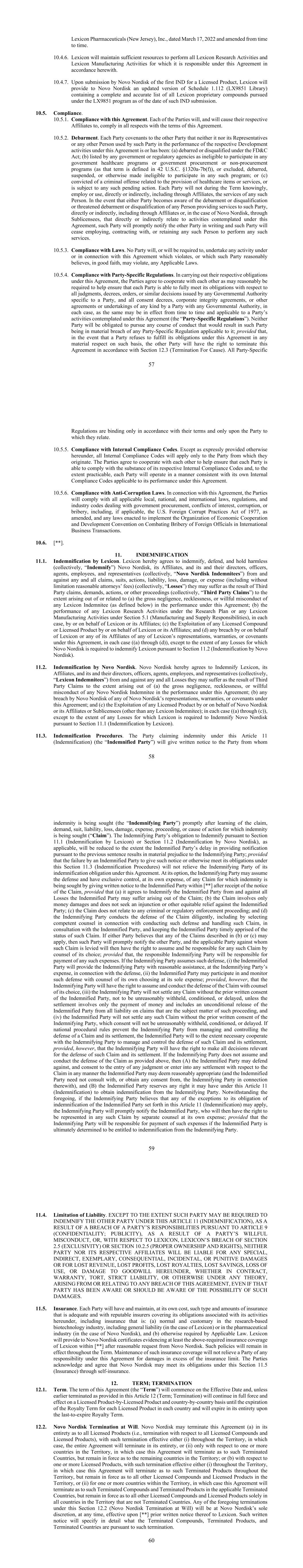 57 莱斯康制药(新泽西州)公司,日期为2022年3月17日,并不时修订。10.4.6.Lexicon将保持充足的资源,以根据本协议执行其负责的所有Lexicon研究活动和Lexicon制造活动。10.4.7.在诺和诺德提交许可产品的第一个IND后,Lexicon将向诺和诺德提供附表1.112的更新版本(LX9851库),其中包含截至该IND提交之日在LX9851计划下追求的所有Lexicon专有化合物的完整而准确的清单。10.5.合规。10.5.1.遵守本协议。每一方将并将促使其各自的附属机构在所有方面遵守本协议的条款。10.5.2.取消资格。每一缔约方均向另一缔约方承诺,其或其代表或该缔约方在执行本协议项下的相应开发活动时使用的任何其他人目前或已经:(a)根据FD & C法案被取消资格或取消资格;(b)被任何政府或监管机构列为没有资格参加任何政府医疗保健计划或政府采购或非采购计划(该术语在42 U.S.C. § 1320a-7b(f)中定义),或被排除、取消资格、暂停,或以其他方式使其没有资格参加任何此类计划;或(c)被判犯有与提供保健项目或服务有关的刑事犯罪,或受到任何此类未决诉讼的约束。每一方在任期内不会明知、直接或间接(包括通过关联公司)雇用或使用任何此类人员的服务。如果任何一方知悉直接或间接(包括通过关联公司)向该缔约方提供服务的任何人被取消资格或被取消资格或受到威胁被取消资格或被取消资格,或者就诺和诺德而言,通过分被许可人直接或间接与本协议项下所设想的活动有关,该缔约方将立即以书面通知另一方,该缔约方将停止雇用、与任何该等人签约或保留任何该等人以提供任何该等服务。10.5.3.遵守法律。任何一方都不会或将被要求根据本协议或与本协议有关的任何活动违反任何适用法律,或该一方出于善意合理地认为可能违反任何适用法律。10.5.4.遵守党的具体规定。在履行各自在本协定下的义务时,双方同意根据合理需要相互合作,以帮助确保每一方能够充分履行其对任何特定于一方的政府当局发布的所有判决、法令、命令或类似决定的义务,以及一方与任何政府当局的所有同意令、公司诚信协议或其他任何种类的协议或承诺,在每种情况下,因为这可能不时生效,并适用于一缔约方根据本协议(“特定缔约方条例”)所设想的活动。任何一方都没有义务采取任何会导致该缔约方严重违反适用于其的任何缔约方特定法规的行为过程;但前提是,如果一方在此基础上拒绝在任何重大方面履行其在本协议下的义务,另一方将有权根据第12.3节(因故终止)终止本协议。所有特定党派的58条规定仅根据其条款具有约束力,且仅对其所涉缔约方具有约束力。10.5.5.遵守内部合规守则。除本协议另有明确规定外,所有内部合规守则将仅适用于其来源的缔约方。双方同意相互合作,以帮助确保每一方能够遵守各自内部合规守则的实质内容,并在切实可行的范围内,每一方将按照适用于其在本协议下履行的各自内部合规守则的方式开展业务。10.5.6.遵守反腐败法律。就本协定而言,双方将遵守所有涉及政府采购、利益冲突、腐败或贿赂的适用的地方、国家和国际法律、法规和行业守则,如适用,包括经修订的1977年美国《反海外腐败法》,以及为实施《经济合作与发展组织关于打击国际商业交易中贿赂外国官员的公约》而颁布的任何法律。10.6.[**].11.赔偿11.1。Lexicon的赔偿。Lexicon特此同意对诺和诺德进行赔偿、辩护、无害(统称“赔偿”), 其关联公司、及其董事、高级职员、代理人、员工和代表(统称“诺和诺德受偿人”)因第三方索赔、要求、诉讼、责任、损失、损害或费用(包括但不限于合理的律师费)而可能遭受的任何和所有索赔、诉讼、诉讼或费用(统称“损失”)(统称“损失”),其可能因(a)重大过失、鲁莽、或任何Lexicon受偿人(定义见下文)在本协议项下的履行中的故意不当行为;(b)在每种情况下,由或代表Lexicon或其关联公司执行研究计划下的任何Lexicon研究活动或第5.1节(制造和供应责任)下的任何Lexicon制造活动;(c)Lexicon或其关联公司或代表Lexicon或其关联公司开发任何许可化合物或许可产品;以及(d)Lexicon或其任何关联公司或代表Lexicon或其任何关联公司违反本协议项下的任何陈述、保证或契诺,在每种情况下((a)至(d)),除非根据第11.2节(诺和诺德的赔偿)要求诺和诺德对Lexicon进行赔偿的任何损失。11.2.由诺和诺德进行赔偿。诺和诺德特此同意向Lexicon、其关联公司及其董事、高级职员、代理人、员工和代表(统称“Lexicon受偿人”)作出赔偿,使其免受因第三方索赔而可能遭受的任何和所有损失,其范围为(a)任何诺和诺德受偿人在本协议项下的履行中的重大过失、鲁莽行为或故意不当行为;(b)诺和诺德违反任何丨诺和诺德诺和诺德的陈述、保证,或本协议项下的契诺;及(c)由或代表诺和诺德或其关联公司或分被许可人(任何Lexicon受偿人除外)开发任何许可产品;在每种情况下((a)至(c)),除非Lexicon根据第11.1节(以Lexicon进行赔偿)被要求赔偿诺和诺德的任何损失。11.3.赔偿程序。根据第十一条主张赔偿的一方(赔偿)(“被赔偿方”),在知悉正在寻求赔偿的索赔、要求、诉讼、责任、损失、损害、费用、诉讼程序或诉讼因由(“索赔”)后,将立即以书面通知被要求赔偿的一方(“赔偿方”)。赔偿方根据第11.1节(以Lexicon进行赔偿)或第11.2节(由诺和诺德进行赔偿)(如适用)承担的赔偿义务,将减少至被赔偿方延迟根据前一句提供通