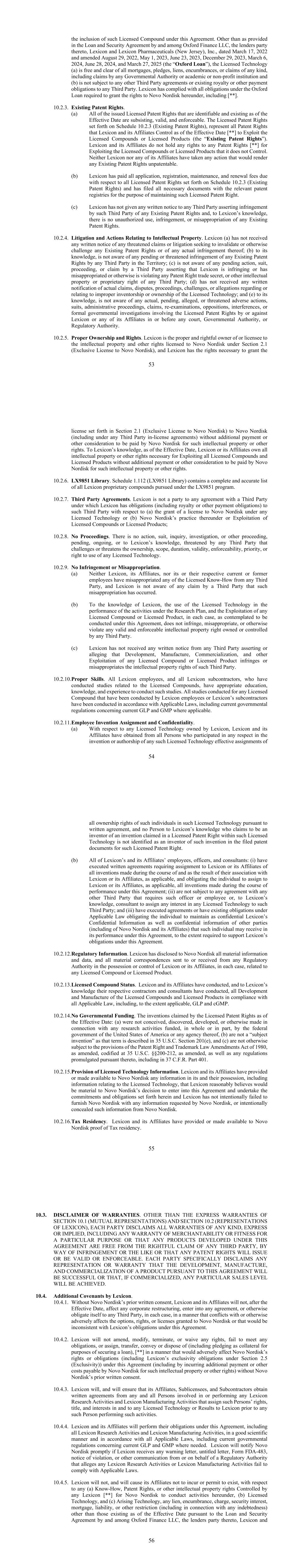 53在本协议下列入此类许可化合物。除Oxford Finance LLC、其贷款方Lexicon和莱斯康制药(New Jersey),Inc.于2022年3月17日订立并经修订并于2022年8月29日、2023年5月1日、2023年6月23日、2023年12月29日、2024年3月6日、2024年6月28日及2025年3月27日(“Oxford Loan”)的贷款和担保协议中规定的情况外,许可技术(a)不存在任何抵押、质押、留置权、产权负担或任何种类的债权,包括任何政府当局或学术或非营利机构的索赔,以及(b)不受任何其他第三方协议或现有特许权使用费或对任何第三方的其他付款义务的约束。Lexicon已遵守牛津贷款项下的所有义务,以授予诺和诺德在本协议下的权利,包括[**].10.2.3.现有专利权。(a)截至生效日期可识别和存在的所有已发行许可专利权均存续、有效和可执行。附表10.2.3所列的许可专利权(现有专利权),代表Lexicon及其附属公司截至生效日期控制的所有专利权[**]开发许可化合物或许可产品(“现有专利权”)。Lexicon及其附属公司不持有任何专利权的任何权利[**】用于开发其未控制的许可化合物或许可产品。Lexicon及其任何关联公司都没有采取任何将使任何现有专利权无法获得专利的行动。(b)Lexicon已就附表10.2.3(现有专利权)所列的所有许可专利权(现有专利权)支付了所有应支付的申请费、注册费、维持费和续约费,并已向相关专利登记处提交了所有必要的文件,以维护该许可专利权。(c)Lexicon没有向任何第三方发出任何书面通知,声称该第三方侵犯了任何现有专利权,并且据Lexicon所知,不存在未经授权使用、侵犯或盗用任何现有专利权的情况。10.2.4.与知识产权有关的诉讼和诉讼。Lexicon(a)没有收到任何书面通知,说明任何威胁索赔或诉讼试图使任何现有专利权无效或以其他方式对其提出质疑或任何实际侵犯;(b)据其所知,不知道领土内任何第三方对任何现有专利权的任何未决或威胁侵犯;(c)不知道任何第三方声称Lexicon侵犯或已经盗用或以其他方式侵犯任何专利权商业秘密的任何未决诉讼、诉讼、程序或索赔,或任何第三方的其他知识产权或所有权;(d)未收到关于或与许可技术的不当发明人或所有权有关的实际权利要求、争议、诉讼、质疑或指控的任何书面通知;(e)据其所知,不知道Lexicon或其任何关联公司在任何法院、政府当局或监管机构或在其面前对Lexicon或其任何关联公司提出或针对其提出的涉及许可专利权的任何实际、未决、指控或威胁的不利行动、诉讼、行政程序、索赔、复审、反对、干涉或正式政府调查。10.2.5.适当的所有权和权利。Lexicon是根据第2.1节(对诺和诺德的独家许可)向诺和诺德许可的知识产权和其他权利的适当和合法的所有者或被许可人,并且Lexicon有权向诺和诺德(包括根据任何第三方的许可协议)授予第2.1节中规定的54项许可(对诺和诺德的独家许可),而无需为此类知识产权或其他权利支付额外款项或诺和诺德支付的其他对价。据Lexicon所知,截至生效日期,Lexicon或其关联公司拥有开发所有许可化合物和许可产品所需的所有知识产权或其他权利,而无需诺和诺德就此类知识产权或其他权利支付额外款项或其他对价。10.2.6.LX9851库。附表1.112(LX9851库)包含LX9851计划下追求的所有Lexicon专有化合物的完整和准确的列表。10.2.7.第三方协议。Lexicon不是与第三方达成的任何协议的当事方,根据该协议,Lexicon就(a)根据任何许可技术向诺和诺德授予许可或(b)诺和诺德根据该协议的实践或开发许可化合物或许可产品向该第三方承担义务(包括特许权使用费或其他付款义务);10.2.8。没有诉讼程序。不存在任何诉讼、诉讼、询问、调查或其他程序,未决、正在进行中或Lexicon所知, 受到质疑或威胁任何许可技术的所有权、范围、期限、有效性、可执行性、优先权或使用权的任何第三方的威胁。10.2.9.无侵权、盗用行为。(a)Lexicon、其附属公司或其各自的现任或前任雇员均未从任何第三方盗用任何许可专有技术,且Lexicon不知道任何第三方声称已发生此类盗用。(b)据Lexicon所知,在执行研究计划下的活动时使用许可技术,以及开发任何许可化合物或许可产品,在每种情况下,按照本协议的设想进行,均不侵犯、挪用或以其他方式侵犯任何第三方拥有或控制的任何有效和可执行的知识产权。(c)Lexicon没有收到任何第三方声称或指控任何许可化合物或许可产品的开发、制造、商业化和其他开发侵犯或盗用该第三方知识产权的任何书面通知。10.2.10.适当的技能。所有Lexicon员工,以及所有Lexicon分包商,凡进行过与许可化合物相关的研究,都有适当的教育、知识和经验来进行此类研究。Lexicon员工或Lexicon的分包商针对任何许可化合物进行的所有研究均已根据适用法律进行,包括适用时有关当前GLP和GMP的现行政府法规。10.2.11.员工发明分配与保密。(a)就Lexicon拥有的任何许可技术而言,Lexicon及其附属公司已根据书面协议从参与任何此类许可技术的发明或作者的有效转让的任何方面的所有人处获得此类个人在此类许可技术上的所有所有权权利,并且Lexicon所知的任何声称是此类许可技术内的许可专利权中所主张的发明的发明人的人均未在此类许可专利权的已提交专利文件中被确定为此类发明的发明人。(b)Lexicon及其附属公司的所有雇员、高级职员和顾问:(i)已签署书面协议,要求将在与Lexicon或其附属公司(如适用)的关联过程中和因其关联而做出的所有发明转让