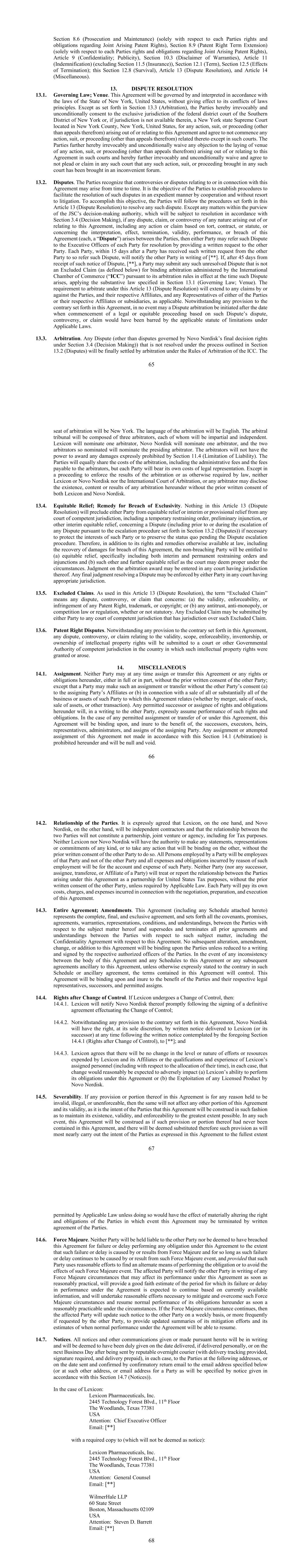 65第8.6节(起诉和维持)(仅涉及各方关于共同产生的专利权的权利和义务)、第8.9节(专利权期限延长)(仅涉及各方关于共同产生的专利权的权利和义务)、第9条(保密;公示)、第10.3节(解除保证)、第11条(赔偿)(不包括第11.5节(保险))、第12.1节(期限)、第12.5节(终止的影响);本第12.8节(存续)、第13条(争议解决)、第14条(杂项)。13.争议决议13.1。管辖法律;地点。本协定将受美国纽约州法律管辖并按其解释,但不会使其法律冲突原则生效。除第13.3节(仲裁)中规定的情况外,双方在此不可撤销地无条件同意纽约南区联邦地区法院的专属管辖权,如果其中没有管辖权,则同意位于美国纽约州纽约县的纽约州最高法院对因本协议引起或与本协议有关的任何诉讼、诉讼或程序(上诉除外)的专属管辖权,并同意不在此类法院启动与此相关的任何诉讼、诉讼或程序(上诉除外)。双方在此进一步不可撤销和无条件地放弃对在此类法院就本协议引起或与之有关的任何诉讼、诉讼或程序(上诉除外)设置地点的任何异议,并在此进一步不可撤销和无条件地放弃并同意不在任何此类法院就在任何此类法院提起的任何此类诉讼、诉讼或程序已在不方便的法院提起的任何此类诉讼、诉讼或程序进行辩护或主张。13.2.纠纷。双方承认,与本协议有关或与本协议有关的争议或争议可能不时出现。双方的目标是建立程序,以便利通过合作和不诉诸诉讼的方式以权宜的方式解决这类争端。为实现这一目标,双方将遵循本第13条(争议解决)规定的程序解决任何此类争议。除JSC决策权限范围内的任何事项(将根据第3.4节(决策)予以解决)外,如果双方之间出现由本协议引起或与本协议有关的任何性质的任何争议、索赔或争议,包括基于侵权、合同或法规的任何诉讼或索赔,或关于本协议的解释、效力、终止、有效性、履行或违反(各自称为“争议”),则任何一方均可通过向另一方提供书面请求的方式将此类争议提交给每一方的执行官解决。每一缔约方在一缔约方收到另一缔约方提出的将此种争议如此提交的书面请求后15天内,将以书面形式通知另一缔约方[**].如自收到该争议通知之日起45天后,【**],一方当事人可根据国际商会(“ICC”)根据产生此类争议时有效的仲裁规则,适用第13.1节(管辖法律;地点)中规定的实体法,将任何此类未解决的争议提交国际商会(“ICC”)根据其仲裁规则管理的具有约束力的仲裁(定义见下文)。根据第13条(争议解决)进行仲裁的要求将适用于由双方及其各自的关联公司提出或针对双方提出的任何索赔,以及双方或其各自的关联公司或子公司的任何代表(如适用)。尽管本协议中有任何相反的规定,但在任何情况下,不得在基于此种争议的争议、争议或索赔的法律或衡平法程序启动之日之后提起争议仲裁,该诉讼程序本应根据适用法律的适用诉讼时效予以禁止。13.3.仲裁。任何未按照第13.2节(争议)中概述的程序解决的争议(第3.4节(决策)下由诺和诺德的最终决定权管辖的争议除外),将根据国际商会的仲裁规则通过仲裁最终解决。仲裁的66个席位将是纽约。仲裁的语言将是英语。仲裁庭将由三名仲裁员组成,每名仲裁员将保持公正和独立。Lexicon将提名1名仲裁员,诺和诺德将提名1名仲裁员,并由如此提名的2名仲裁员提名主审仲裁员。仲裁员将无权裁决第11.4节(责任限制)明确禁止的任何损害赔偿。双方将平等分担仲裁费用, 包括行政管理费用和应付仲裁员的费用,但法律代理费用各承担一方。除在强制执行仲裁结果的程序中或法律另有规定外,未经Lexicon和诺和诺德双方事先书面同意,Lexicon或诺和诺德以及国际仲裁法院或任何仲裁员均不得披露本协议项下任何仲裁的存在、内容或结果。13.4.公平救济;违反排他性的补救措施。第13条(争议解决)中的任何规定均不排除任何一方在必要时从任何有管辖权的法院获得衡平法救济或临时或临时救济,包括关于争议的临时限制令、初步强制令或其他临时衡平法救济(包括在根据第13.2节(争议)中规定的升级程序的任何争议升级之前或期间),以保护该缔约方的利益或在争议升级程序之前维持现状。因此,除了其在法律上可获得的权利和补救措施,包括因违反本协议而追回损害赔偿外,非违约方将有权获得(a)衡平法救济,具体包括临时和永久限制令和禁令,以及(b)法院在当时情况下可能认为适当的其他和进一步的衡平法救济。对仲裁裁决的判决,可以在有其管辖权的任何法院作出。解决争议的任何最终判决可由任何一方在任何具有适当管辖权的法院执行。13.5.不包括索赔。本条第13条(争议解决)所称的“排除权利要求”是指涉及以下方面的任何争议、争议或主张:(a)任何专利权、商标或著作权的有效性、可执行性或侵权;或(b)任何反垄断、反垄断或竞争法或法规,无论是否法定。任何被排除的索赔可由任何一方向对此种被排除的索赔具有管辖权的任何有管辖权的法院提出。13.6.专利权纠纷。尽管本协议中有任何相反的规定,但与知识产权的有效性、范围、可执行性、发明人或所有权有关的任何争议、争议或主张将提交给授予或产生此类知识产权的国家的法院或具有主管管辖权的其他政府当局。14.杂项14.1。作业。未经另一方事先书面同意,任何一方均不得在任何时候全部或部分转让或转让本协议或本协议项下的任何权利或义务;但一方可在未经另一方