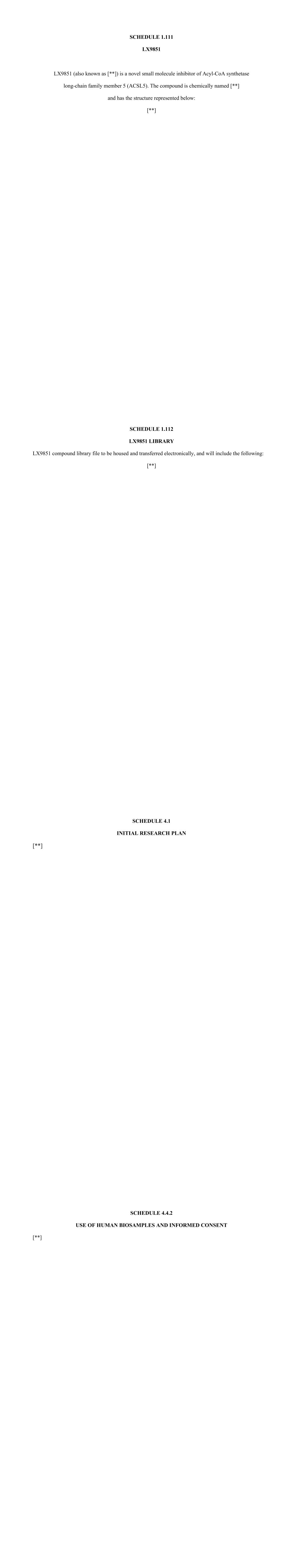 附表1.11 1 LX9851 LX9851(又名[**])是一种新型的酰基辅酶A合成酶长链家族成员5(ACSL5)小分子抑制剂。该化合物化学命名为[**],并具有如下所示的结构:[**】附表1.112 LX9851库LX9851复合库文件将以电子方式存放和传输,并将包括以下内容:[**]附表4.1初步研究计划[**]附表4.4.2人类生物样本的使用和知情同意[**]