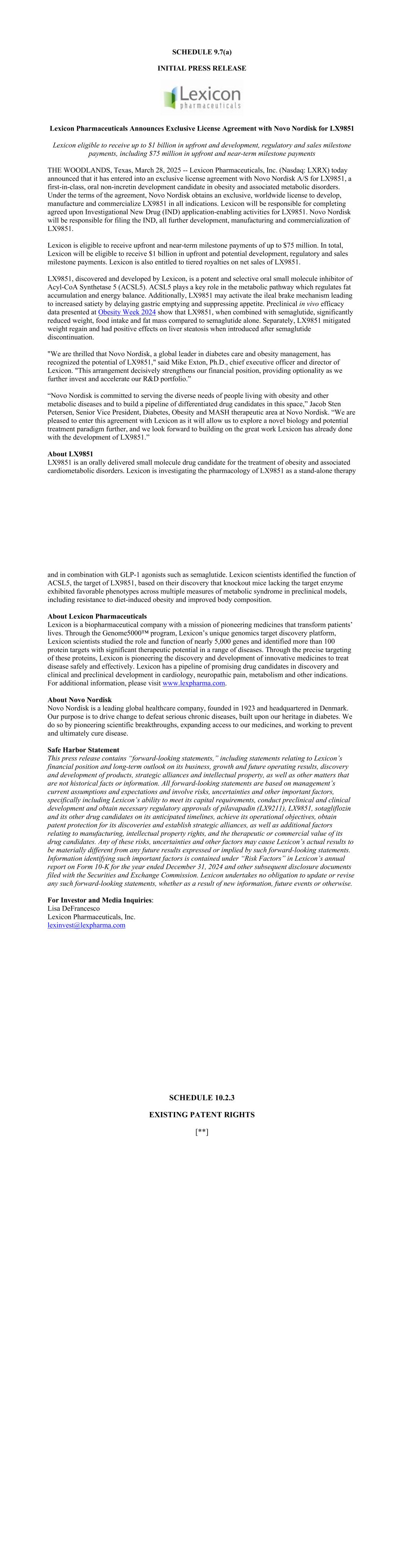 附表9.7(a)初步新闻稿莱斯康制药宣布与诺和诺德就LX9851达成独家许可协议Lexicon有资格获得高达10亿美元的预付款以及开发、监管和销售里程碑付款,其中包括7500万美元的预付款和近期里程碑付款,德克萨斯州伍德兰兹市,2025年3月28日--Lexicon Pharmaceuticals, Inc.丨TERM2(丨纳斯达克纳斯达克:LXRX)今天宣布,该公司已与Novo Nordisk A/S就LX9851达成独家许可协议,LX9851是一种用于肥胖和相关代谢紊乱的一流口服非肠促胰岛素开发候选药物。根据协议条款,诺和诺德获得在所有适应症中开发、制造和商业化LX9851的全球独家许可。Lexicon将负责完成LX9851商定的研究性新药(IND)申请授权活动。诺和诺德将负责LX9851的IND备案、所有进一步的开发、制造和商业化。Lexicon有资格获得高达7500万美元的前期和近期里程碑付款。总的来说,Lexicon将有资格获得10亿美元的前期和潜在开发、监管和销售里程碑付款。Lexicon还有权获得LX9851净销售额的分级版税。LX9851由Lexicon发现和开发,是一种有效的选择性口服酰基辅酶A合成酶5(ACSL5)小分子抑制剂。ACSL5在调节脂肪积累和能量平衡的代谢途径中起着关键作用。此外,LX9851可能会通过延缓胃排空和抑制食欲来激活回肠制动机制,从而导致饱腹感增加。在肥胖周2024上展示的临床前体内功效数据显示,LX9851与索马鲁肽联合使用时,与单独使用索马鲁肽相比,显着降低了体重、食物摄入量和脂肪量。另外,LX9851在停用索马鲁肽后引入,可减轻体重恢复,并对肝脏脂肪变性有积极影响。“我们很高兴诺和诺德,糖尿病护理和肥胖管理领域的全球领导者,认识到了LX9851的潜力,”Lexicon首席执行官兼董事Mike Exton博士表示。“这种安排决定性地加强了我们的财务状况,在我们进一步投资和加速我们的研发组合时提供了可选性。”“诺和诺德致力于服务于肥胖和其他代谢性疾病患者的多样化需求,并在这一领域构建差异化候选药物管道,”丨诺和诺德诺和诺德糖尿病、肥胖和MASH治疗领域高级副总裁Jacob Sten Petersen。“我们很高兴与Lexicon达成这项协议,因为这将使我们能够进一步探索一种新的生物学和潜在的治疗范式,我们期待着在Lexicon在开发LX9851方面已经完成的伟大工作的基础上再接再厉。”关于LX9851 LX9851是一种口服小分子候选药物,用于治疗肥胖症和相关的心脏代谢紊乱。Lexicon正在研究LX9851作为独立疗法并与Semaglutide等GLP-1激动剂联合使用的药理学。Lexicon科学家确定了LX9851的靶点ACSL5的功能,这是基于他们的发现,即在临床前模型中,缺乏靶点酶的敲除小鼠在代谢综合征的多个测量中表现出有利的表型,包括对饮食引起的肥胖的抵抗力和改善的身体成分。关于莱斯康制药 Lexicon是一家生物制药公司,其使命是开创能够改变患者生活的药物。通过Genome5000™程序,Lexicon独有的基因组学靶点发现平台,Lexicon科学家研究了近5000个基因的作用和功能,确定了100多个在一系列疾病中具有显著治疗潜力的蛋白质靶点。通过对这些蛋白质的精准靶向,Lexicon正在开创性地发现和开发创新药物,以安全有效地治疗疾病。Lexicon在心脏病学、神经性疼痛、新陈代谢和其他适应症的发现以及临床和临床前开发方面拥有一系列有前景的候选药物。欲了解更多信息,请访问www.lexpharma.com。关于诺和诺德诺和诺德是一家全球领先的医疗保健公司,成立于1923年,总部位于丹麦。我们的目标是推动变革,以战胜严重的慢性疾病,建立在我们在糖尿病领域的传统之上。我们这样做是通过开创性的科学突破,扩大我们的药物的可及性,并致力于预防并最终治愈疾病。安全港声明这份新闻稿包含“前瞻性声明”,包括与Lexicon的财务状况和对其业务的长期展望、增长和未来经营业绩、产品的发现和开发、战略联盟和知识产权相关的声明, 以及其他非历史事实或信息的事项。所有前瞻性陈述均基于管理层当前的假设和预期,涉及风险、不确定性和其他重要因素,具体包括Lexicon满足其资本要求、进行临床前和临床开发以及在其预期时间内获得pilavapadin(LX9211)、LX9851、sotagliflozin和其他候选药物的必要监管批准、实现其运营目标、为其发现获得专利保护和建立战略联盟的能力,以及与制造、知识产权以及候选药物的治疗或商业价值相关的其他因素。任何这些风险、不确定性和其他因素都可能导致Lexicon的实际结果与此类前瞻性陈述明示或暗示的任何未来结果存在重大差异。识别这些重要因素的信息包含在Lexicon截至2024年12月31日止年度的10-K表格年度报告以及随后提交给美国证券交易委员会的其他披露文件的“风险因素”下。Lexicon不承担更新或修改任何此类前瞻性陈述的义务,无论是由于新信息、未来事件或其他原因。投资者及媒体查询:Lisa DeFrancesco 莱斯康制药,Inc. lexinvest@lexpharma.com附表10.2.3现有专利权【**]