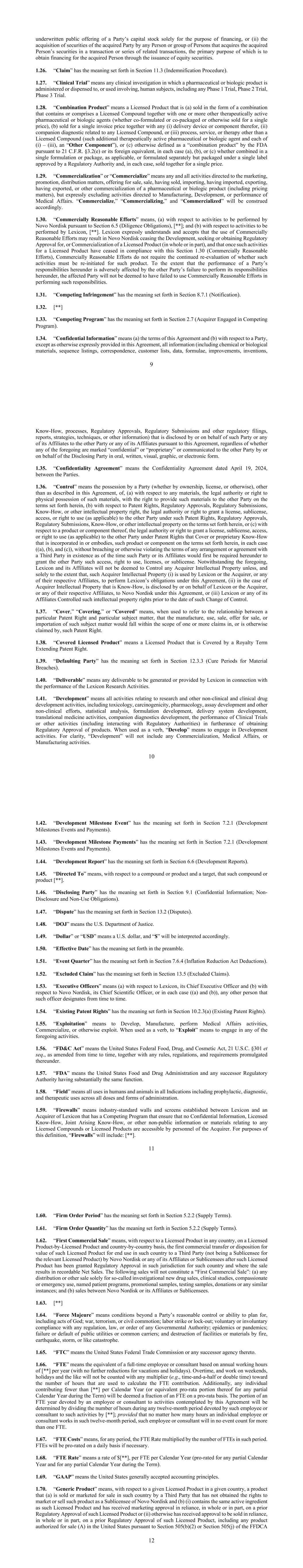 9仅以融资为目的承销公开发行一方股本,或(ii)在交易或一系列相关交易中收购被收购人证券的任何个人或群体收购被收购方的证券,其主要目的是通过发行股本证券为被收购人获得融资。1.26.“索赔”具有第11.3节(赔偿程序)中规定的含义。1.27.“临床试验”是指药物或生物制品被施用或分配给人类受试者或使用涉及人类受试者的任何临床调查,包括任何1期试验、2期试验、3期试验。1.28.“组合产品”是指(a)以包含或包含一种或多种其他具有治疗活性的药物或生物制剂(无论是共同配制或共同包装或以其他方式以单一价格出售)的组合形式出售的许可产品,(b)以单一发票价格连同任何(i)其所涉及的交付装置或组件一起出售,(ii)与任何许可化合物相关的伴随诊断,或(iii)除许可化合物之外的工艺、服务或疗法(该等额外的具有治疗活性的药物或生物制剂以及(i)–(iii)中的每一种,“其他成分”),或(c)FDA根据21 C.F.R. § 3.2(e)或其外国等同产品另有定义为“组合产品”,在每种情况下(a)、(b)或(c)是否合并在适用的单一配方或包装中,或单独配制但根据监管机构批准的单一标签包装,并在每种情况下以单一价格一起销售。1.29.“商业化”或“商业化”是指针对医药或生物产品的营销、推广、分销事项、要约销售、销售、已销售、进口、已进口、已出口、已出口或其他商业化(包括定价事项)的任何和所有活动,但明确不包括针对制造、开发或履行医疗事务的活动。“商业化”、“商业化”、“商业化”将作相应解释。1.30.“商业上合理的努力”是指,(a)就诺和诺德根据第6.5节(勤勉义务)将进行的活动而言,[**];及(b)就将由Lexicon进行的活动而言,[**].Lexicon明确理解并接受,使用商业上合理的努力可能导致诺和诺德(全部或部分)停止开发、寻求或获得许可产品的监管批准或商业化,并且一旦针对许可产品的此类活动已根据本条1.30(商业上合理的努力)的规定停止,商业上合理的努力不需要继续重新评估是否必须针对该产品重新启动此类活动。如果一方履行本协议项下的责任因另一方未履行本协议项下的责任而受到不利影响,则不认为受影响方未在履行该责任时使用商业上合理的努力。1.31.“竞争性侵权”具有第8.7.1节(通知)中规定的含义。1.32.[**] 1.33.“竞合计划”具有第2.7节(收购方从事竞合计划)中规定的含义。1.34.“机密信息”是指(a)本协议的条款和(b)除本协议另有明确规定外,由该缔约方或其任何关联公司或其任何关联公司根据本协议披露或代表该缔约方或另一缔约方或其任何关联公司披露的所有信息(包括化学或生物材料、序列清单、通信、客户名单、数据、配方、改进、发明、10项专有技术、工艺、监管批准、监管提交和其他监管备案、报告、战略、技术或其他信息),无论上述任何内容是否被标记为“机密”或“专有”,或由披露方或代表披露方以口头、书面、视觉、图形或电子形式传达给另一方。1.35.“保密协议”是指双方于2024年4月19日签署的保密协议。1.36.“控制”是指除本协议所述外,一方当事人(无论是通过所有权、许可或其他方式)拥有,(a)就任何材料而言,实际拥有此类材料的合法权威或权利,并有权按照本协议规定的条款向另一方提供此类材料,(b)就专利权、监管批准、监管提交、专有技术或其他知识产权而言,授予 根据本协议规定的条款根据此类专利权、监管批准、监管提交、专有技术或其他知识产权向另一方再许可、访问或使用权(如适用),或(c)就产品或其组件而言,根据专利权向另一方授予许可、再许可、访问或使用权(如适用)的法律授权或权利,该专利权涵盖或专有专有技术,该专利技术根据本协议规定的条款并入或体现于此类产品或组件,在每种情况下((a)、(b)和(c),在不违反或以其他方式违反与第三方的任何安排或协议的条款的情况下,该第三方或其关联公司将根据本协议首先被要求授予另一方此类访问权限、使用权、许可或再许可。尽管有上述规定,Lexicon及其关联公司将不被视为控制任何收购方的知识产权,除非且仅限于此类收购方知识产权(i)被Lexicon或收购方或其各自的任何关联公司用于履行Lexicon在本协议下的义务,(ii)在收购方知识产权为Know-How的情况下,由Lexicon或收购方或其各自的任何关联公司或其代表根据本协议向诺和诺德披露,或(iii)Lexicon或其任何关联公司在此类控制权变更日期之前控制了此类知识产权。1.37.“覆盖”、“覆盖”或“覆盖”是指,当用于指特定专利权与特定标的物之间的关系时,该标的物的制造、使用、销售、要约销售或进口将属于该专利权中的一项或多项权利要求的范围,或以其他方式由其主张。1.38.“涵盖许可产品”是指具有延长专利权的特许权使用费条款涵盖的许可产品。1.39.“违约方”具有第12.3.3节(重大违约的治愈期)中规定的含义。1.40.“可交付”是指Lexicon将生成或提供的与Lexicon研究活动表现相关的任何可交付成果。1.41.“开发”是指与研究和其他非临床和临床药物开发活动有关的所有活动,包括毒理学、致癌性、药理学、化验开发和其他非临床努力、统计分析、制剂开发、递送系统开发、转化医学活动、伴随诊断开发、临床试验的表现或其他活动(包括与监管部门的互动),以促进产品获得监管批准。“发展”作为动词,是指从事发展活动。为明确起见,“发展”将不包括任何商业化、